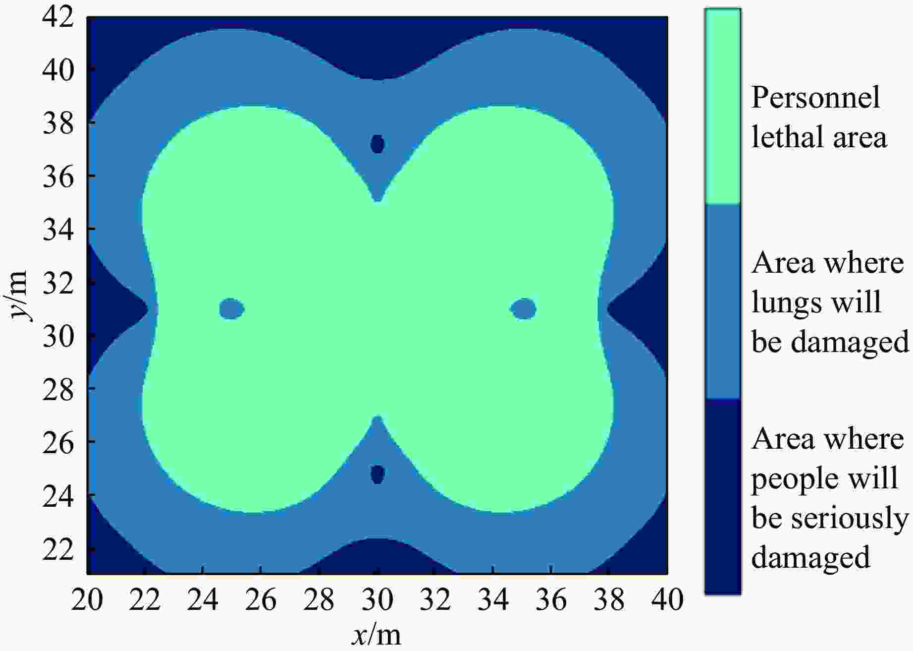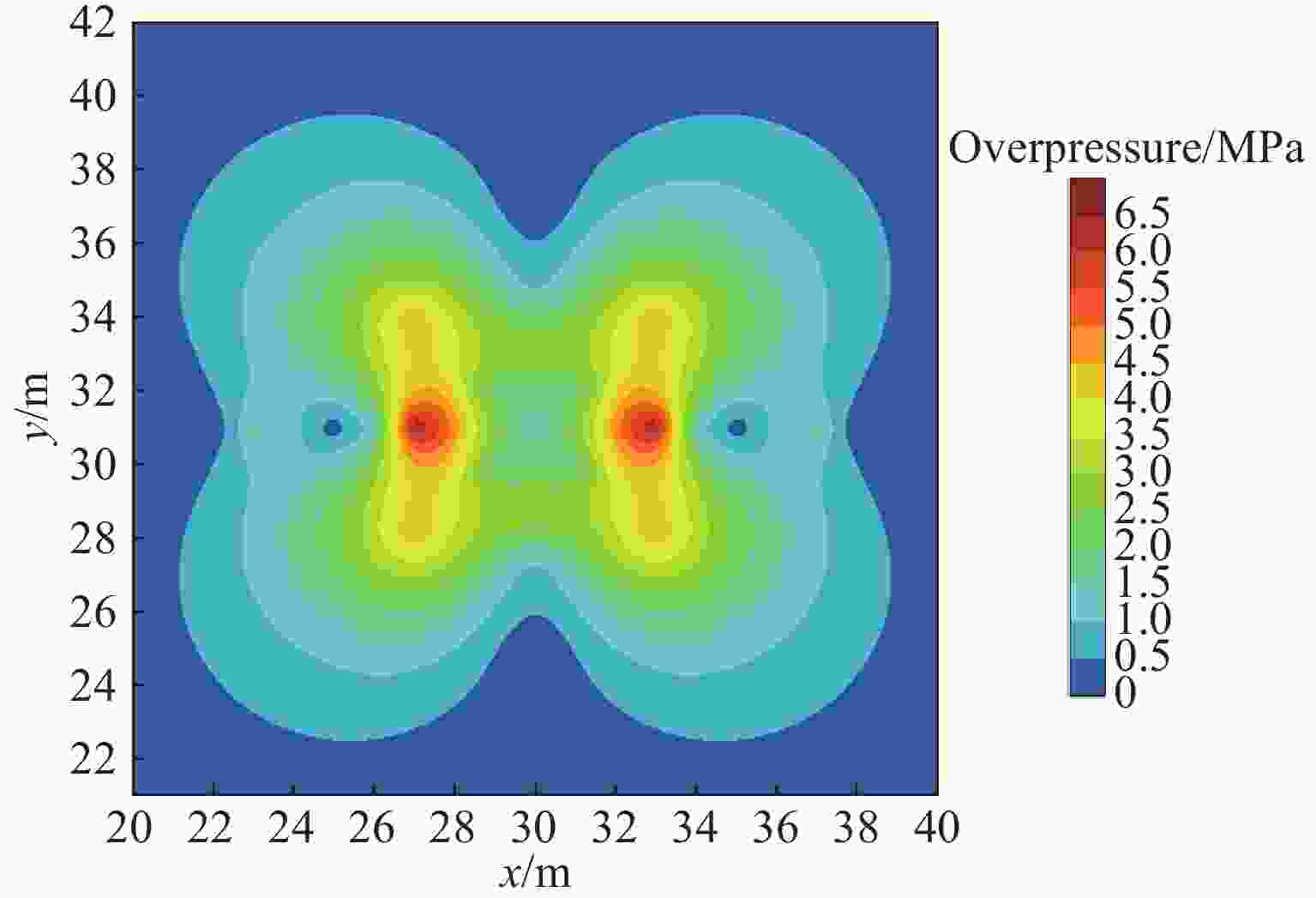 $\,\rho $0/(kg·m–3) e0/(GJ·m–3) pCJ/GPa $\gamma $ DJ/(m·s–1) 1500 7.0 21 2.727 6930 AJWL/GPa BJWL/GPa R1 R2 $\omega $ 371.2 3.23 4.15 0.95 0.30 表 5 超压模拟结果与经验公式计算结果对比