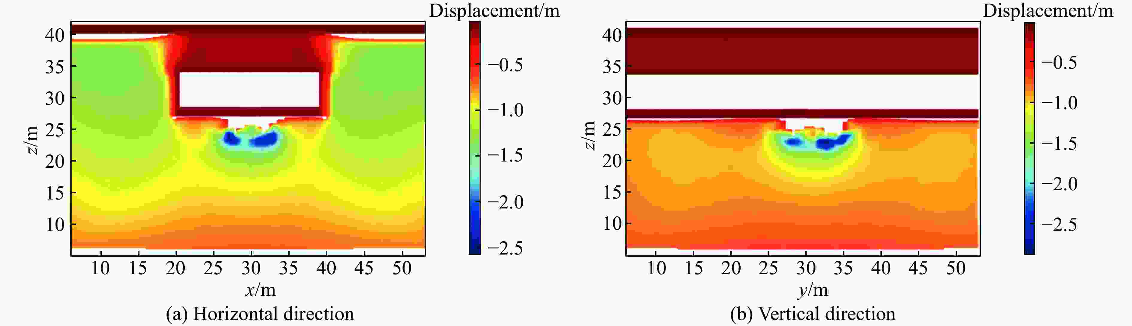 $\,\rho $/(kg·m–3) E/GPa $\nu $ $q{_{\phi}}$/(°) $K{_{\phi}}$ $q{_{\varPsi} }$/(°) $\sigma $t/kPa vp/(m·s−1) vs/(m·s−1) 1850 0.04 0.35 0.388 11171 0 0.1 185 89 表 3 空气(空模型)的物理力学参数