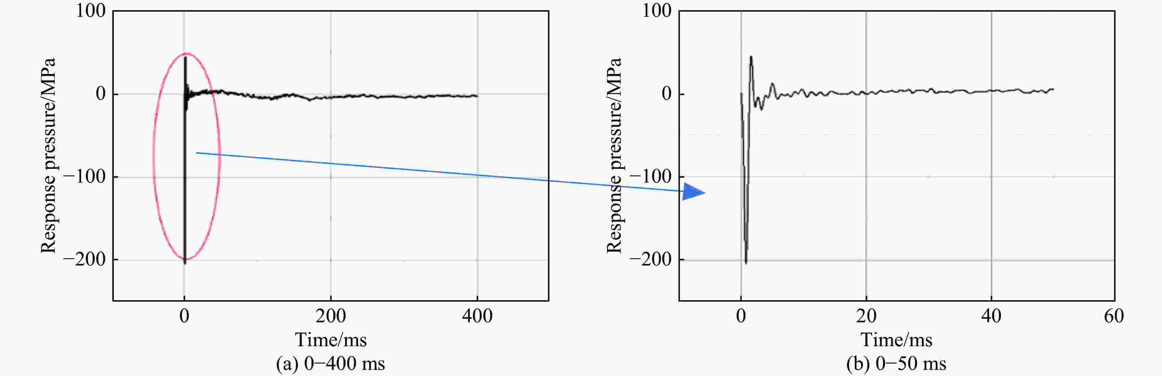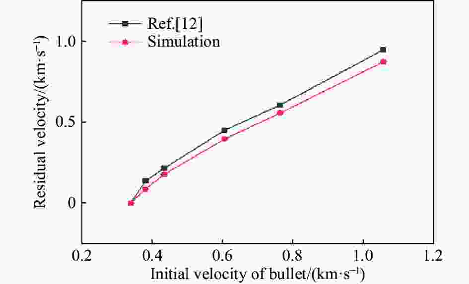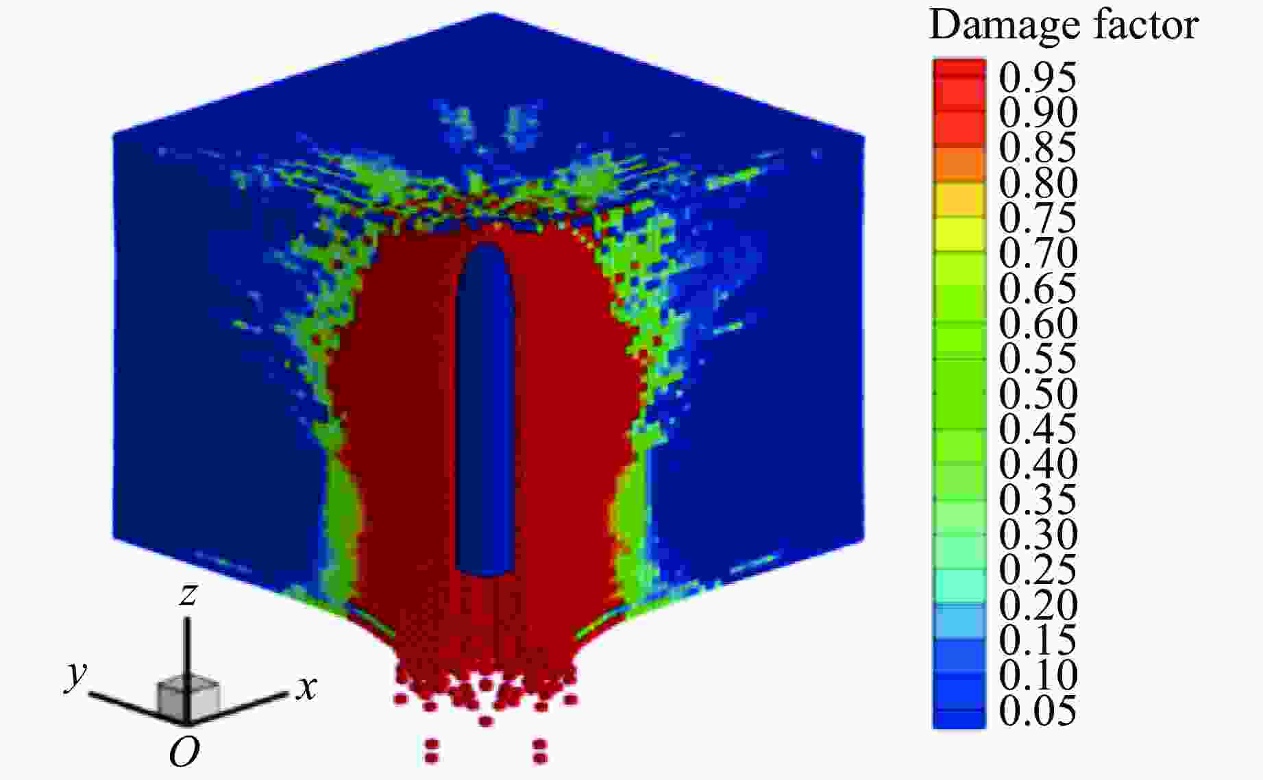 $\,\rho $/(kg·m–3) E/GPa $\nu $ ${ f{'_ {\rm{c} } } }$/MPa Smax A B N C $\varepsilon {_{\min }^{\rm f} }$ 2439 32.5 0.2 48 7.0 0.79 1.6 0.61 0.007 0.01 pcrush/GPa plock/GPa D1 D2 K1/GPa K2/GPa K3/GPa vp/(m·s−1) vs/(m·s−1) 0.016 0.8 0.04 1 85 −171 208 3872 2375 表 2 围岩的物理力学参数