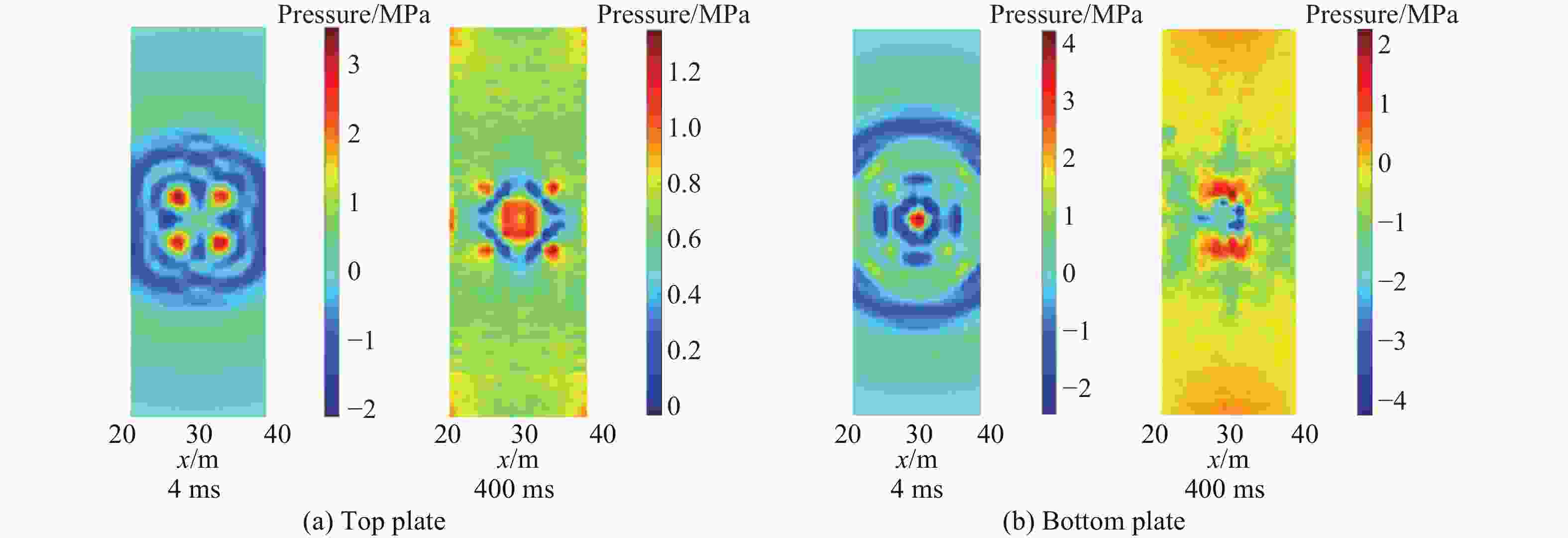 Table 6. Comparison of various parameters under the solid explosion in the pillared and non-pillared areas of the platform