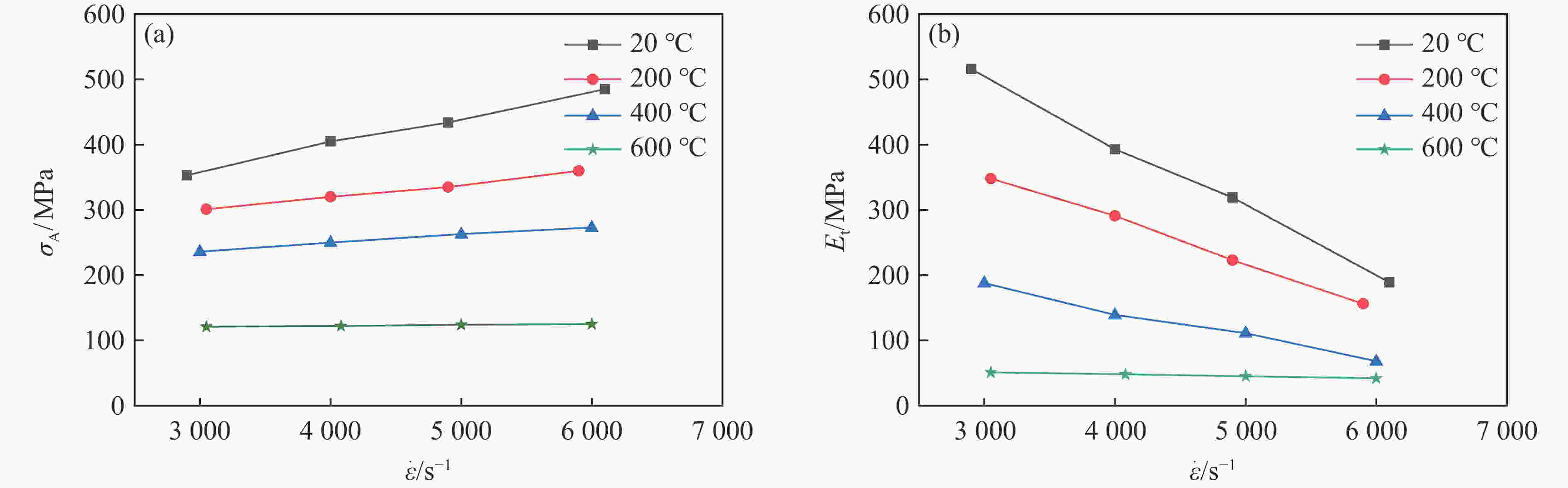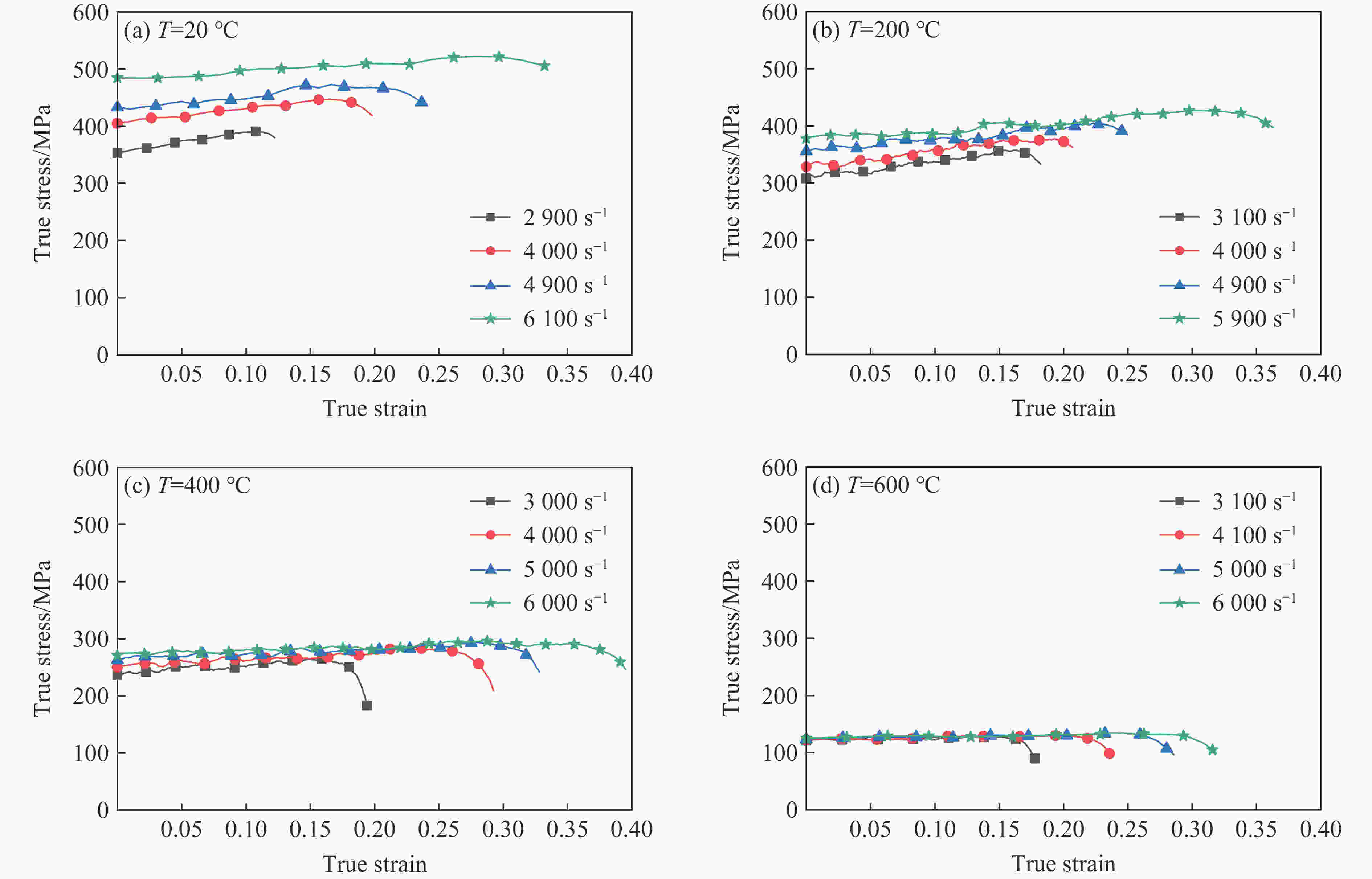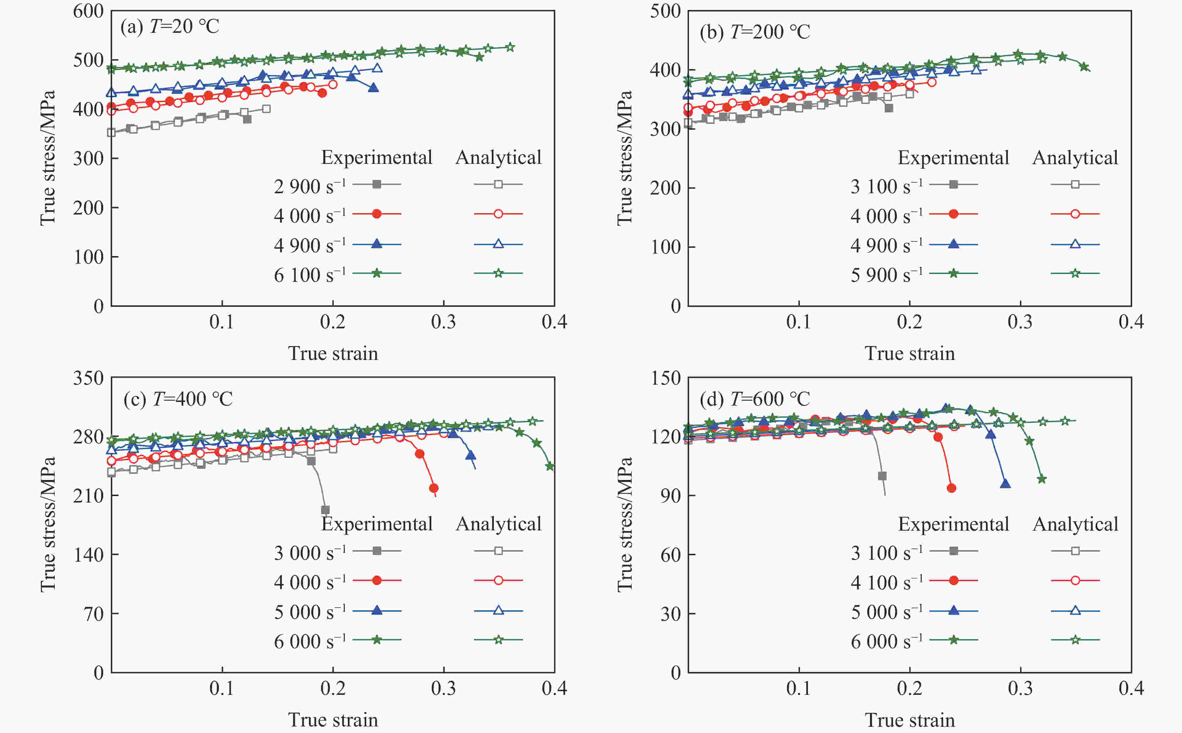 摘要: 采用分离式霍普金森压杆系统和高温设备对ZL101A铝合金进行了常温和高温下的动态压缩实验,得到了应变率范围为2900~6100 s−1、温度范围为20~600 ℃的动态压缩应力-应变曲线。实验结果表明:ZL101A铝合金具有应变率硬化效应,并且随着温度的升高,应变率硬化效应减弱;ZL101A铝合金在不同应变率下均存在明显的温度软化效应,且随着温度的升高,塑性变形引起的绝热温升使热软化作用增强。为了得到应变率和温度对材料流变应力的影响,将应变率效应和温度效应进行解耦,得到一种适用于ZL101A铝合金材料的动态本构模型。对比模型预测结果与实验数据发现,建立的本构模型可以很好地描述ZL101A铝合金的流变应力特征。Abstract: The dynamic compression experiments of ZL101A aluminum alloy were carried out under room and high temperature conditions by using split Hopkinson pressure bar (SHPB) system and high temperature heating equipment. The dynamic compressive stress-strain curves under the conditions of strain rate range of 2900−6100 s−1 and temperature range of 20−600 ℃ were obtained. The experimental results show that ZL101A aluminum alloy has a strain rate hardening effect, and the strain rate hardening effect gradually decreases with the increase of temperature. Meanwhile, ZL101A aluminum alloy has obvious temperature softening effect at different strain rates, and the plastic deformation induced adiabatic temperature rise enhances the thermal softening effect. In order to quantify the influences of strain rate and temperature on the flow stress of ZL101A aluminum alloy, the strain rate effect and the temperature effect were decoupled. A suitable constitutive model for ZL101A aluminum alloy was established by analyzing and fitting the experimental data. After comparing the predicted results from the model with the experimental data, it was found that the established constitutive model can well describe the flow stress characteristics of ZL101A aluminum alloy.