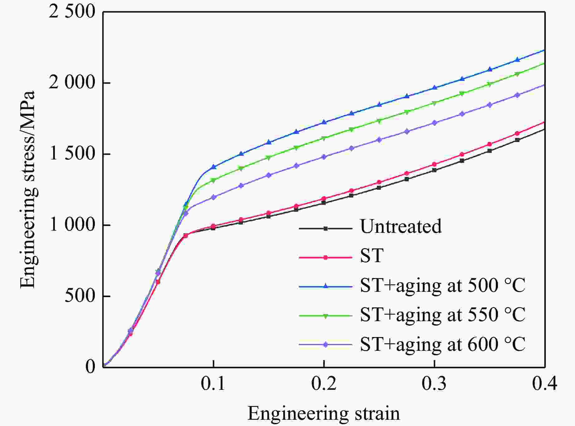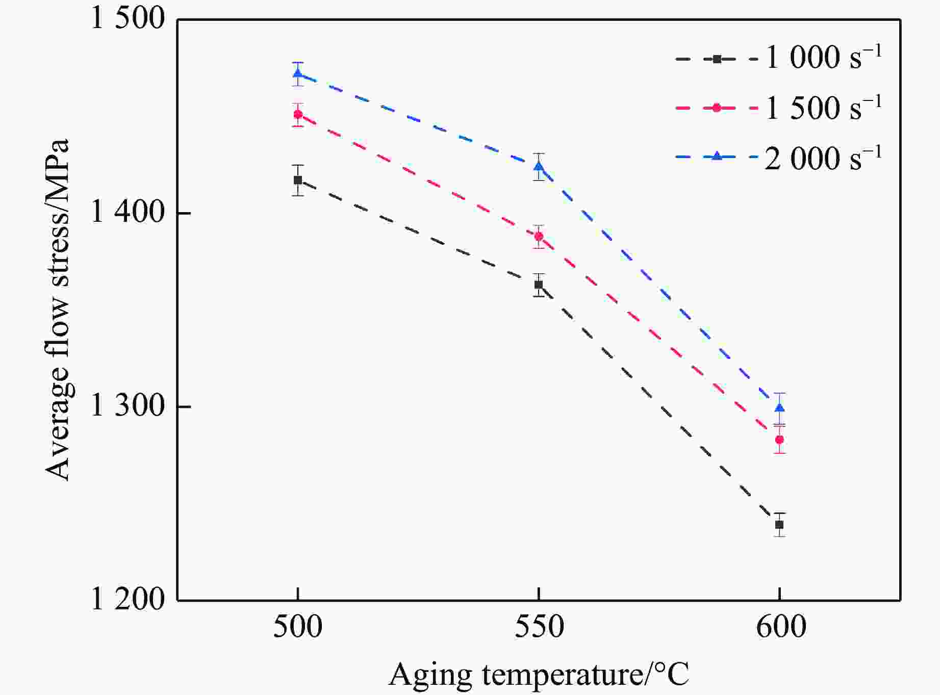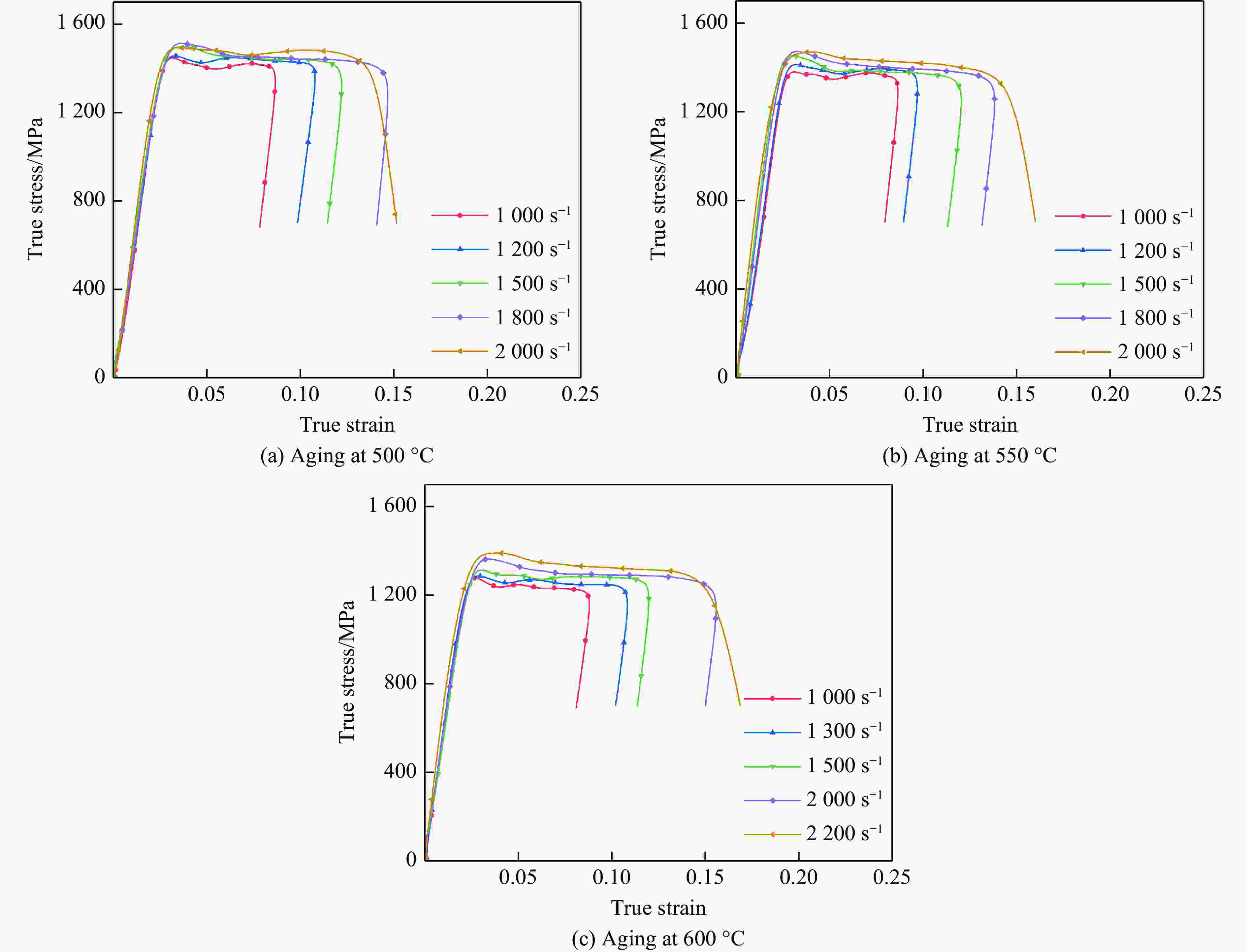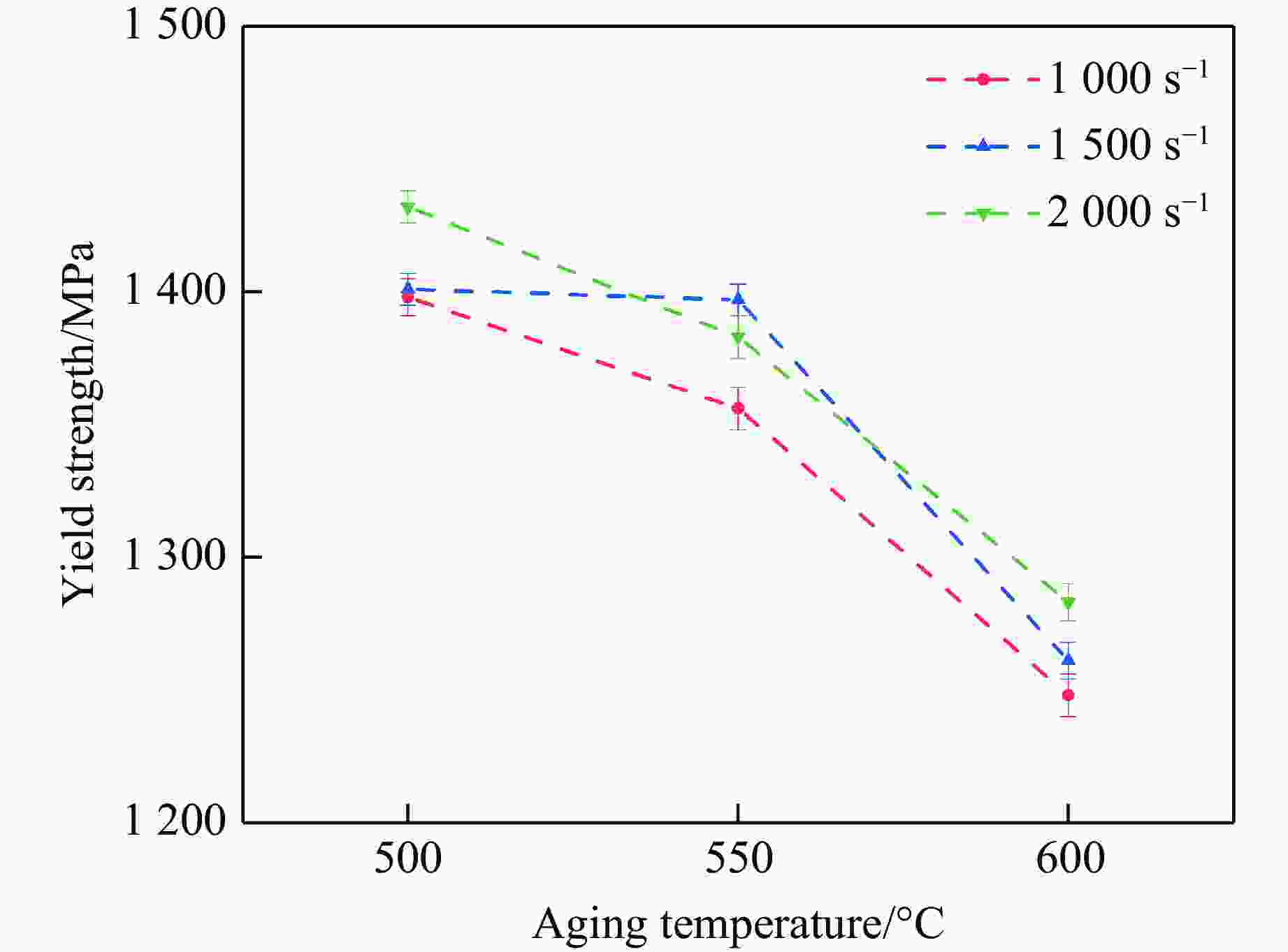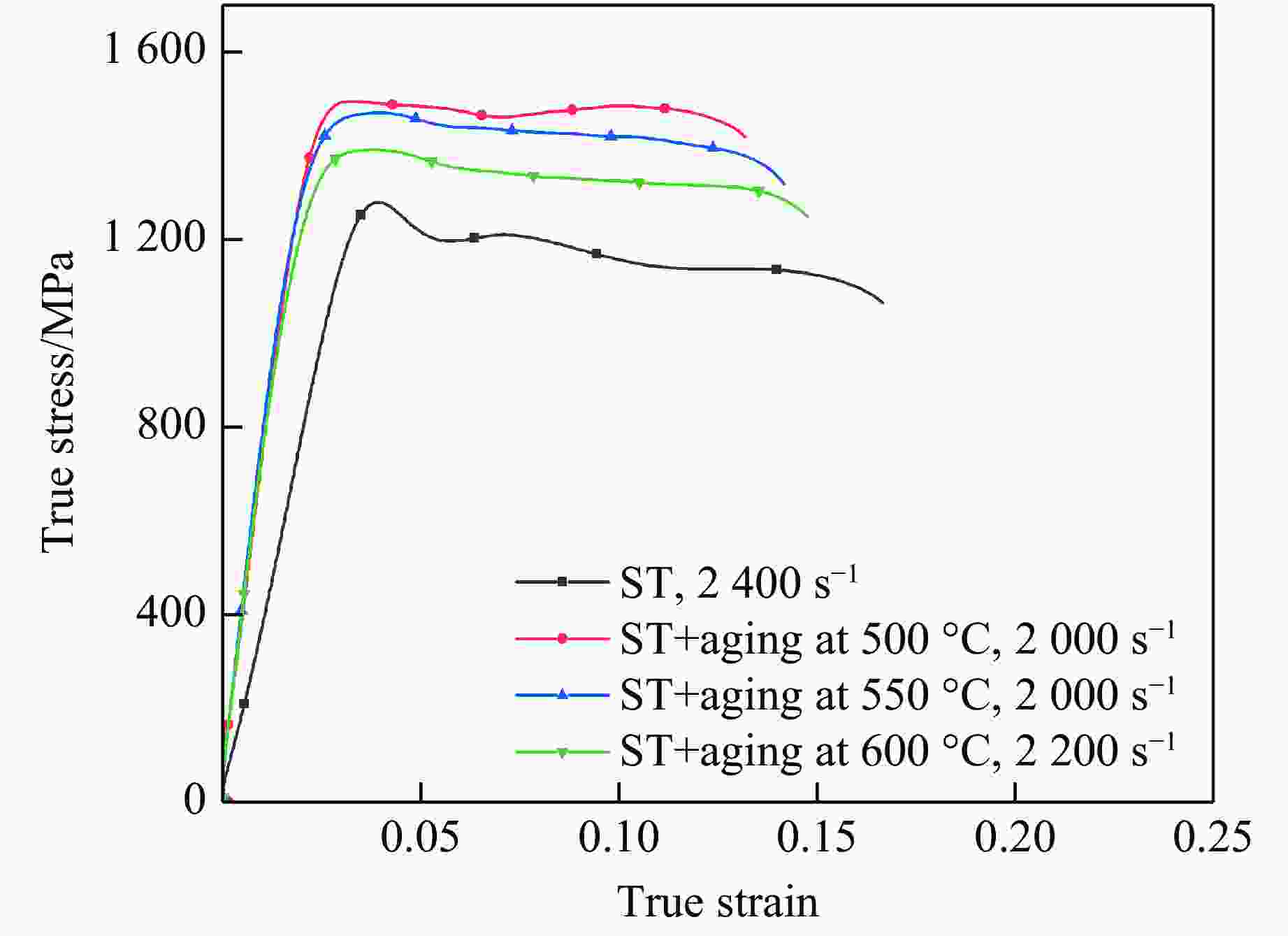 Heat treatment Strain rate/s–1 Yield strength/MPa Failure strain ST 2400 1245 0.167 ST+aging at 500 ℃ 2000 1430 0.132 ST+aging at 550 ℃ 2000 1380 0.142 ST+aging at 600 ℃ 2200 1290 0.148 -