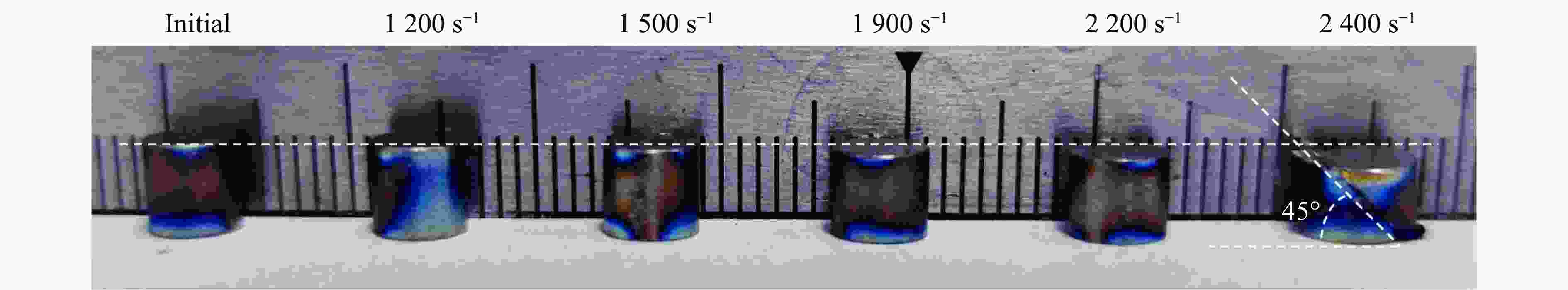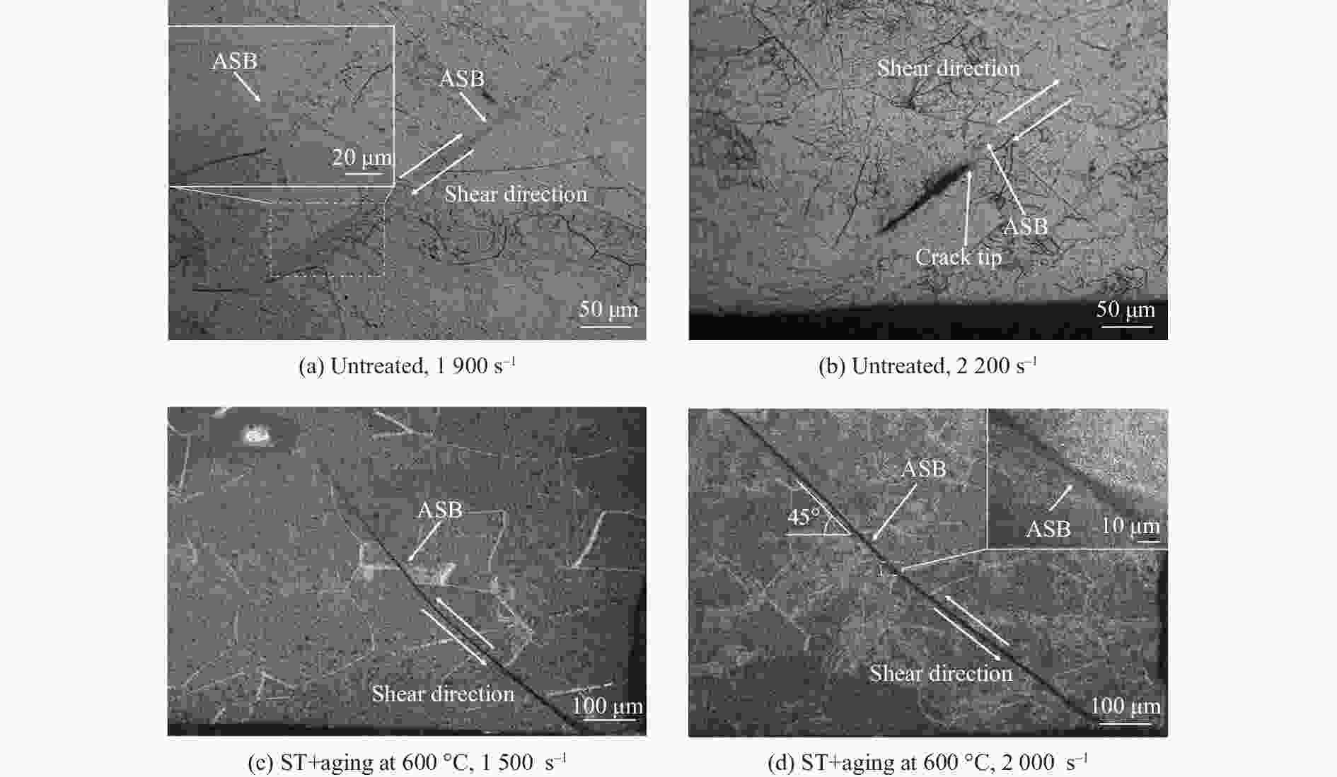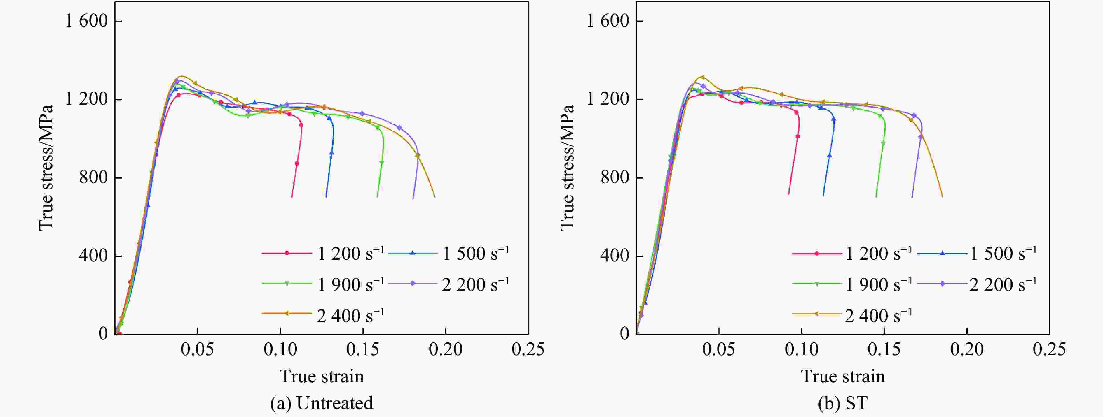 Strain rate/s–1 Yield strength/MPa Untreated ST 1200 1205 1199 1500 1218 1216 1900 1224 1232 2200 1258 1242 2400 1254 1245 表 3 热处理后TB8钛合金宏观破坏时的动态力学性能参数