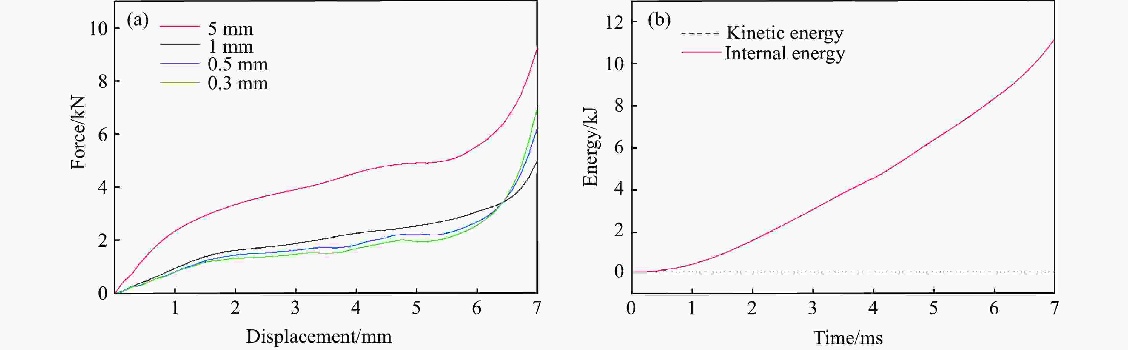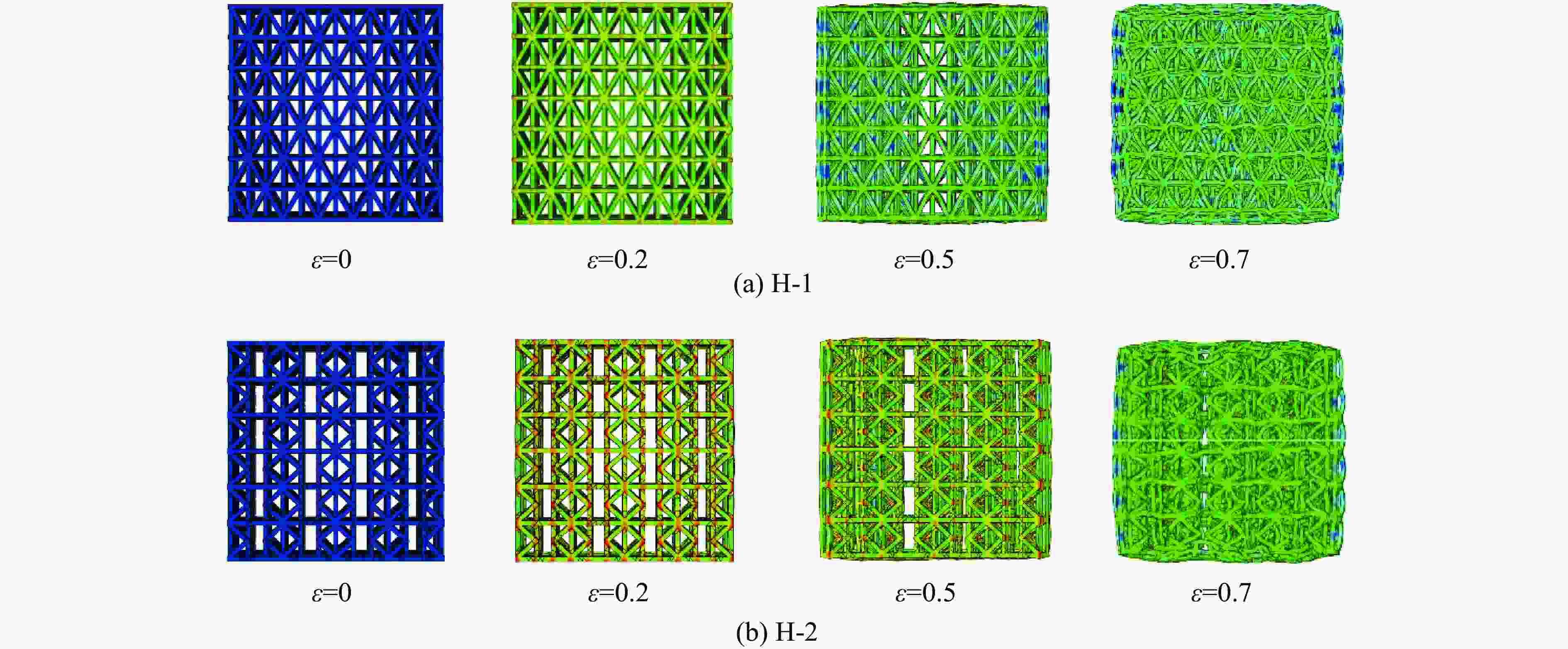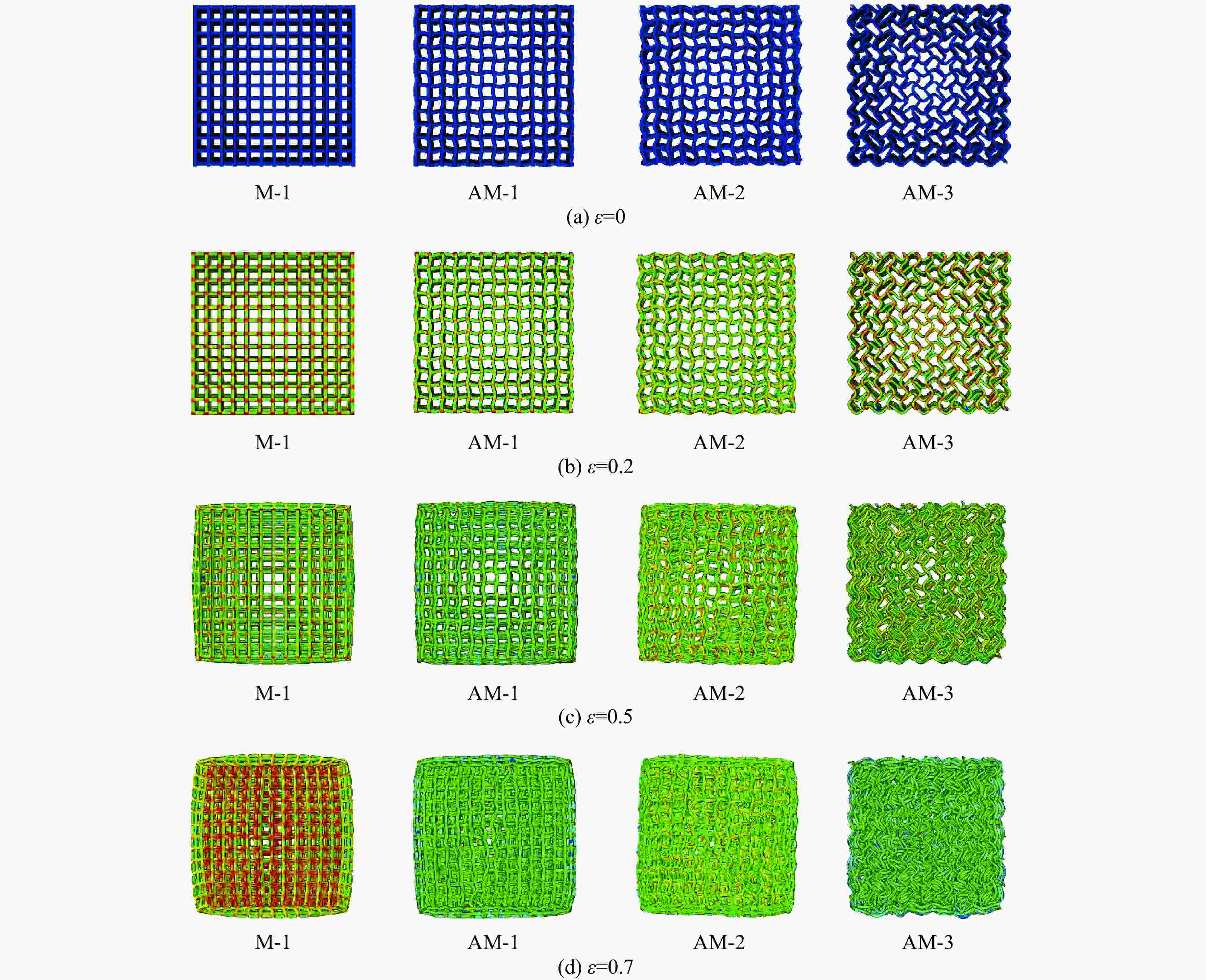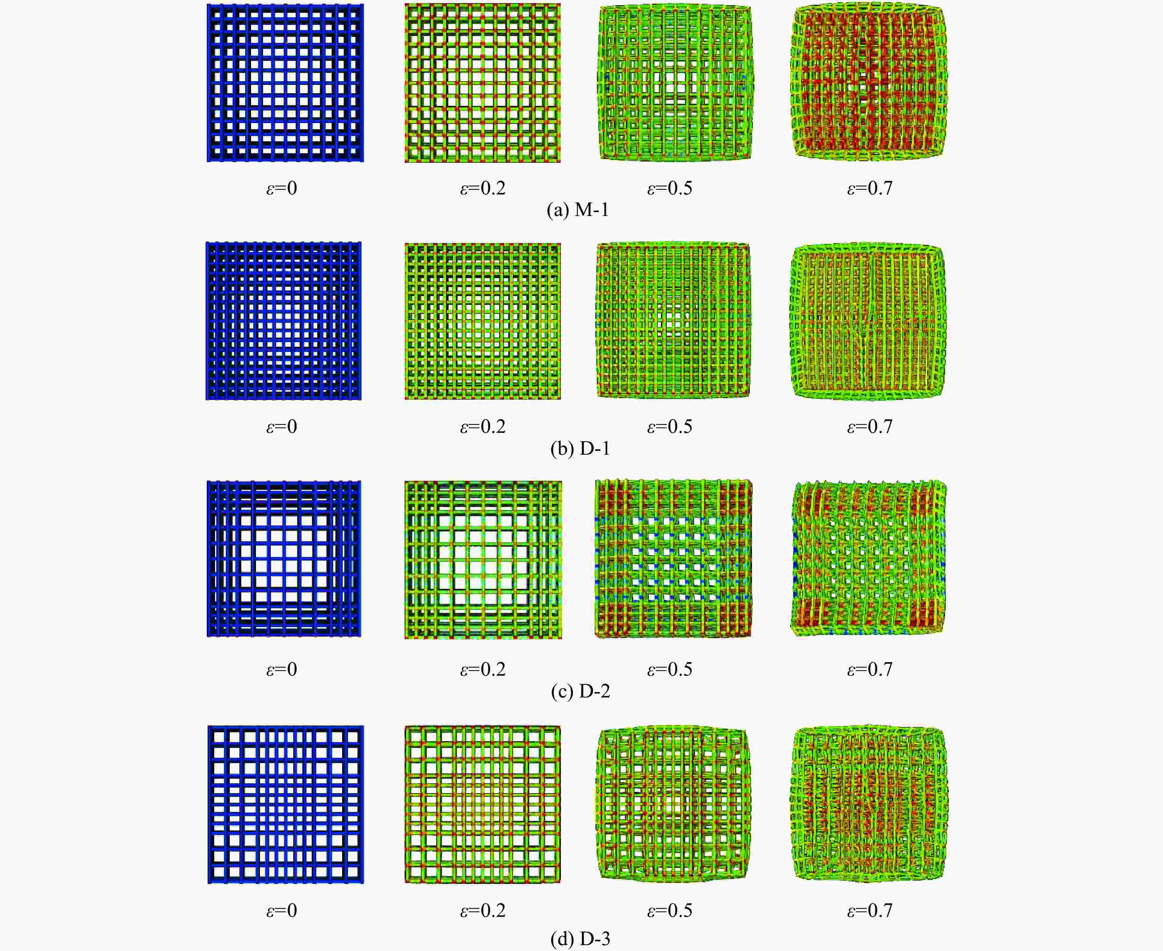 摘要: 选择柔性热塑性聚氨酯(TPU)为原料制备实验试样。基于面心立方层级结构,改变结构的直梁样式、间距,并将蜂窝结构层引入结构中,通过实验和有限元分析,研究层级结构在准静态加载下的变形模式和吸能特性。实验结果与有限元分析得到的载荷-位移曲线吻合较好。结果表明:与初始面心立方层级结构相比,增大直梁的振幅,调整直梁间距为2 mm,即增加塑性铰个数时,又或将蜂窝结构层引入层级结构,可以大幅提高层级结构的能量吸收性能;减小间距、增多塑性铰数目对改善层级结构吸能能力的效果最优;D-1构型与M-1构型相比,比吸能提高了46%;调整塑性铰位置时,层级结构会发生屈曲,不利于层级结构的能量吸收;与M-1构型相比,D-2和D-3构型的比吸能分别降低了27%和34%。Abstract: In this paper, the deformation behavior and energy absorption performance of the hierarchical structure were investigated based on the face-centered cubic hierarchical structure to change the amplitude and distance of the hierarchical structure’s straight beams and introduce the honeycomb structure layer. The quasi-static compression behavior of the proposed hierarchical structure was carried out through finite element methods (FEM) and experimental tests. Thermoplastic polyurethanes (TPU) as the raw material was used to prepare the experimental samples. The force-displacement curves obtained from the FEM and experimental tests are consistent with each other. Compared with the original face-centered cubic layered structure, the conclusion can be obtained: the new hierarchical structure has better energy absorption performance than the face-centered cubic hierarchical structure. The introduction of sinusoidal beams, the increase of plastic hinges, the adjustment of the angle between layers, and the introduction of honeycomb structure layers can enhance the energy absorption ability.