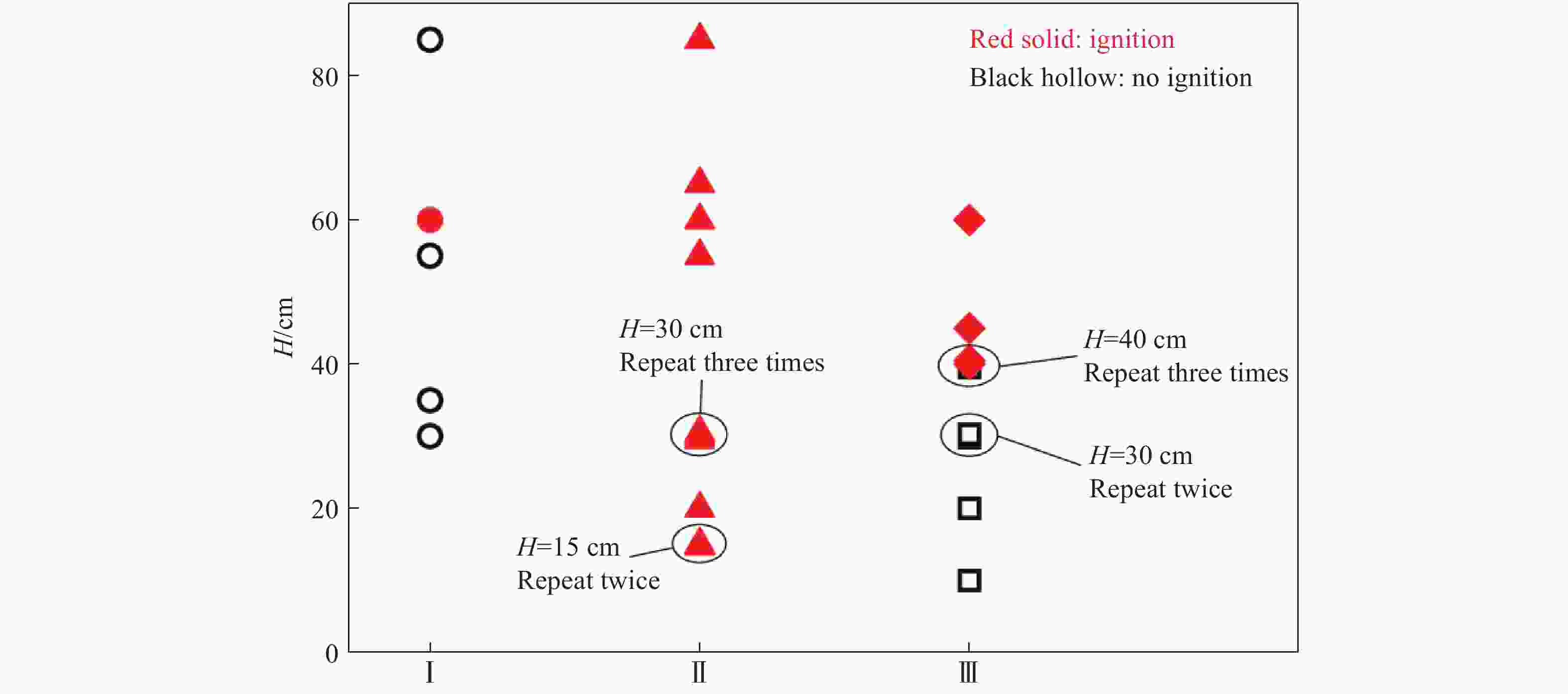Sample type Sample No. Annealing temperature Treatments after annealing Status of the sample Ⅰ 1−5 Without annealing β-phase without crack Ⅱ 6−15 ≥190 ℃ Experiment within 24 h of annealing β- and δ-phase with cracks Ⅲ 16−24 ≥190 ℃ Humidifying and experiment after 30 d β-phase with cracks 表 2 不同HMX晶体的落锤高度