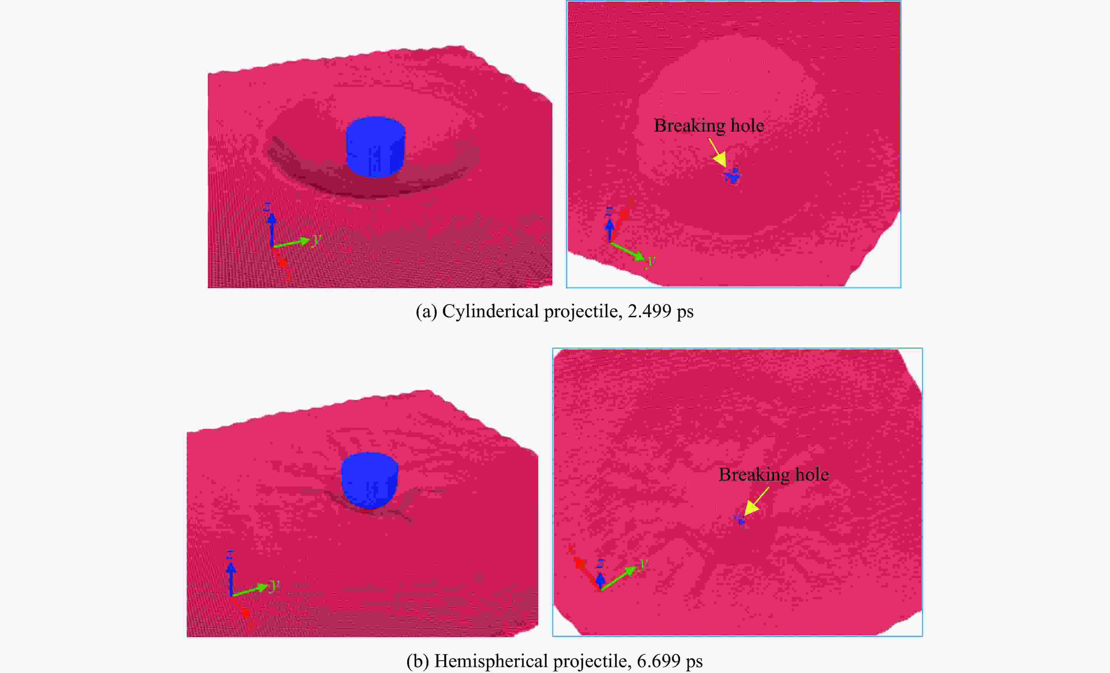 图  10  柱形与半球形弹丸以3.5 km/s冲击双层石墨烯时破坏时刻的样貌侧视图和仰视图