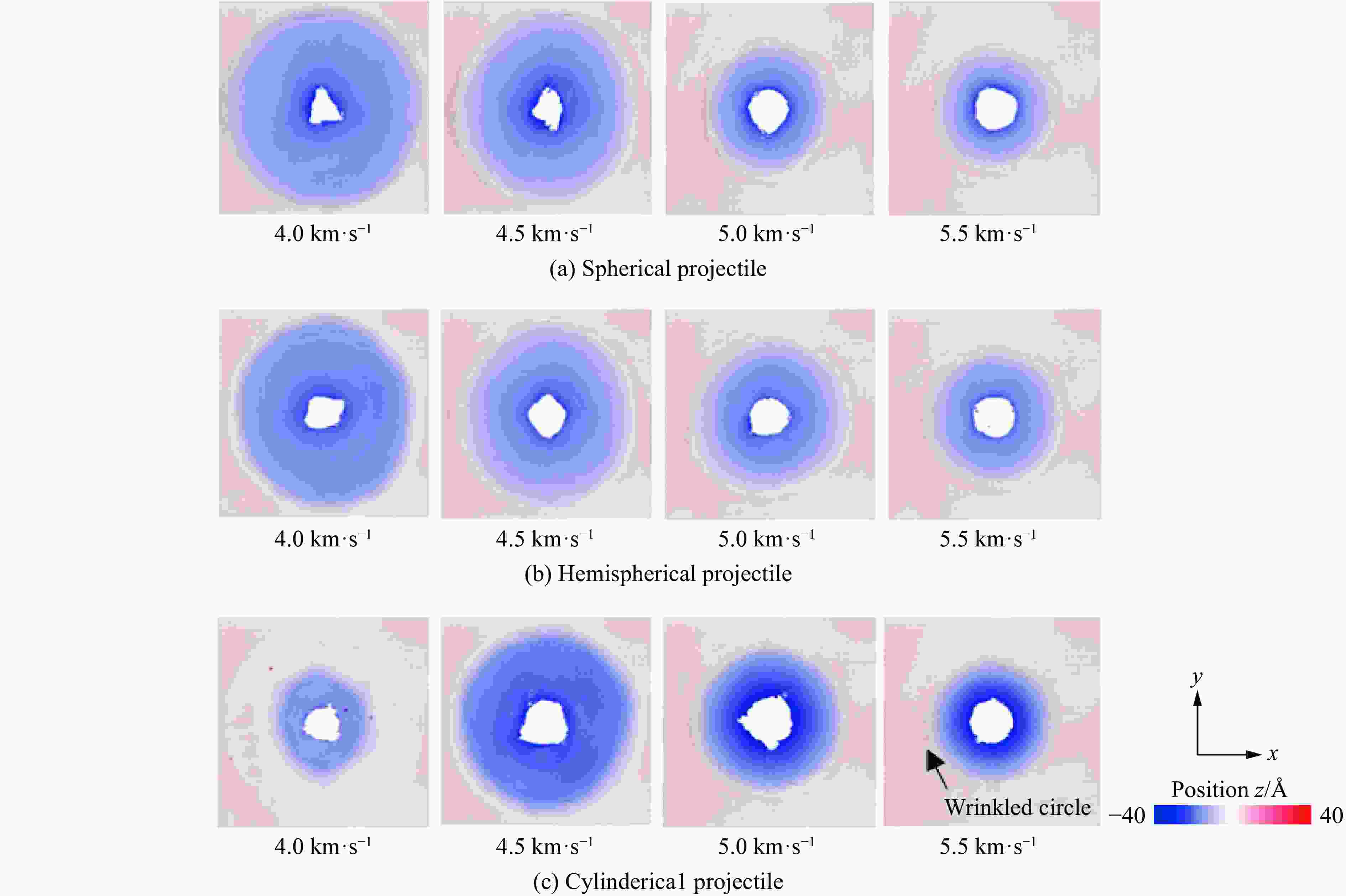 图  不同形状弹丸以不同速度冲击时脱离时刻双层石墨烯z向位置云图