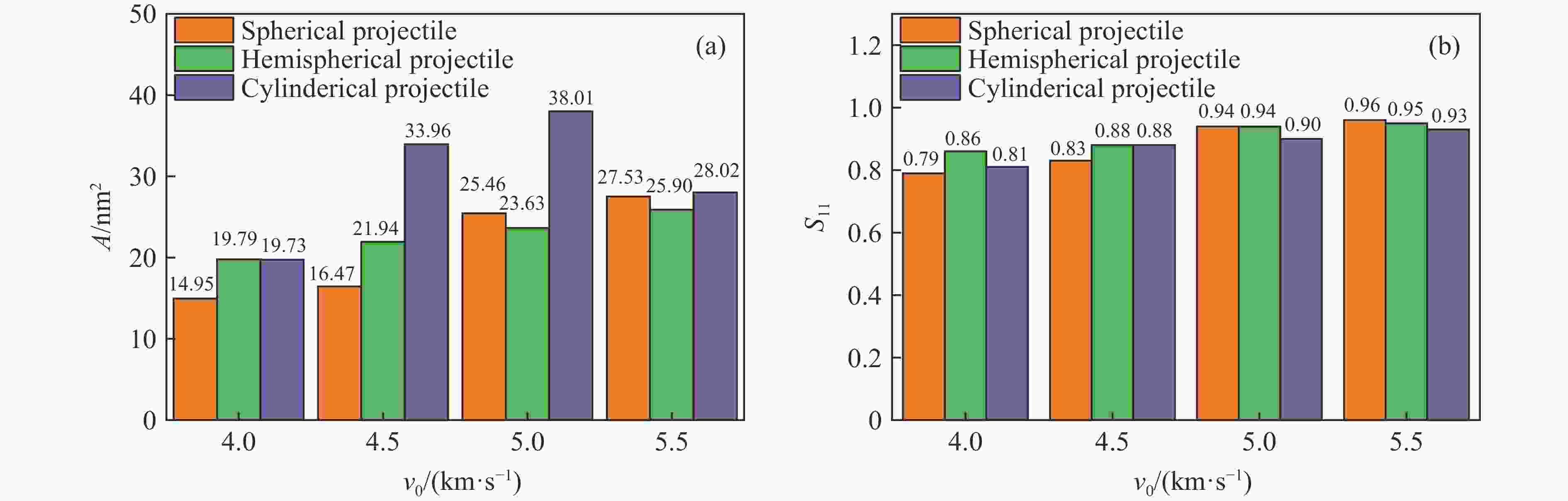 Figure  7.  Morphological parameters A and S11 of the hole as a function of initial impact velocity ranging under the impact of different shapes of projectiles