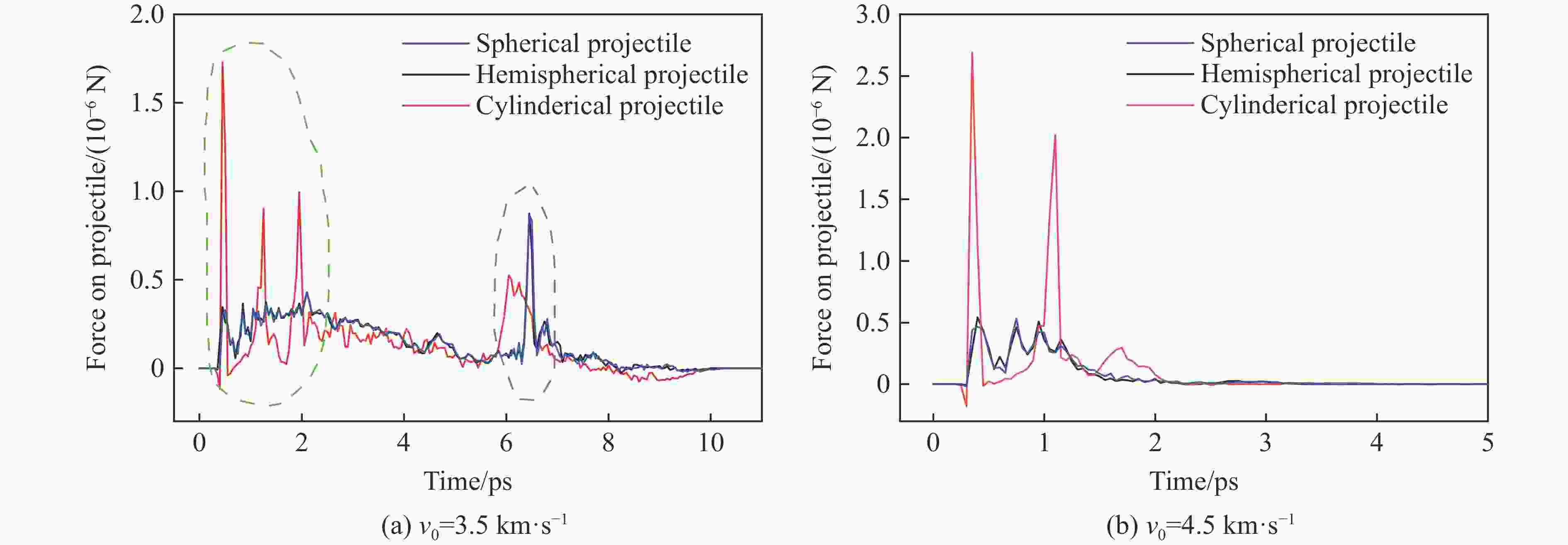 图  不同形状弹丸冲击双层石墨烯时弹丸受力随时间的变化