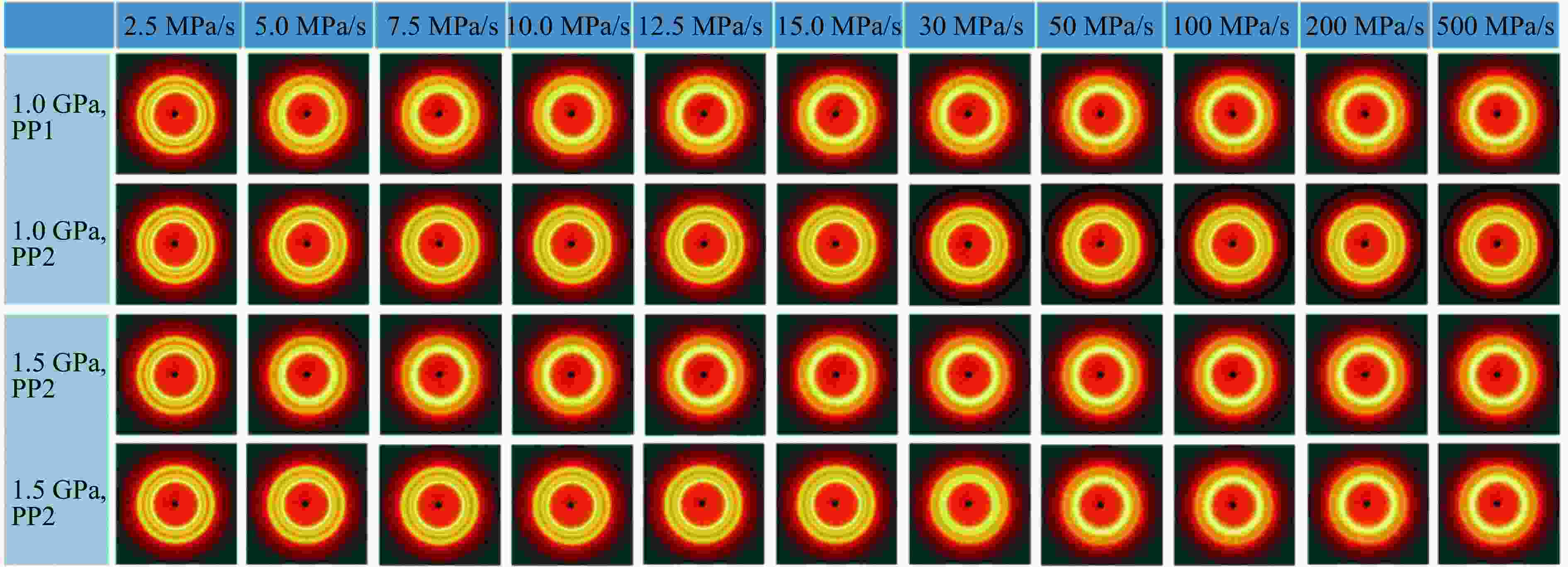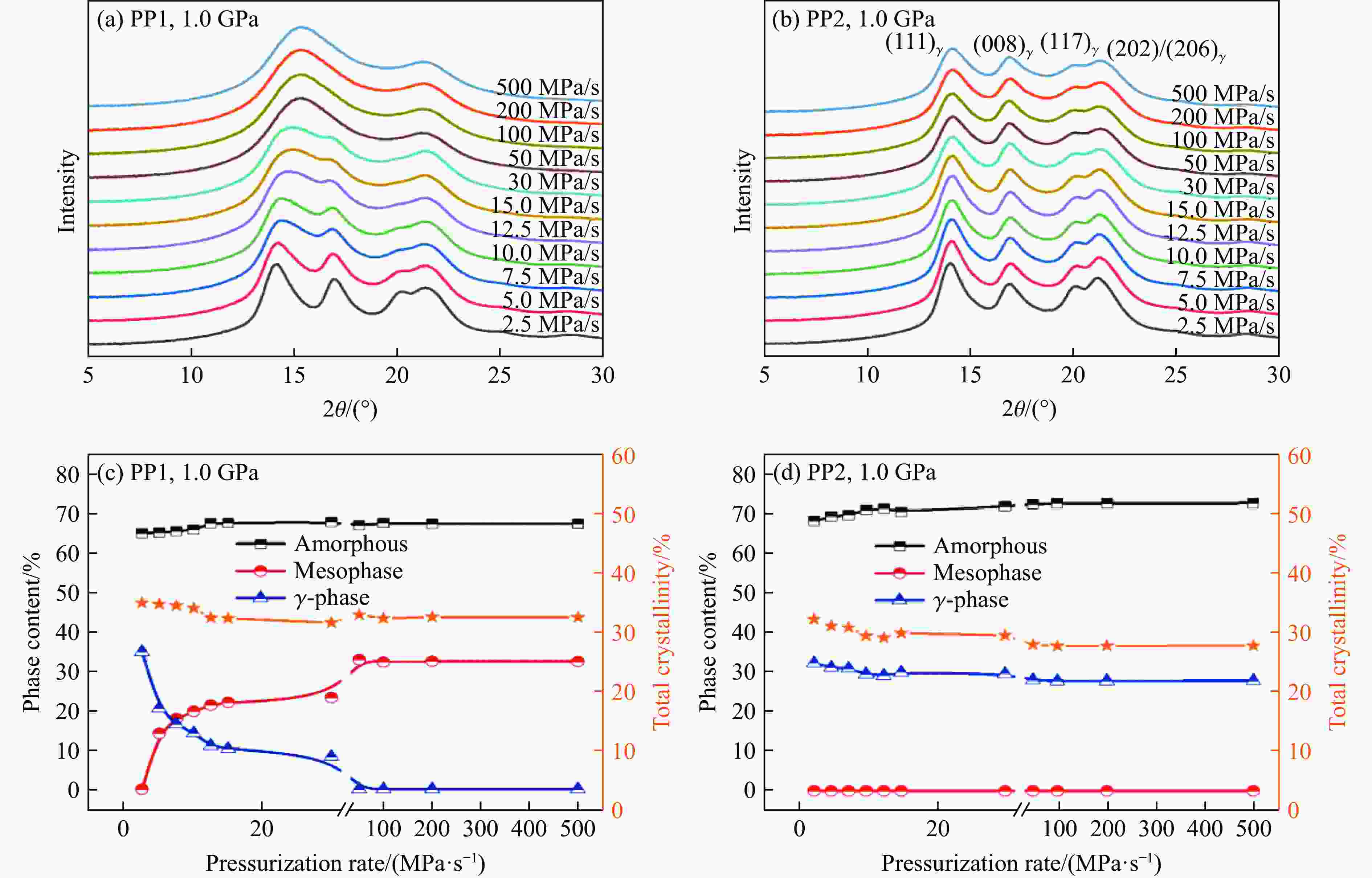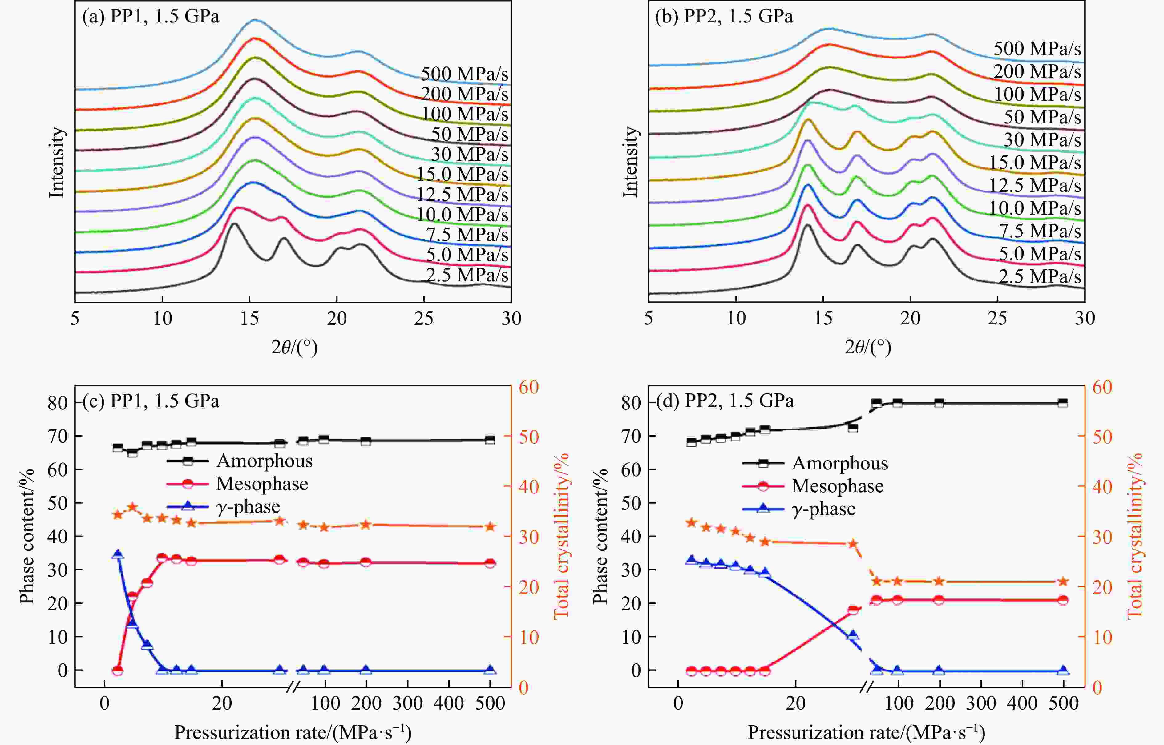 摘要: 在聚合物的高压成型过程中,压力、增压速率以及聚合物的分子量都会影响制品的最终结晶结构,研究不同高压处理方法与等规聚丙烯(isotactic polypropylene,iPP)结晶结构之间的关系,有利于深入认识高压成型工艺对聚合物结晶行为的影响。利用广角X射线衍射技术和差示扫描量热法,研究了两种不同分子量的iPP在不同增压速率、不同压力下的结晶行为及制品的热性能。结果表明:压力是决定中间相iPP形成的关键因素,只要压力足够高,就能够制备出完全的中间相iPP;在足够高的压力下,增压速率越高,越有利于中间相iPP的形成,相反更容易形成γ相iPP;分子量越高,制备中间相iPP需要的压力越高,需要的临界增压速率越大。制品的热性能分析表明,不同条件下得到的中间相制品在热性能上基本没有区别,但γ相iPP的晶体完善性与增压条件有关。Abstract: In the high-pressure molding process of polymers, the pressure, pressurization rate and molecular weight of the polymers will affect the final crystalline structure of the products. Studying the relationship between different high-pressure processing methods and the crystalline structure of isotactic polypropylene (iPP) is helpful to deeply understand the influence of high-pressure molding process on the crystallization behavior of polymers. In this paper, wide-angle X-ray diffraction and differential scanning calorimetry were used to study the crystallization behavior and thermal properties of two kinds of iPP with different molecular weights at different pressurization rates and pressures. The results show that pressure is a key factor in determining the formation of mesophase iPP. The complete mesophase iPP can be prepared under sufficient pressure. Under enough pressure, the higher the pressurization rate, the easier to form mesophase iPP, ortherwise, to form γ-phase iPP. The higher the molecular weight, the higher pressure required for the preparation of mesophase iPP, and the greater the required critical pressurization rate. The thermal property analysis of the products shows that the thermal properties of the mesophase products obtained under different conditions are basically the same, but the crystal perfection of the γ-phase iPP is related to the pressurized condition.