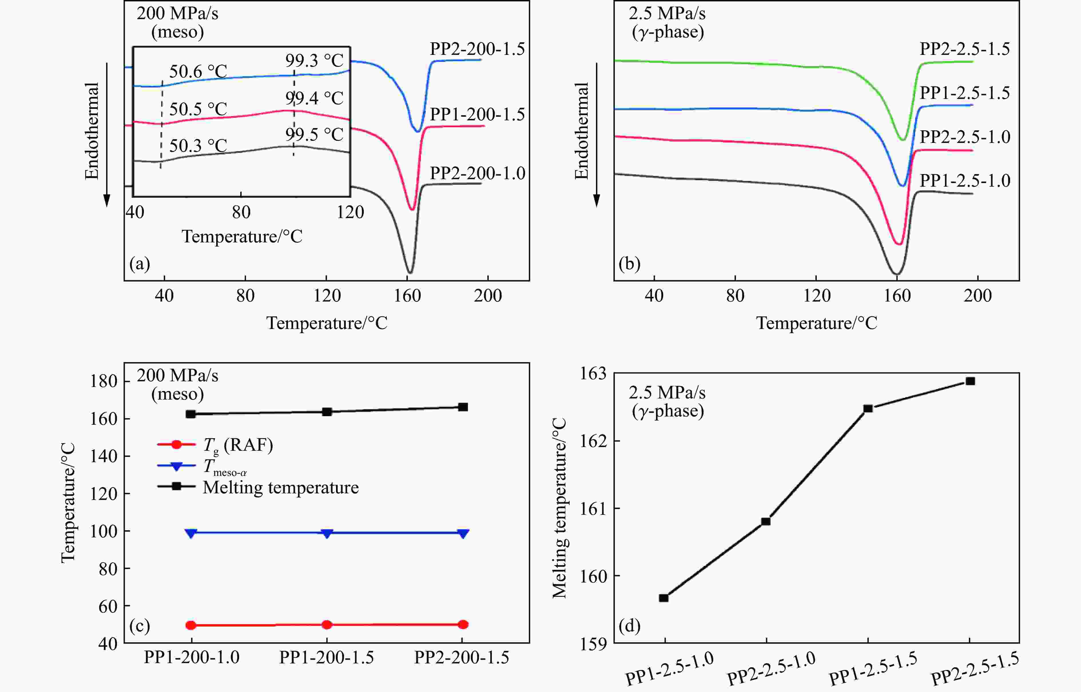 图 6 增压法制备的中间相样品 (a)和γ相样品 (b) 的DSC升温曲线以及相应的中间相样品的刚性非晶部分的玻璃化转变温度(Tg)、冷结晶温度(Tmeso-α)和熔融温度(c)和 γ相样品的熔融温度 (d)