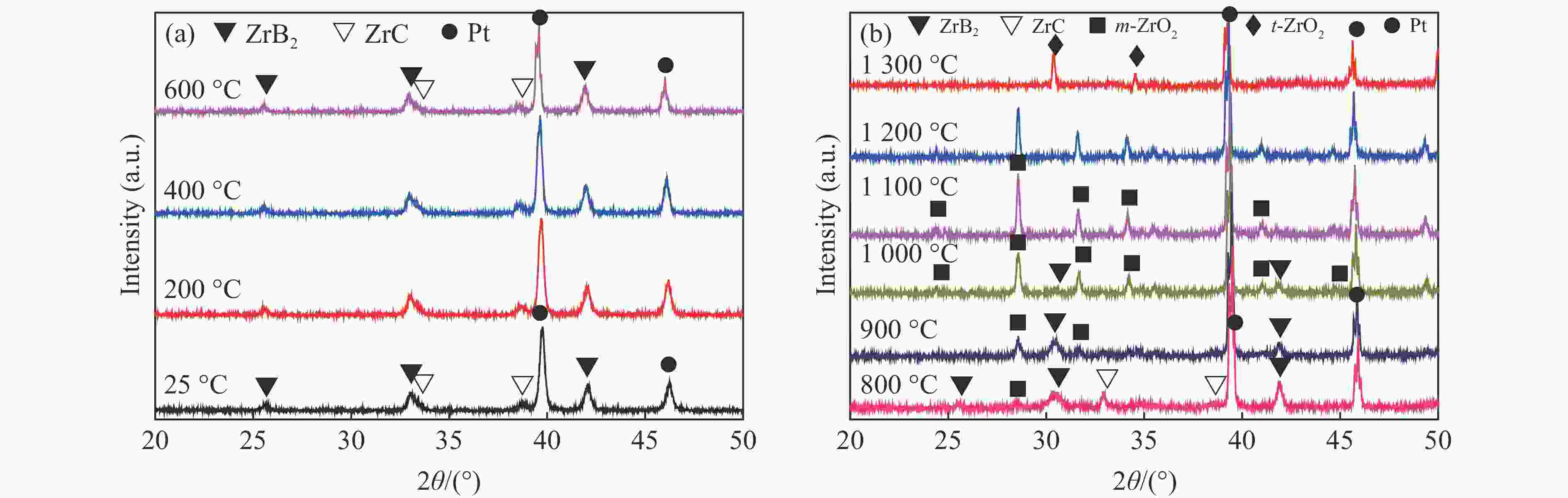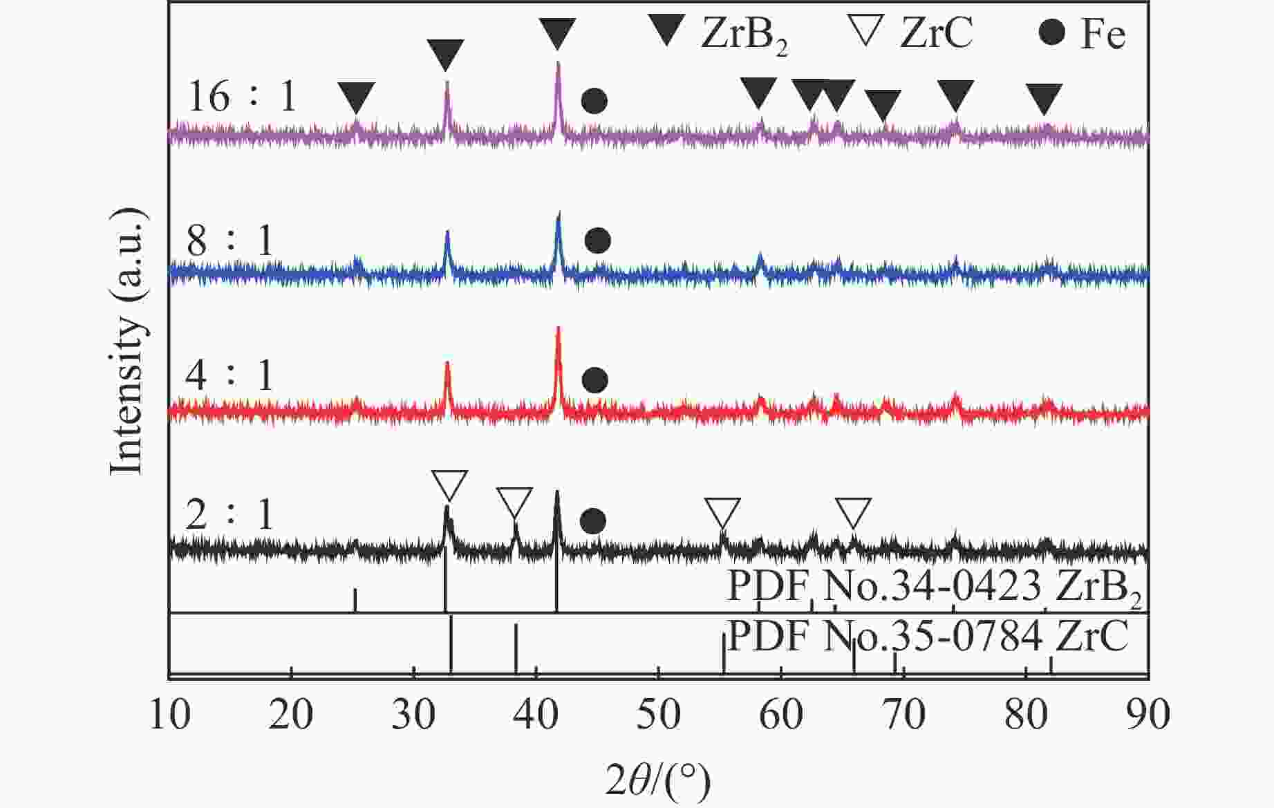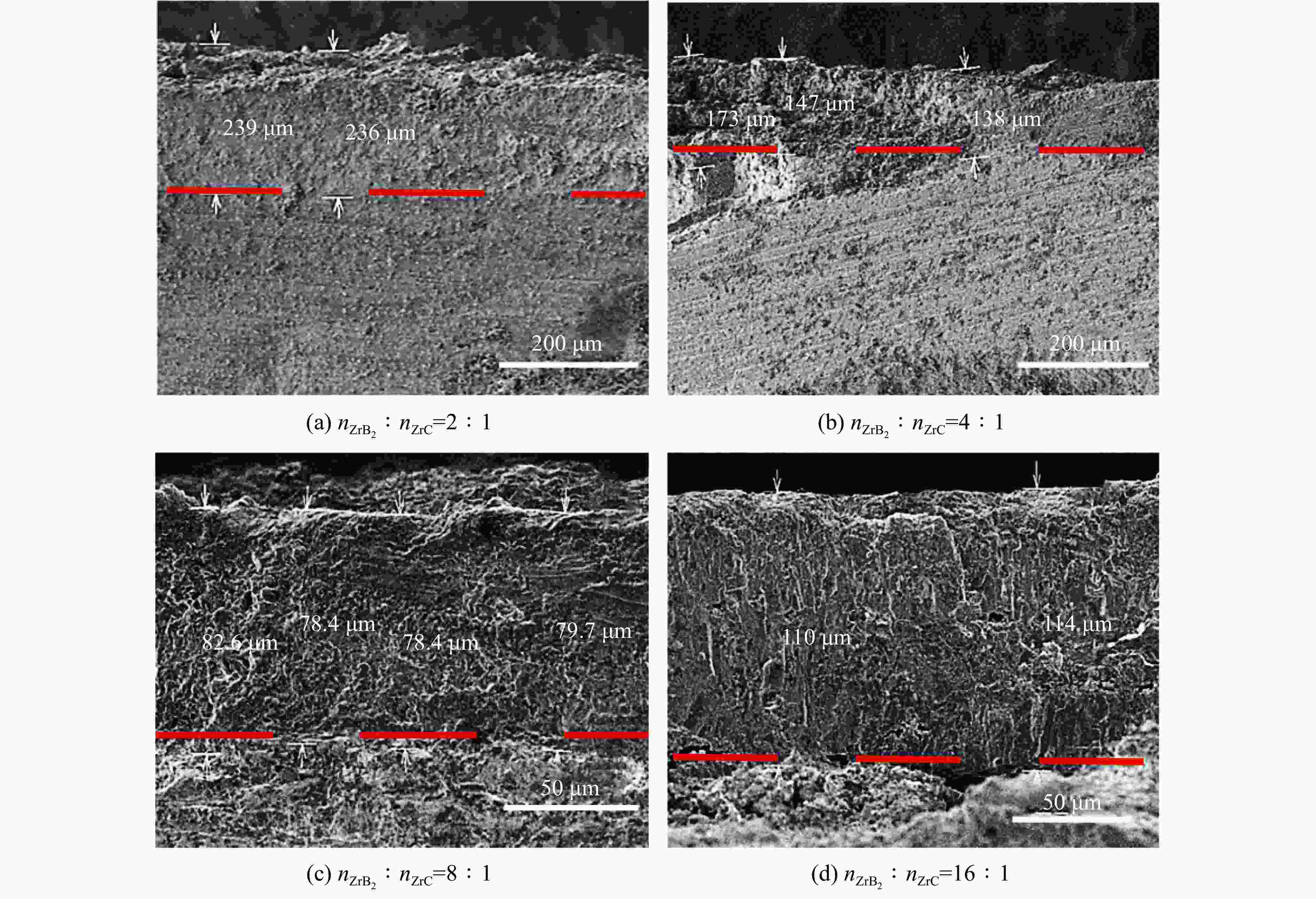 $n{_{{\rm{ZrB}}_2}} $∶nZrC Density/% Rm/(μg·s−1) Rl/(μm·s−1) 2∶1 95.4 55 0.15 4∶1 93.8 43 0.19 8∶1 95.4 35 0.19 16∶1 95.5 78 0.20 -