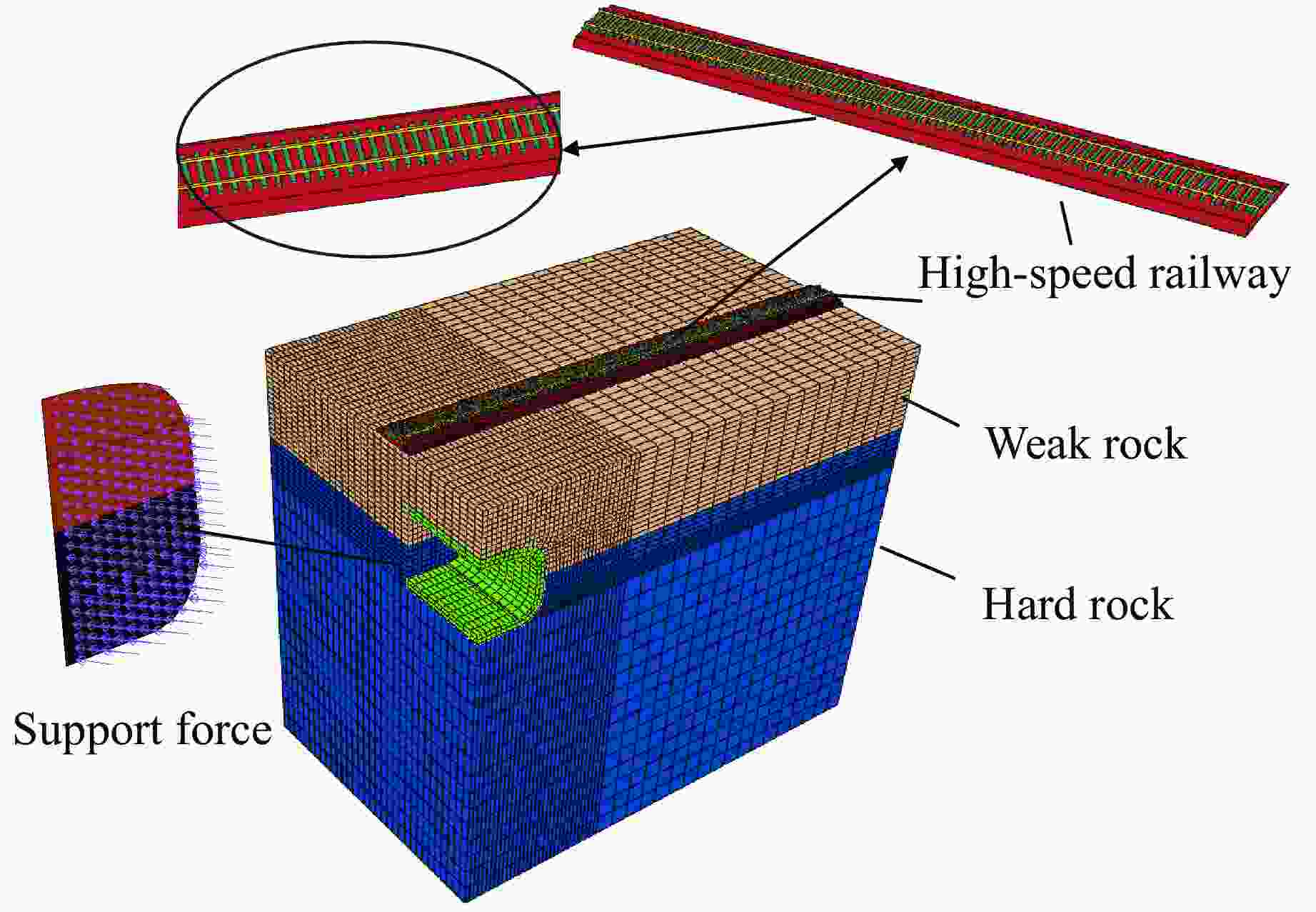 Surrounding rock Density/(kg·m−3) Elastic modulus/GPa Poisson’s ratio Internal friction angle/(°) Cohesion/MPa Weak rock 1 860 0.21 0.37 18 0.000 5 Hard rock 2 500 6 0.25 35 1 Tracks 7 800 206 0.23 Ballast 2 500 0.13 0.35 Sleeper 2 450 31.5 0.20 Foundation 2 300 28.0 0.33 表 2 计算结果对比