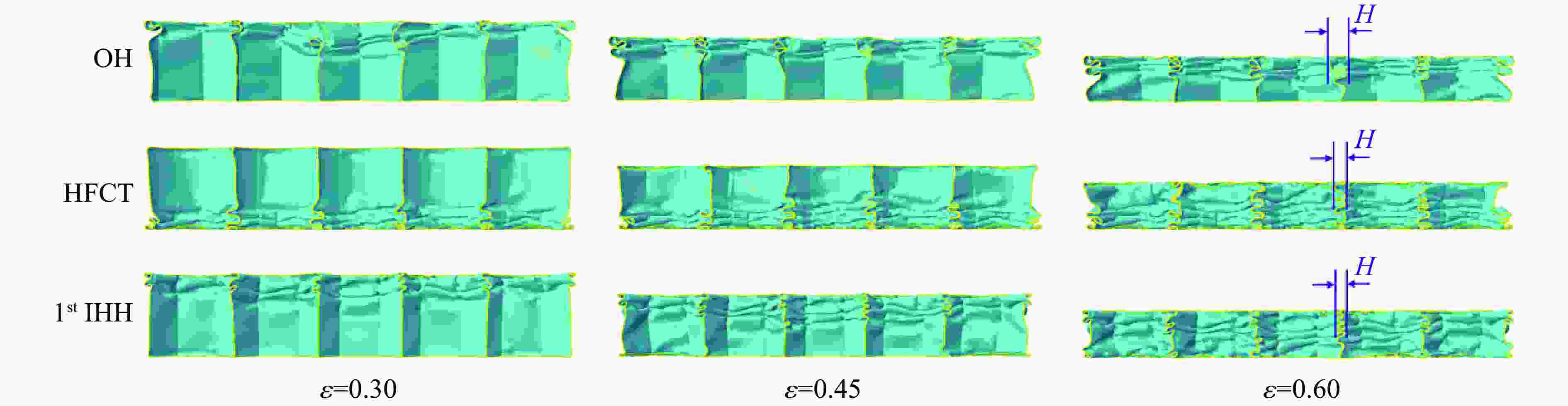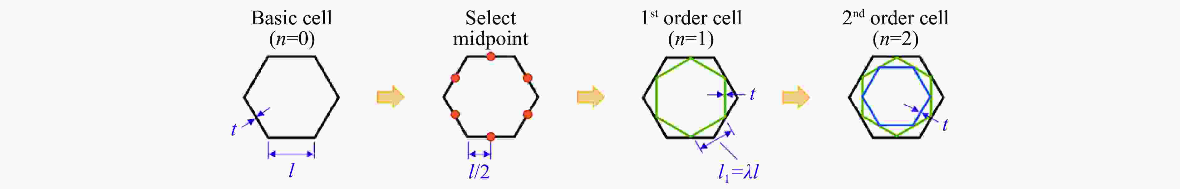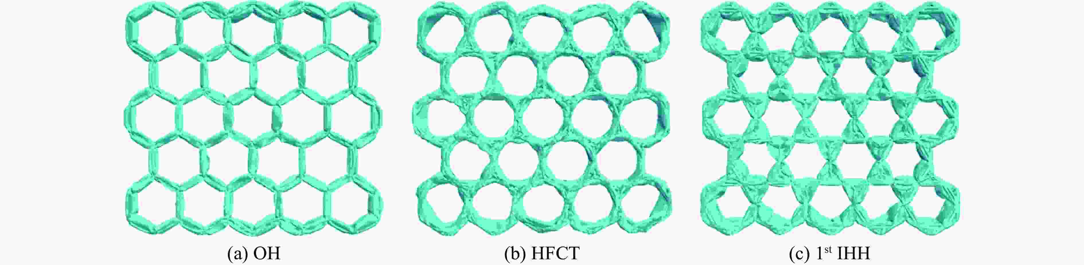 Structures $ V $ ${V}{_{\mathrm{s} }}$ $ \Delta \rho $ OH $\dfrac{69\sqrt{3} }{2}{l}{^{2}}T$ $ 88ltT $ $\dfrac{176\,t}{69\sqrt{3}\,l}$ HFCT $\dfrac{69\sqrt{3} }{2}{l}{^{2}}T$ $(88+23\sqrt{3}\text{π})ltT$ $\left(\dfrac{176}{69\sqrt{3} }+\dfrac{2\text{π} }{3}\right)\dfrac{t}{l}$ IHH $\dfrac{69\sqrt{3} }{2}{l}{^{2}}T$ $\left(88+138\displaystyle\sum _{i=1}^{n}{\lambda }^{i}\right)ltT$ $\left(\dfrac{176}{69\sqrt{3} }+\dfrac{4}{\sqrt{3} }\displaystyle\sum _{i=1}^{n}{\lambda }^{i}\right)\dfrac{t}{l}$ 表 2 3种多胞结构的力学性能指标