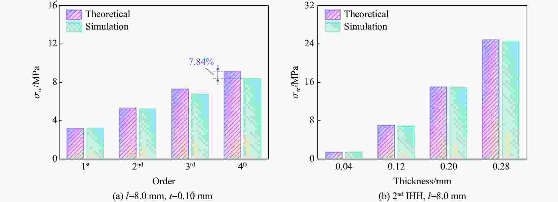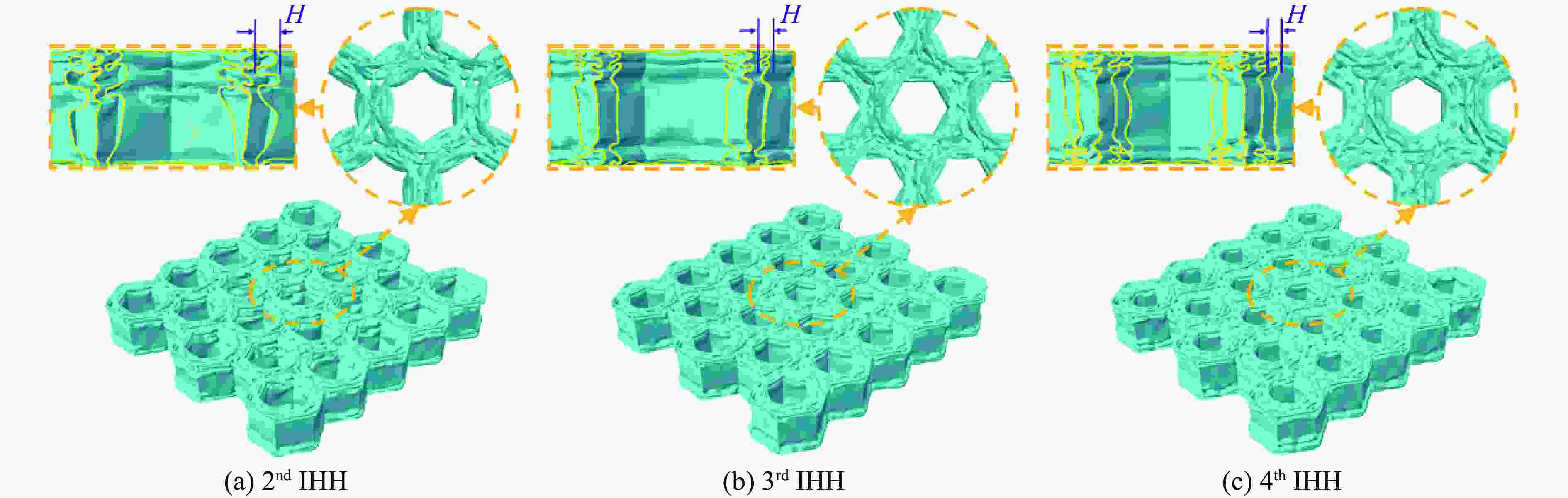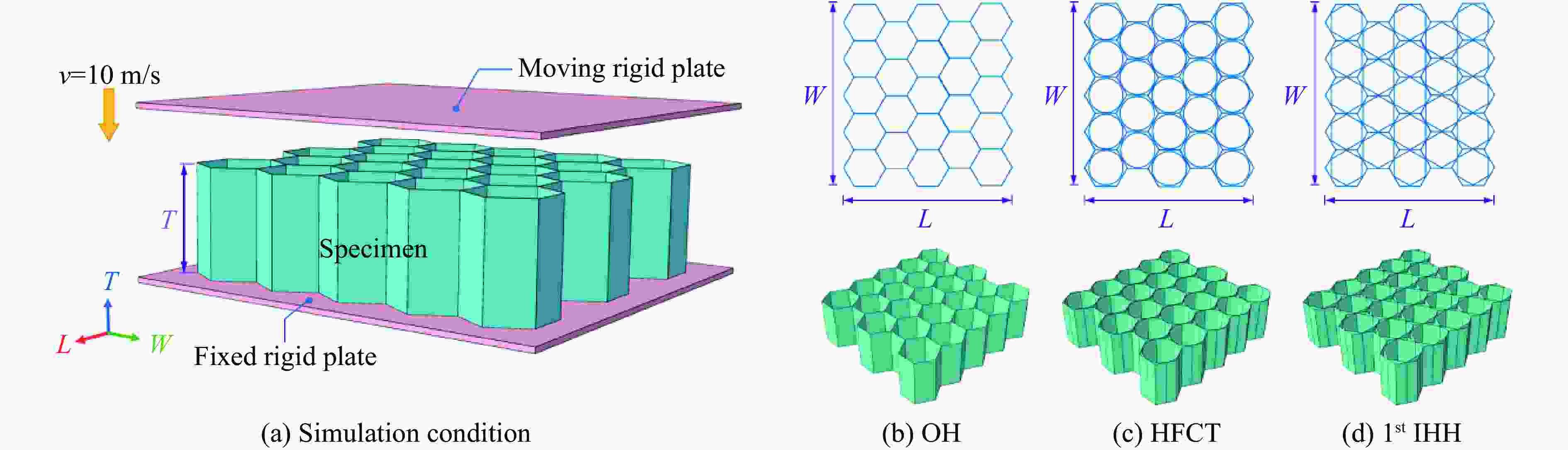 Structures $ V $ ${V}{_{\mathrm{s} }}$ $ \Delta \rho $ OH $\dfrac{69\sqrt{3} }{2}{l}{^{2}}T$ $ 88ltT $ $\dfrac{176\,t}{69\sqrt{3}\,l}$ HFCT $\dfrac{69\sqrt{3} }{2}{l}{^{2}}T$ $(88+23\sqrt{3}\text{π})ltT$ $\left(\dfrac{176}{69\sqrt{3} }+\dfrac{2\text{π} }{3}\right)\dfrac{t}{l}$ IHH $\dfrac{69\sqrt{3} }{2}{l}{^{2}}T$ $\left(88+138\displaystyle\sum _{i=1}^{n}{\lambda }^{i}\right)ltT$ $\left(\dfrac{176}{69\sqrt{3} }+\dfrac{4}{\sqrt{3} }\displaystyle\sum _{i=1}^{n}{\lambda }^{i}\right)\dfrac{t}{l}$ 表 2 3种多胞结构的力学性能指标
