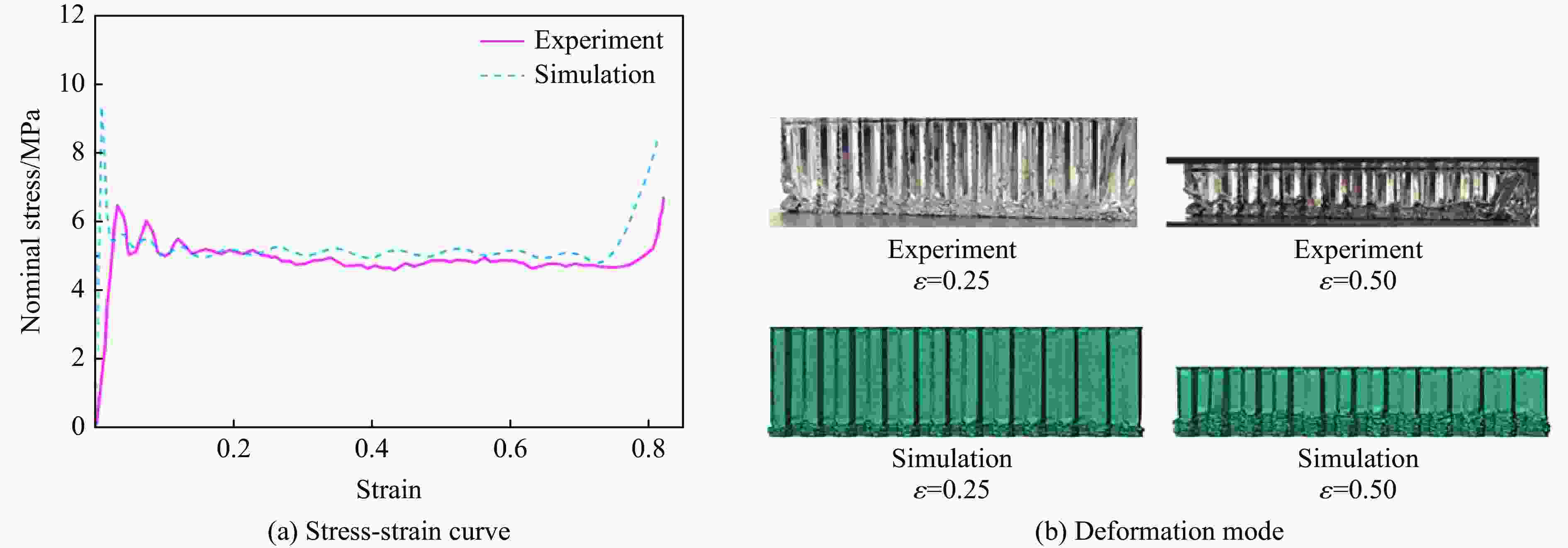 摘要: 结合几何学的胞元设计思路,提出了一种新型多胞结构—内旋层级类蜂窝(intorsion hierarchical honeycomb-like,IHH)结构,通过数值模拟方法对其面外力学性能和变形特征进行深入研究,并与普通蜂窝结构、填充圆管的蜂窝结构进行了比较。研究发现,采用内旋层级设计的多胞结构,其胞元内部产生了独特的约束效果,在多层级设计条件下,可以进一步加强这种约束效果,从而提高结构的力学性能。此外,通过开展参数化研究,以揭示相对密度变化对结构性能的影响;基于简化超级折叠单元理论,建立了内旋层级类蜂窝结构的理论模型。结果表明,内旋层级类蜂窝结构在渐进式折叠变形模式下表现出最佳的吸能效率,理论模型能够有效地预测内旋层级类蜂窝结构的平台应力。研究结果可为多胞结构性能优化设计提供指导。Abstract: In this study, a novel type of the intorsion hierarchical honeycomb-like (IHH) structures was proposed based on the cell geometrical design. The out-of-plane mechanical behaviors and deformation characteristics were studied by numerical simulation, and the results were compared with that of ordinary honeycomb (OH) structure as well as the honeycomb structure filled with circular tube (HFCT). It is found that the intorsion hierarchical design makes the constraint effect inside the cell. Through multi-order hierarchical design, the constraint effect can be further strengthened, so as to improve the mechanical behaviors. In addition, parametric studies were carried out to reveal the influence of the change of relative density on mechanical performance. Based on the simplified super folding element (SSFE) theory, a theoretical model of IHH was established. The results show that the proposed IHH exhibit the progressive folding deformation mode and attain the optimal energy absorption efficiency among all the competitors. The theoretical model can effectively predict the mean stress of IHH. The results in this study can provide guidance for the mechanical performance optimization of multi-cell structure.