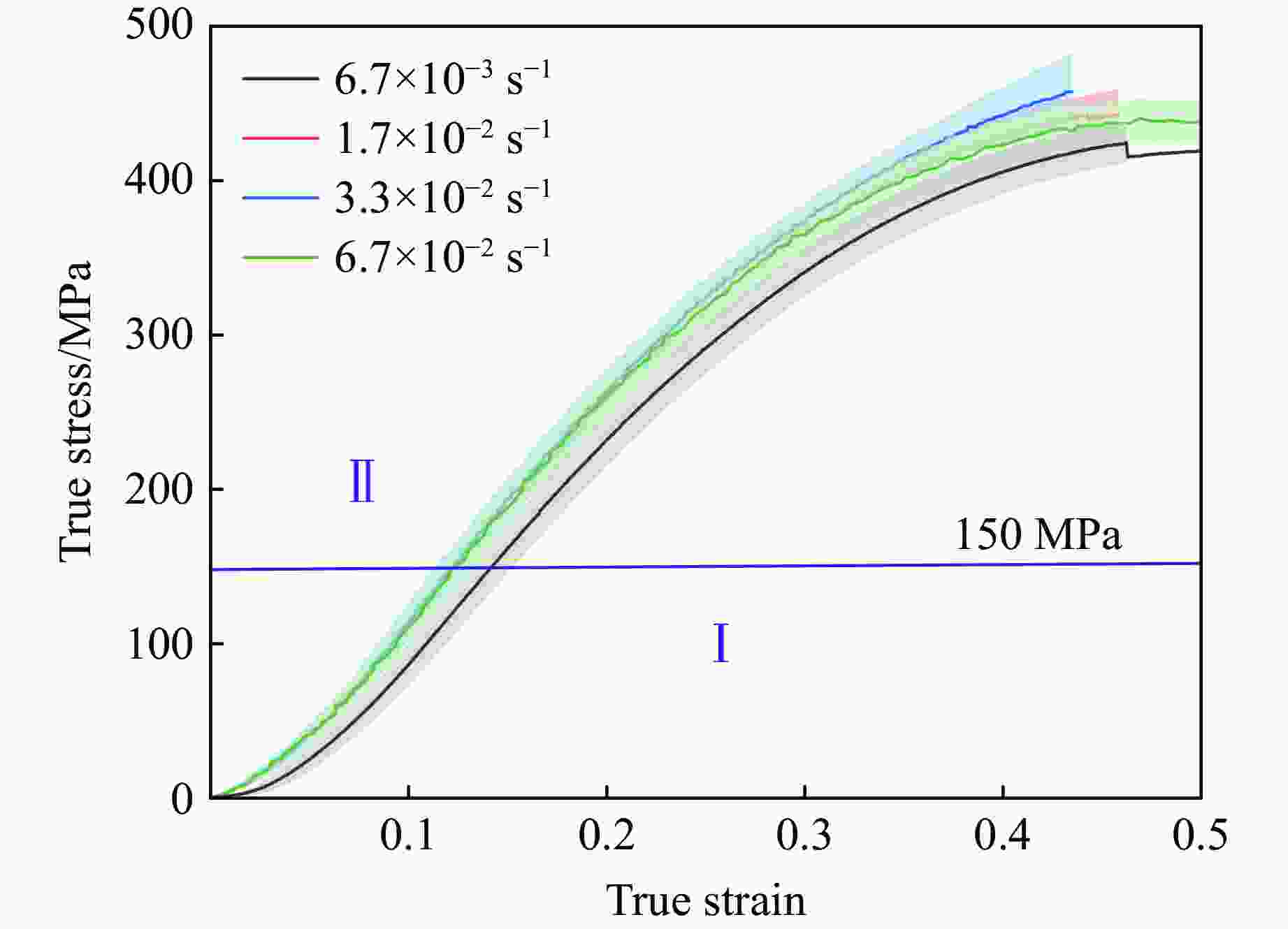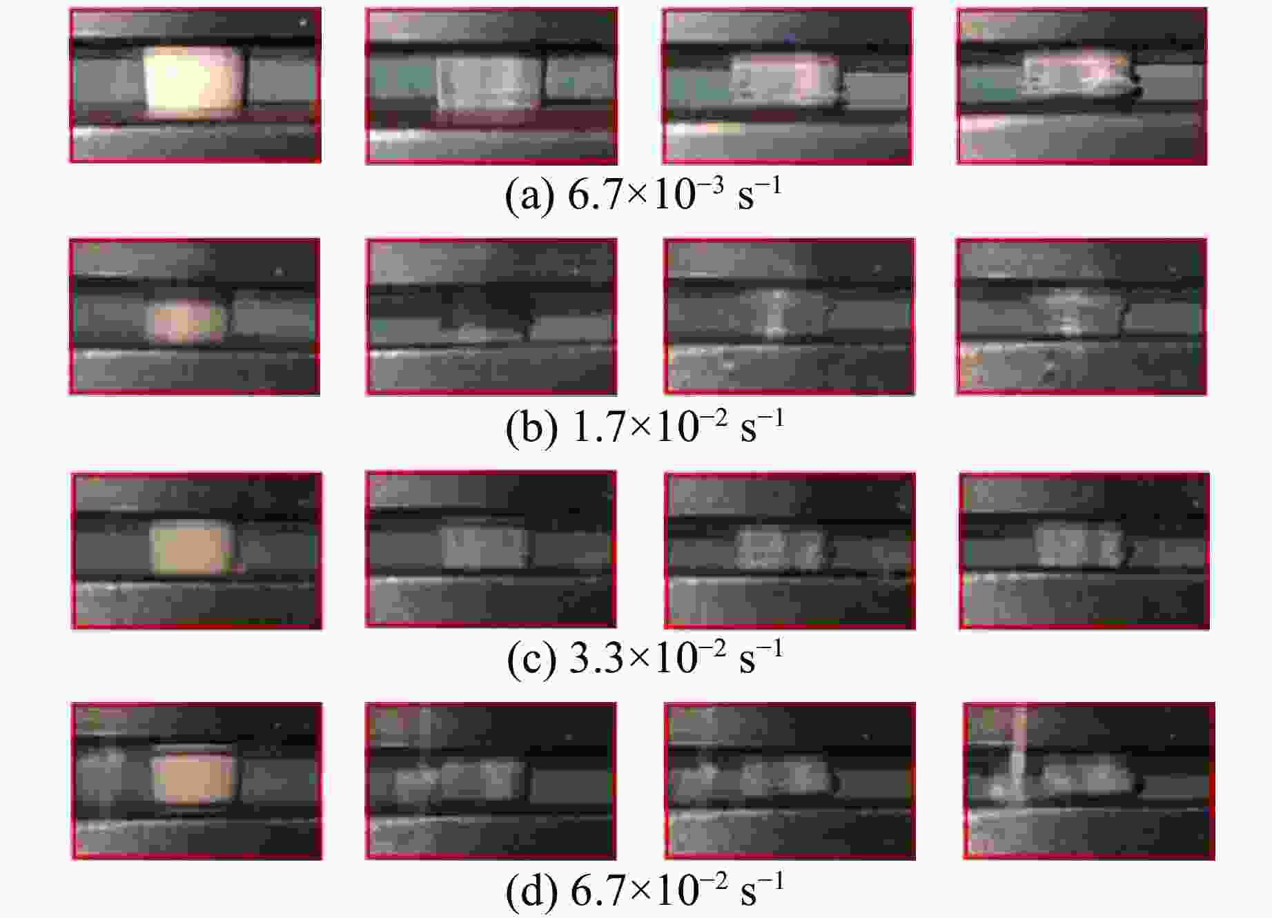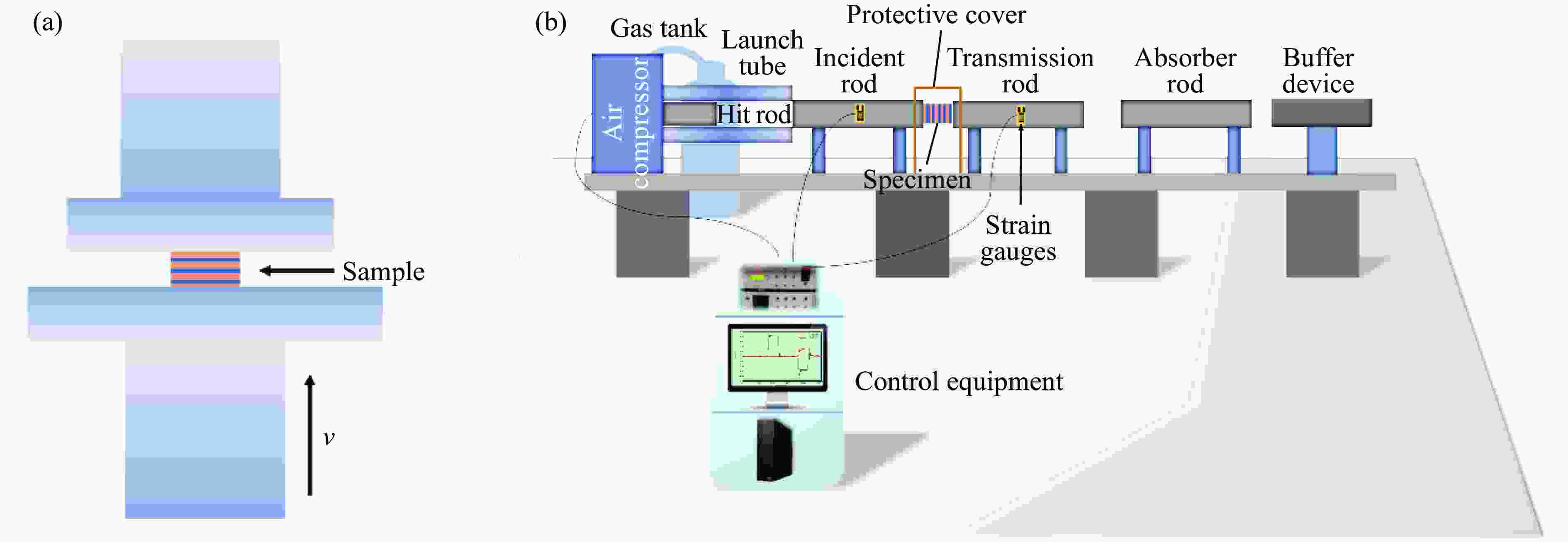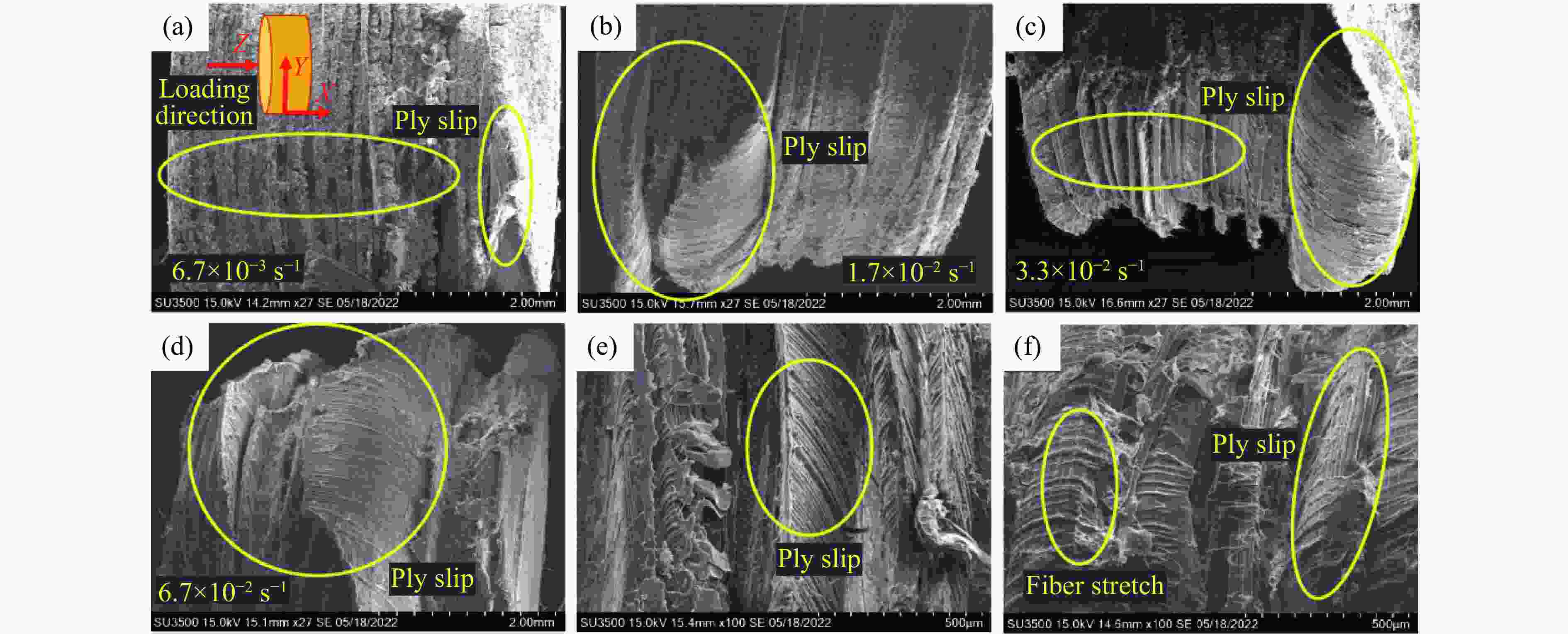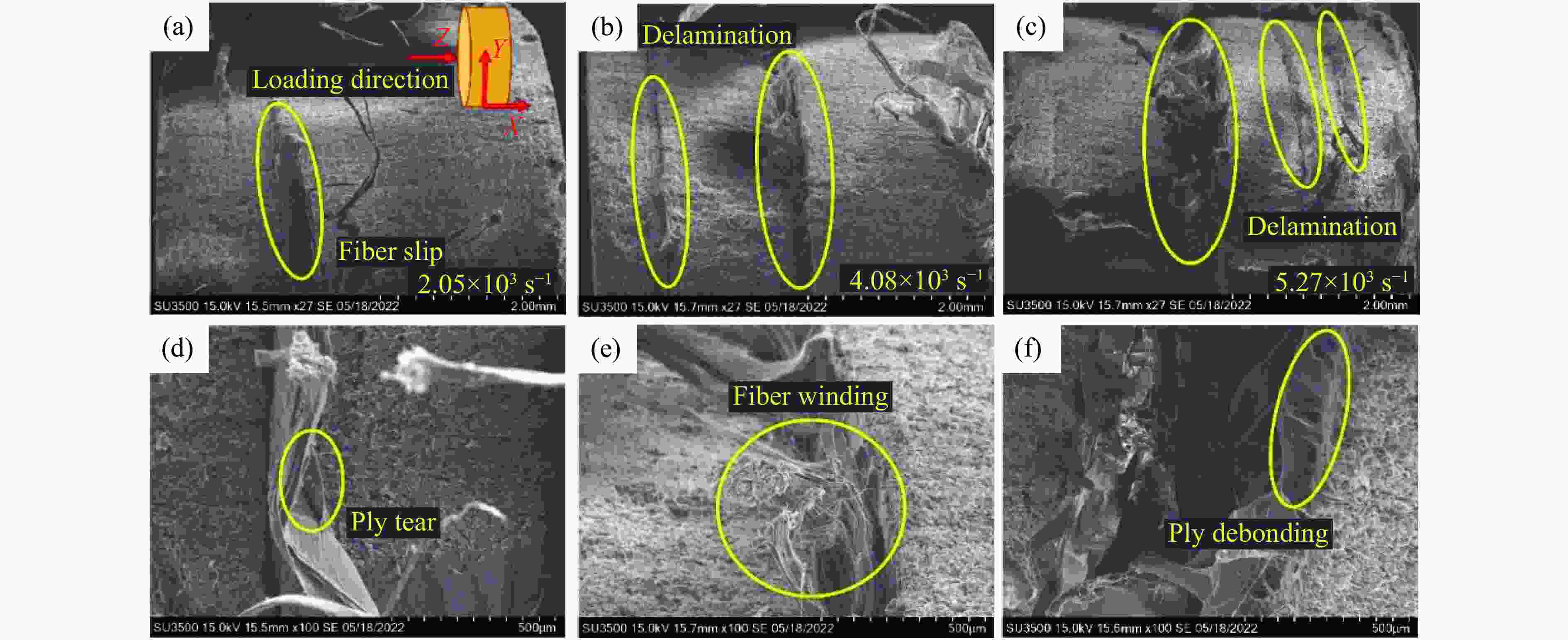 摘要: 为获得超高分子量聚乙烯(ultra-high molecular weight polyethylene,UHMWPE)纤维复合材料层合板在静、动态压缩载荷下的力学性能与失效模式,采用万能材料试验机和分离式霍普金森压杆对材料进行面外方向的压缩实验,获得了不同应变率下材料的应力-应变关系。通过扫描电子显微镜观察材料微观失效形貌,分析了材料的失效模式。结果表明,UHMWPE纤维复合材料层合板在应变率较低(6.7×10−3~6.7×10−2 s−1)且相差较小时,无应变率效应;在高应变率(2.05×103~5.27×103 s−1)下,材料具有明显的应变率效应。压缩强度随应变率的增加而增大,动态增强因子逐渐增大,具有明显的应变率强化效应。静态压缩载荷下,材料的主要破坏模式为纤维的拉伸、断裂;动态压缩载荷下,材料的主要破坏模式为纵向位错分层。Abstract: To determine the mechanical properties and failure modes of ultra-high molecular weight polyethylene (UHMWPE) fiber composite laminates under static and dynamic compressive loading, a universal material testing machine (UTM) and a split Hopkinson pressure bar (SHPB) experimental system were used to obtain the stress-strain relationships of UHMWPE subjected to out-of-plane compression at different strain rate loading. After experiments, the microscopic failure morphology of the material was observed through scanning electron microscopy (SEM), then the failure mode of the material was analyzed. The results show that the UHMWPE fiber composite laminates performs a rate-independent behavior at low strain rates (6.7×10−3 s−1 to 6.7×10−2 s−1); while a rate-dependent at high strain rates (2.05×103 s−1 to 5.27×103 s−1). The compression strength increases with the rising strain rate, and the dynamic enhancement factor gradually increases, with an obvious strain rate strengthening effect. Under static compression, the main damage mode of UHMWPE is the stretching and fracture of the fibers, while at dynamic situation, the main damage mode of the material is the longitudinal dislocation delamination.