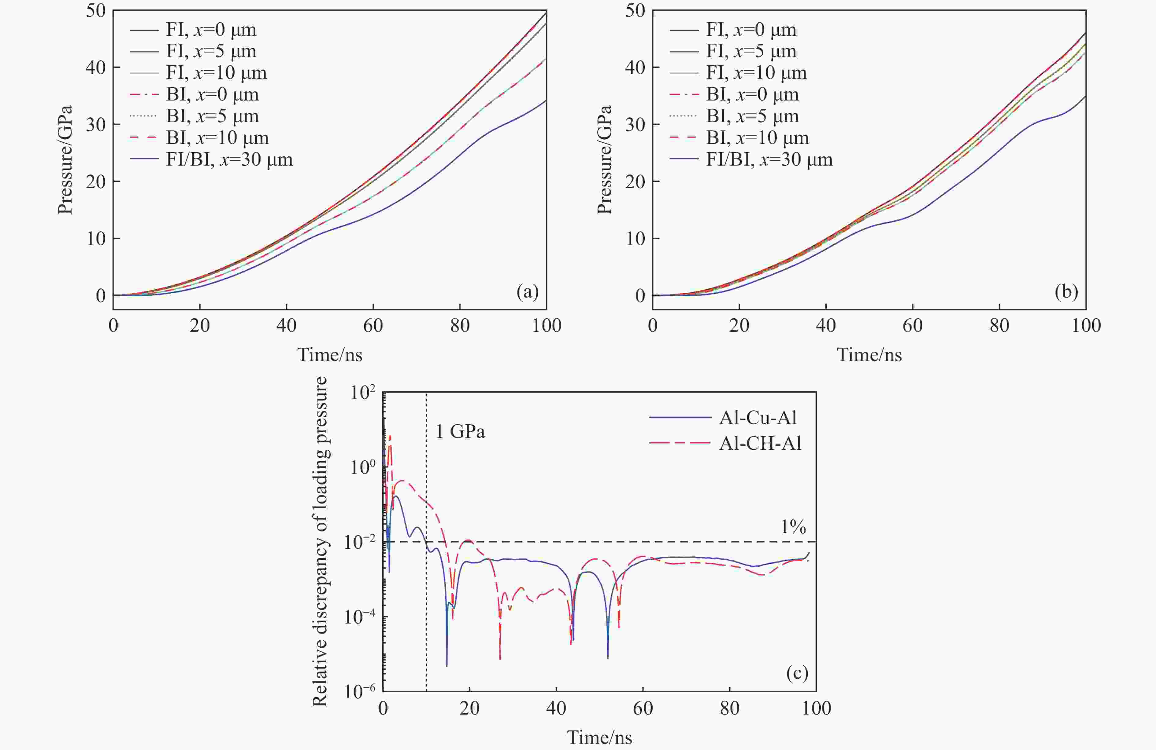 图  以两侧为铝的夹层样品为例的正、反积分法计算得到的各界面的压力历史(从上到下分别为加载面(红色)、夹层前后界面和后测量面(蓝色)):(a) Al-Cu-Al靶材料,Cu材料的阻抗约为两侧Al材料阻抗的3倍;(b) Al-CH-Al靶材料,CH材料的阻抗约为两侧Al材料阻抗的1/3;(c) 反积分法计算的加载面压力与初始加载压力的相对差异