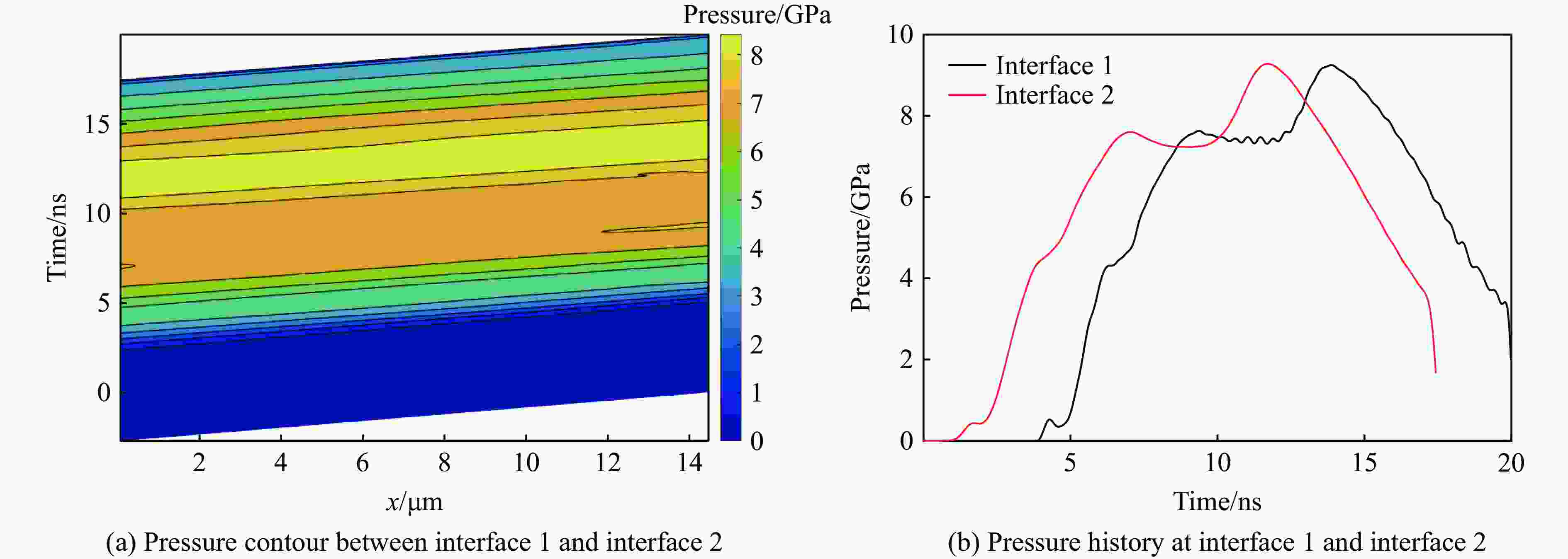 图  激光驱动多层靶反积分计算结果:(a) 压力等高云图,(b)多层靶各界面处压力历史的正、反积分计算结果