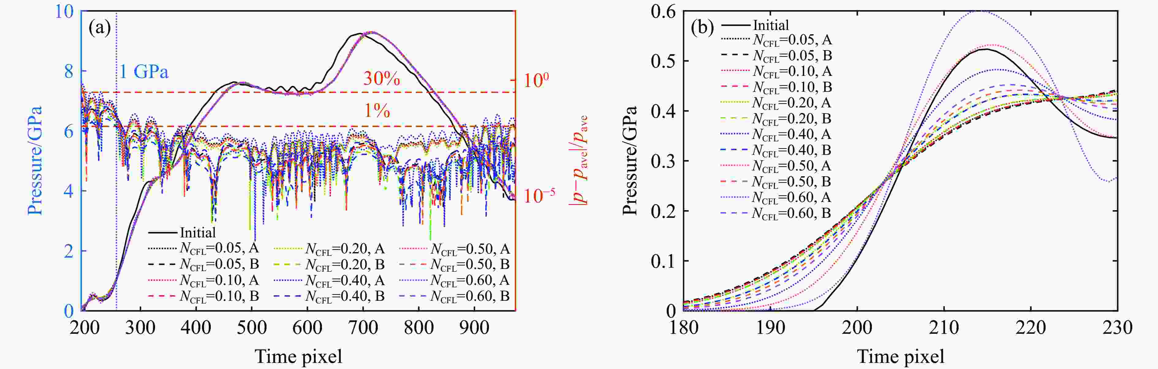 Figure  6.  Multilayer backward integration with different numerical method and CFL number: (a) pressure curve and derivation value, (b) the low-pressure section data with larger deviation