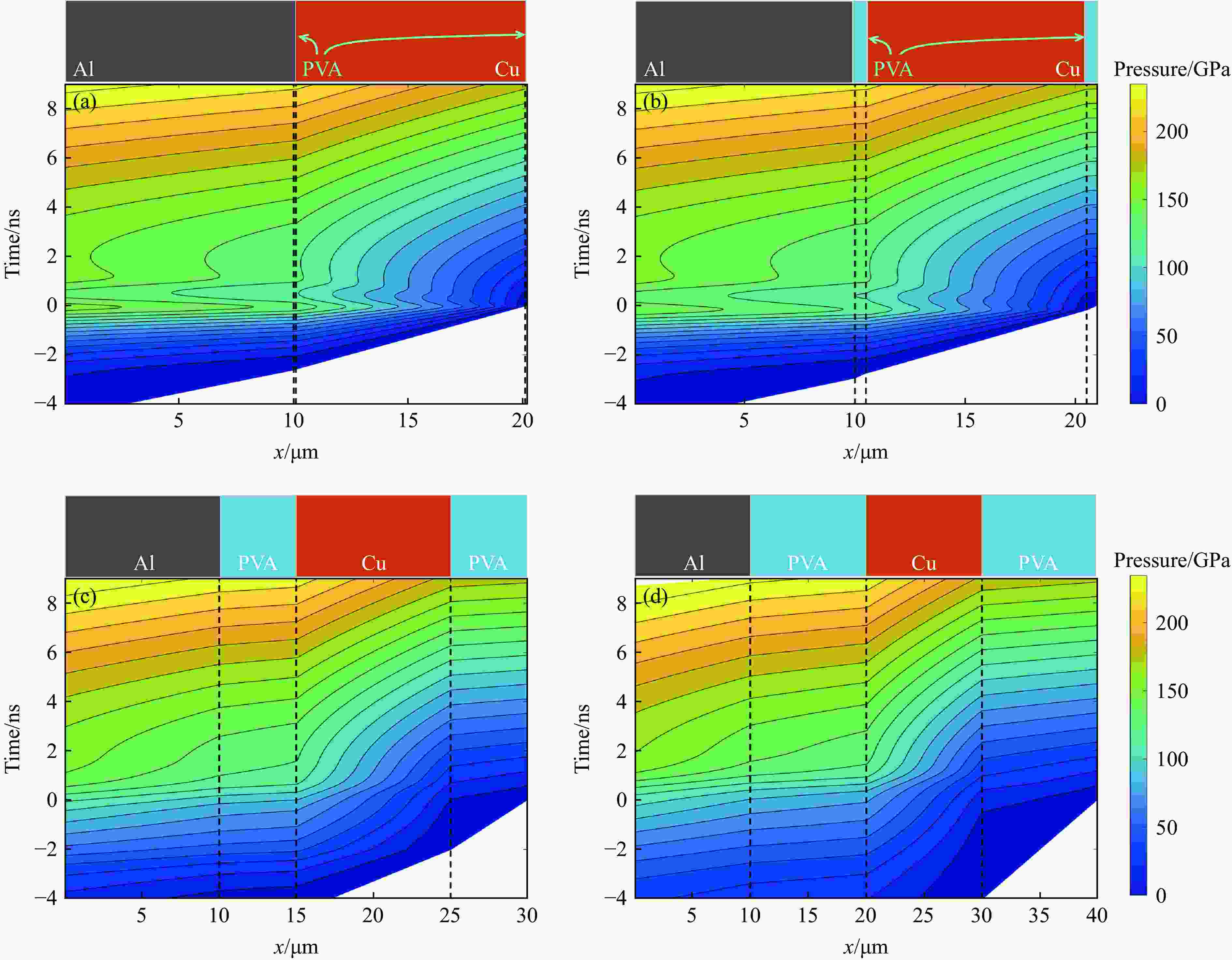 图  考虑不同胶层厚度的多层靶的反积分压力云图:(a) 0.1 $ \text{μ}\mathrm{m} $,(b) 1.0 $ \text{μ}\mathrm{m} $,(c) 5.0 $ \text{μ}\mathrm{m} $,(d) 10.0 $ \text{μ}\mathrm{m} $