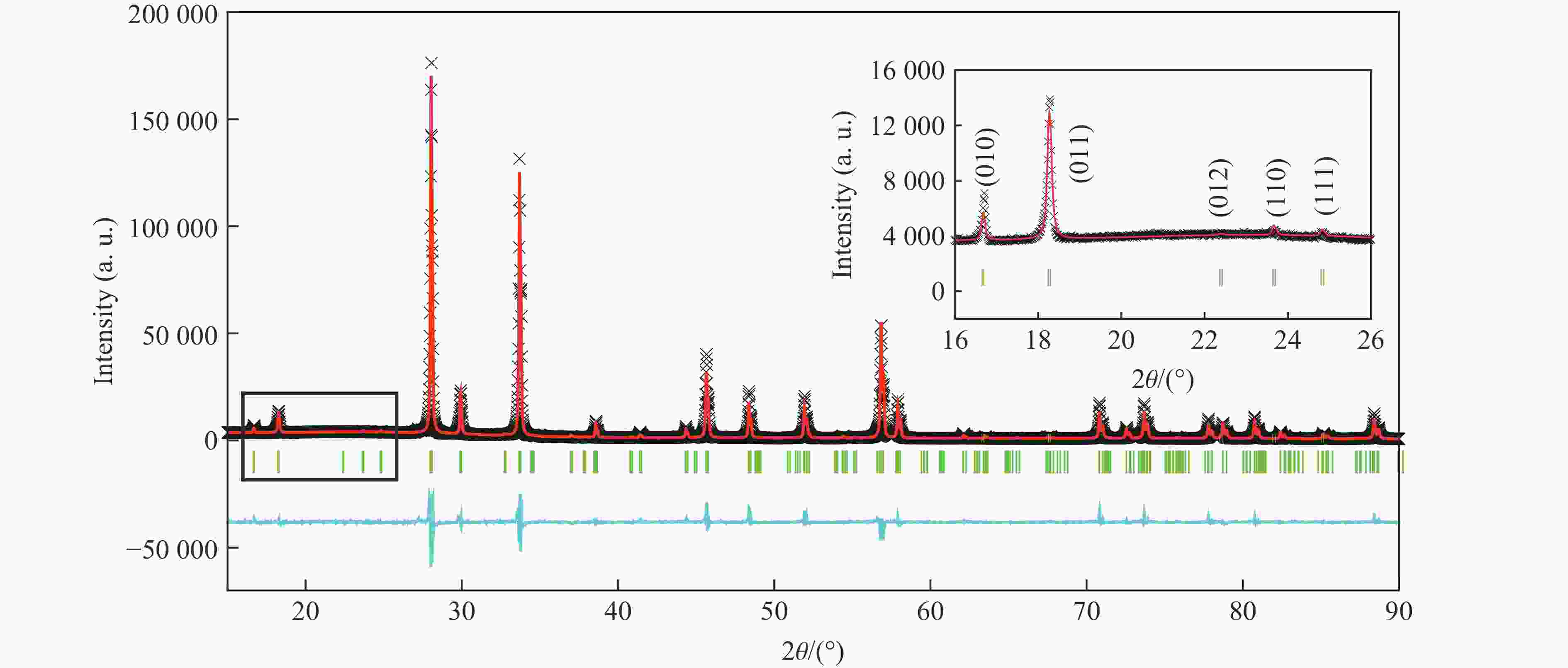 图 2 四方相PbTeO3在常温常压下的XRD谱(λ=1.59059 Å;黑色“×”、红色实线、蓝色实线、绿色“ | ”分别表示实验数据、计算出的衍射图、细化残差和衍射峰位置;插图显示常温常压XRD谱中存在较微弱的(010)和(111)衍射峰)