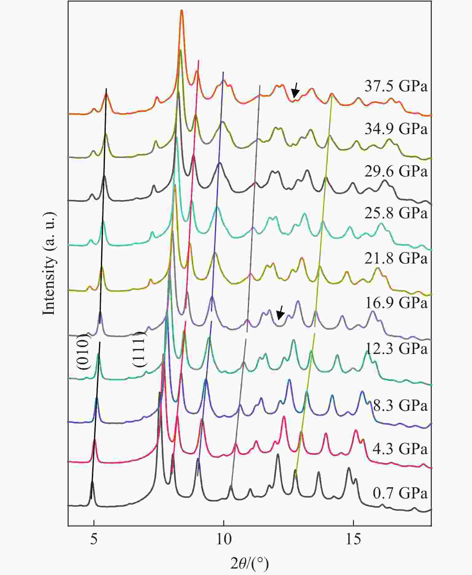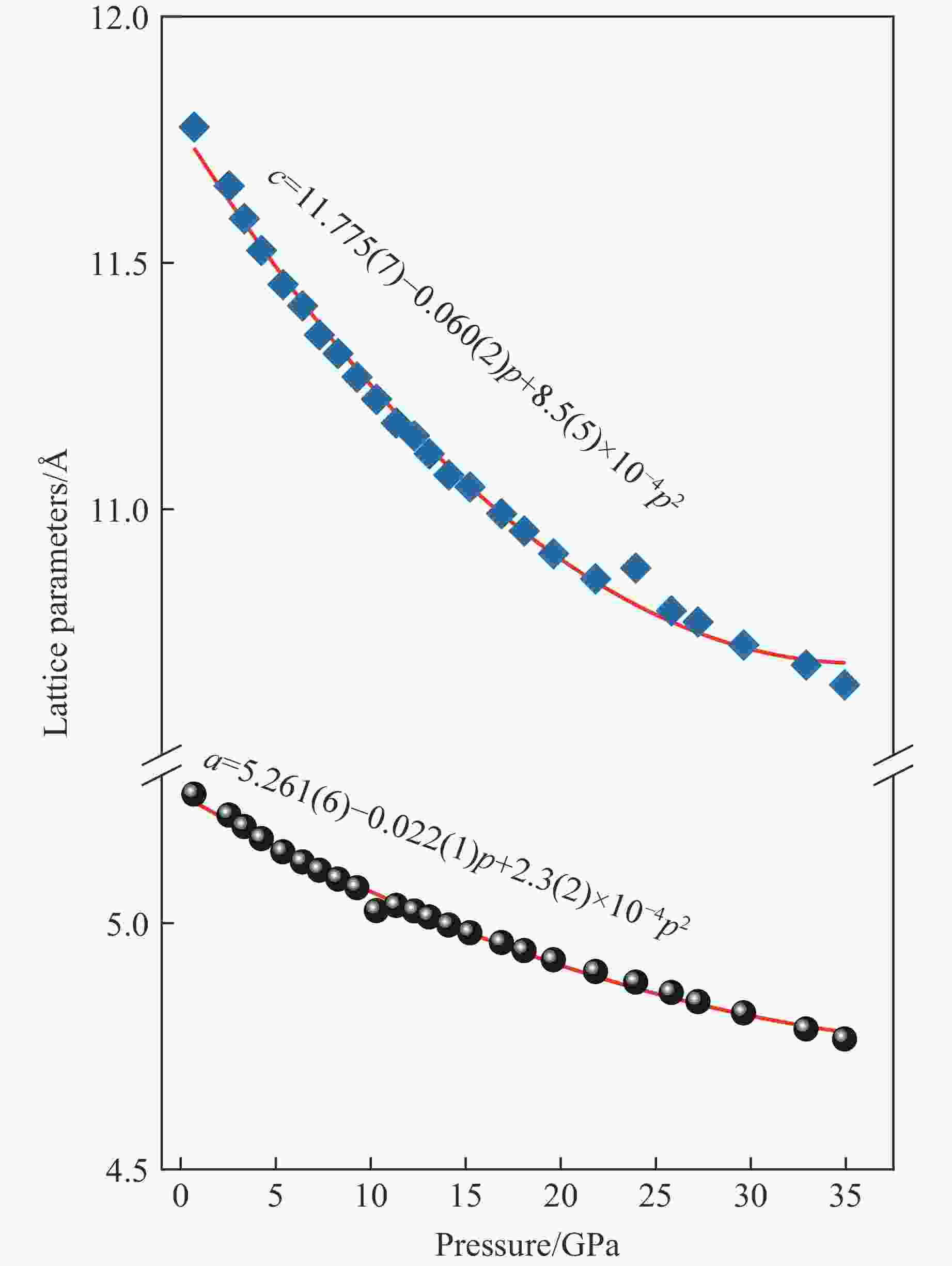 $B_0' $ =5.5(0.2)。晶格参数随压力的变化显示,该晶体在c轴方向更易压缩。Abstract: The millimeter-size tetragonal PbTeO3 single crystal was synthesized by hydrothermal method under saturated vapor pressure of water at 230 °C. Crystal structure, microscopic morphology, thermal stability and other properties of the sample were studied. The compression behavior of the tetragonal PbTeO3 crystal under high pressure was investigated by diamond anvil cell (DAC) with in-situ synchrotron X-ray diffraction. The results show there is no phase transition observed in the tetragonal PbTeO3 up to 37 GPa. Using the Birch-Murnaghan equation of state to fit the observed pressure-volume data of the tetragonal PbTeO3 sample, a bulk modulus B0=42(1) GPa,$ B_0'$ =5.5(0.2) for tetragonal phase was obtained. The variation of lattice parameters with pressure shows that the crystal is easier to compress in the c-axis direction.-