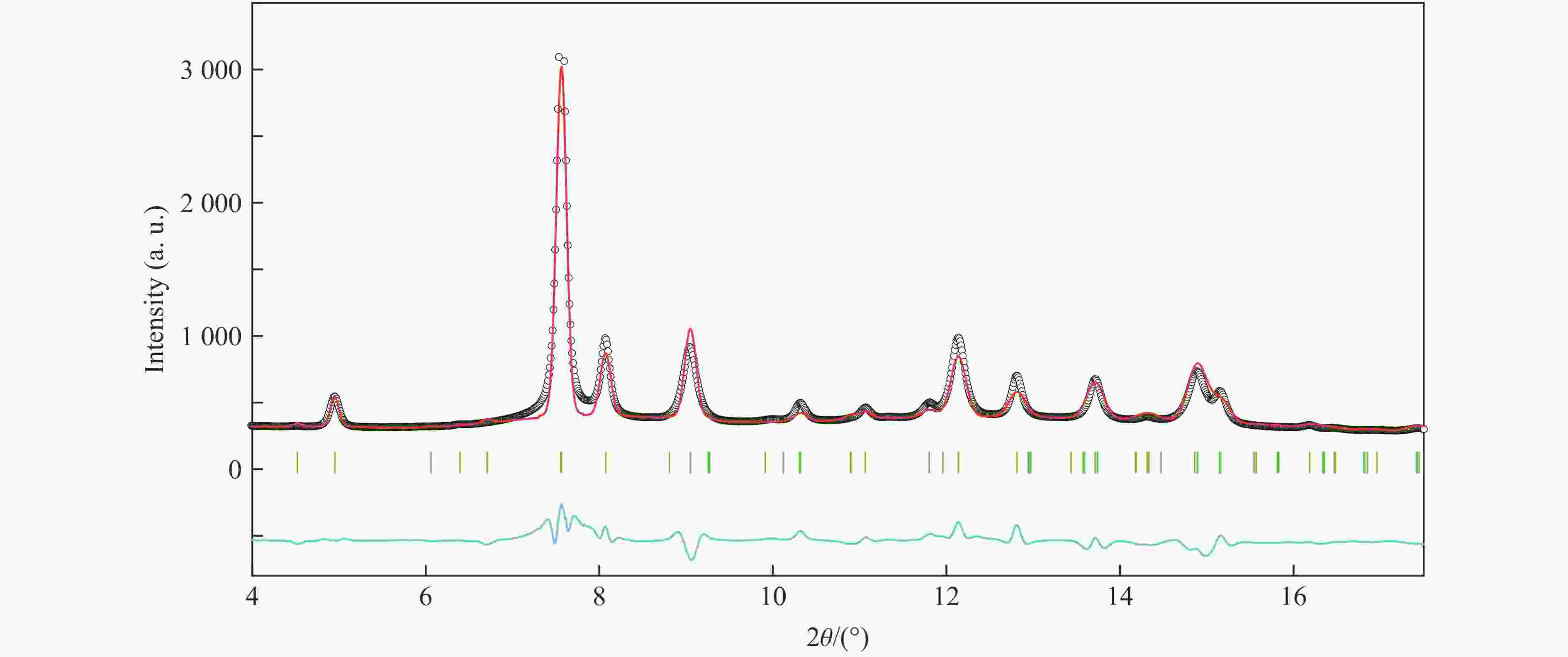 图 8 四方相PbTeO3在37.5 GPa下的XRD谱(λ=0.4133 Å,黑色“×”、红色实线、蓝色实线、绿色 “ | ”分别表示实验数据、计算出的衍射图、细化残差和衍射峰位置)