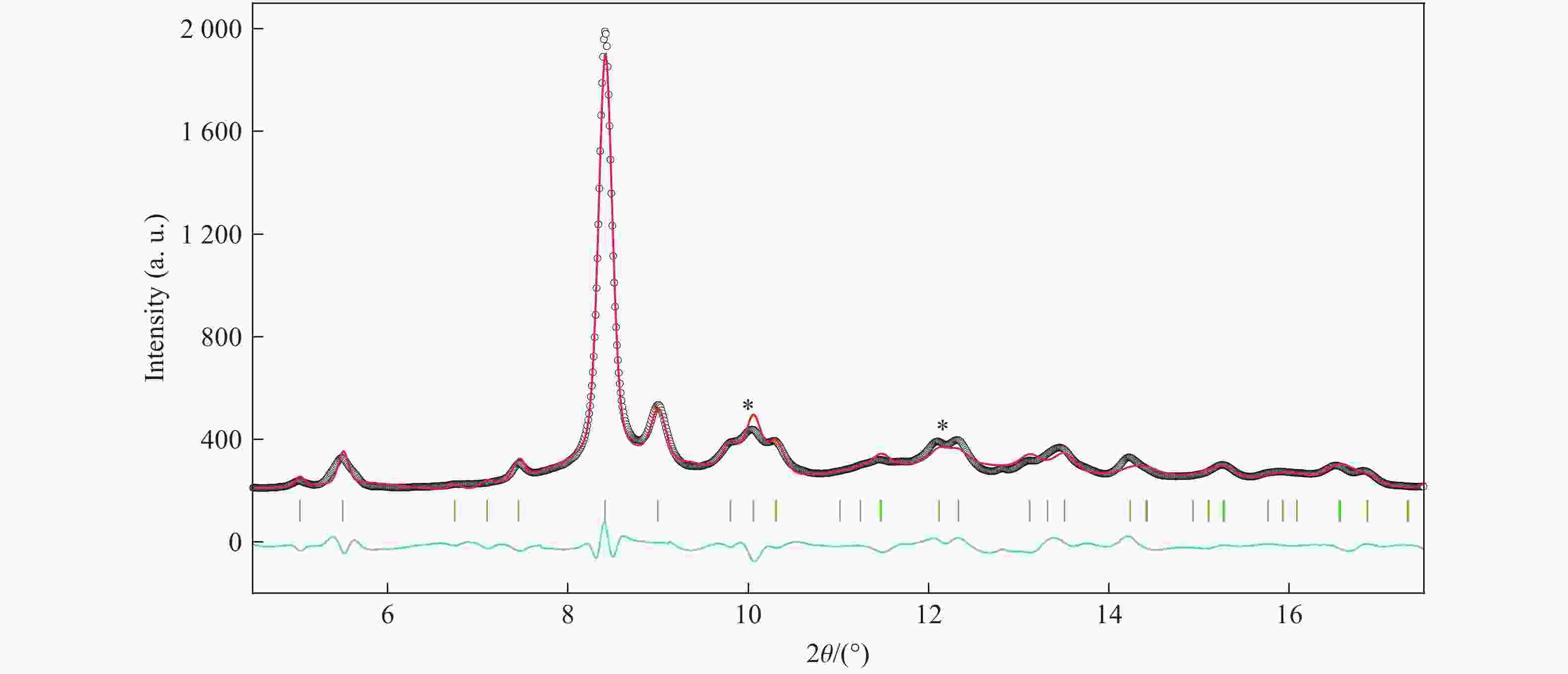 图 7 四方相PbTeO3在0.71 GPa下的XRD谱(λ=0.4133 Å,黑色“×”、红色实线、蓝色实线、绿色“ | ”分别表示实验数据、计算出的衍射图、细化残差和衍射峰位置)