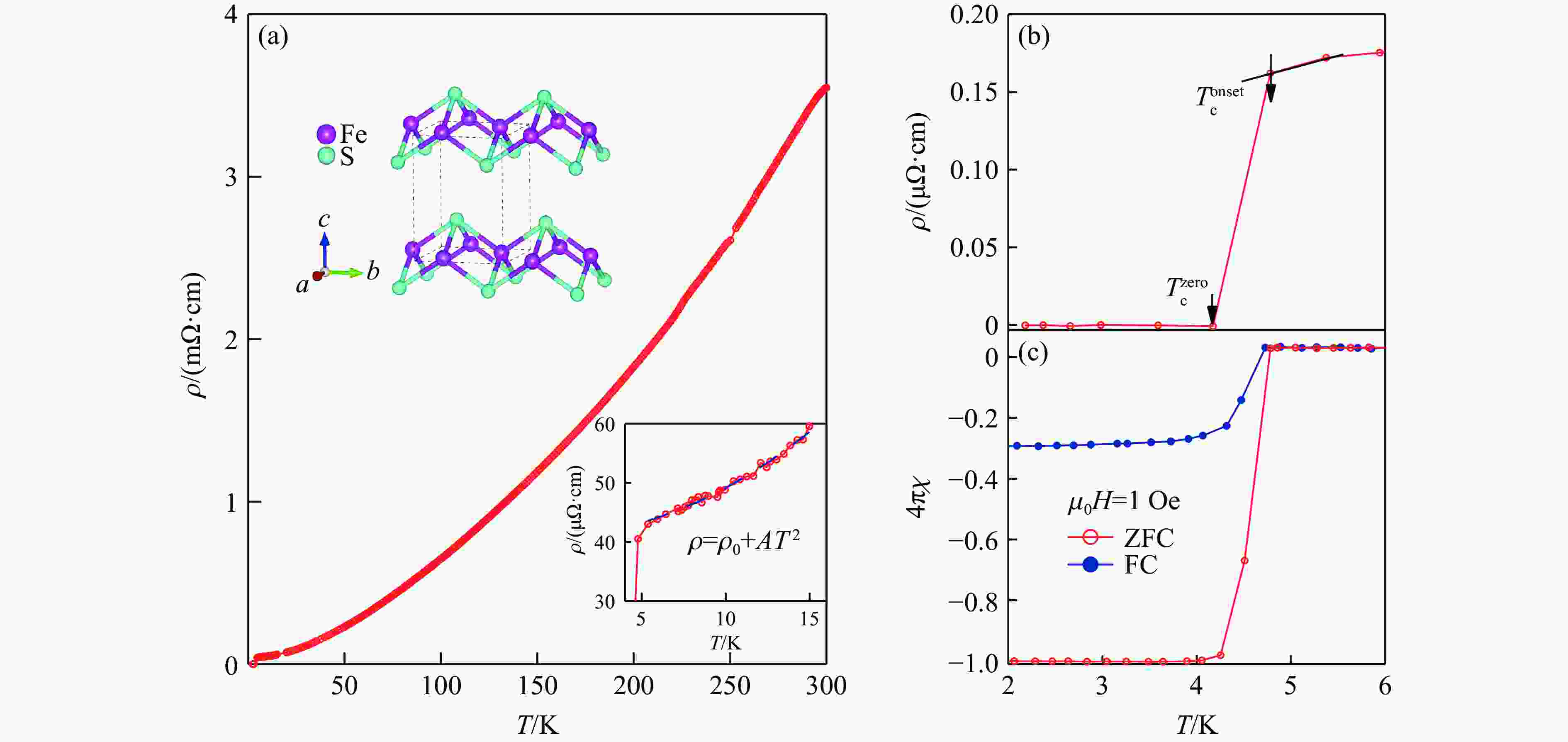图 1 (a) 常压下FeS单晶的变温电阻率ρ(T)曲线(左上插图为FeS的晶体结构示意图,右下插图为FeS的低温电阻率曲线以及ρ(T)=ρ0+AT2的拟合曲线);(b) FeS单晶在低温区的变温电阻率ρ(T);(c) FeS单晶在低温区的ZFC和FC磁化率χ(T)曲线