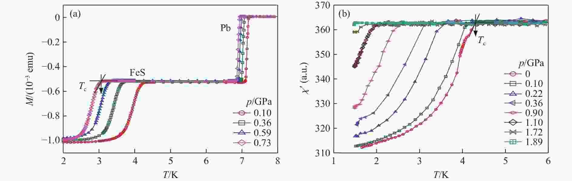 图 2 高压下FeS单晶的直流和交流磁化率:(a) 采用微型活塞-圆筒压腔测试的零场冷直流磁化曲线;(b) 采用活塞-圆筒压腔测试的交流磁化率
