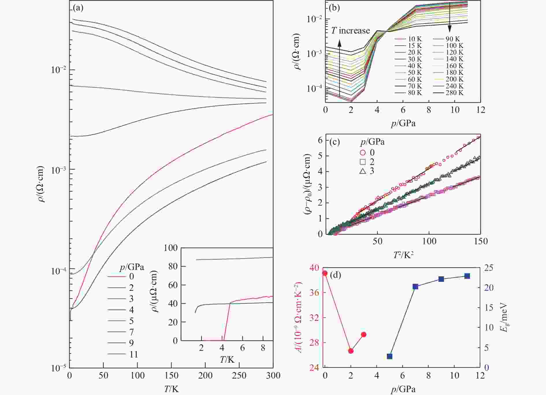 图 3 (a) 利用六面砧测试的FeS单晶在不同压力下的变温电阻率曲线(右下插图显示了低压区电阻率数据);(b) FeS单晶在不同温度下的电阻率随压力的变化关系;(c) 0~3 GPa压力范围内FeS单晶的低温电阻率与T2的依赖关系;(d) FeS单晶在低压区的低温电阻率拟合参数A和高压区由热激活模型拟合的能隙随压力的演化关系