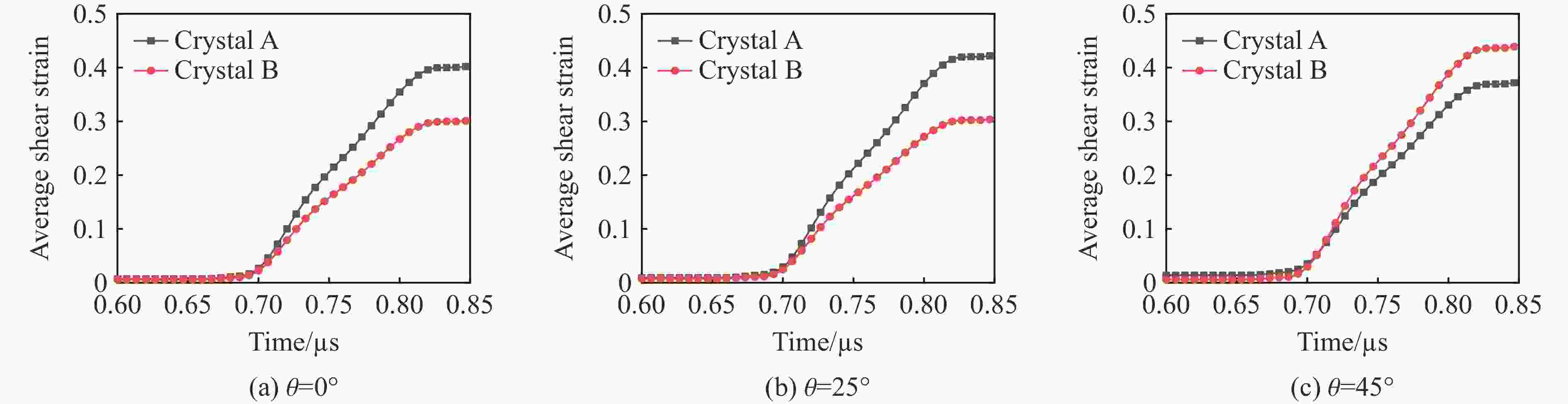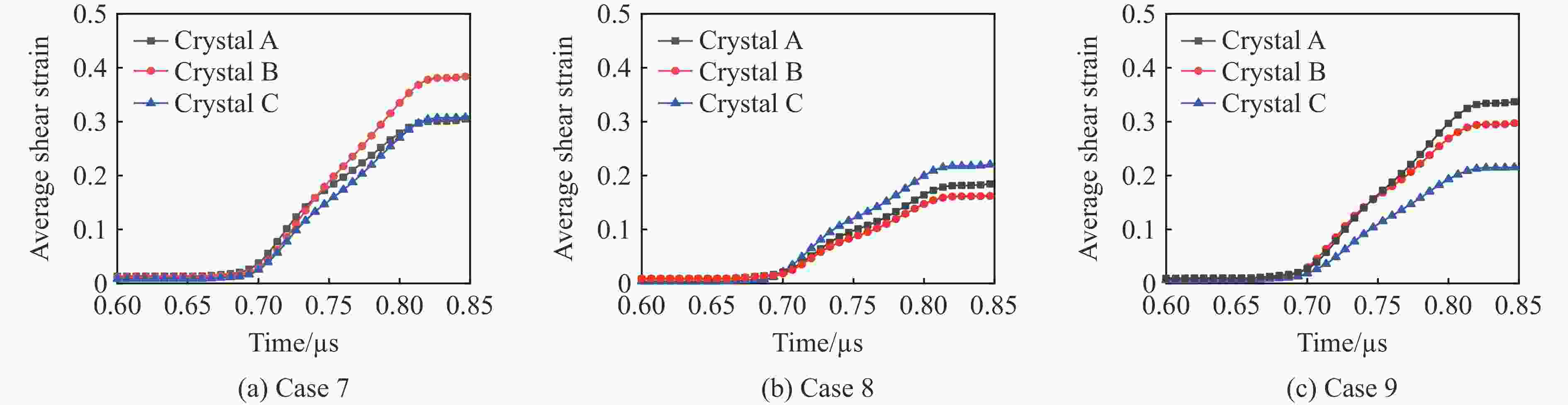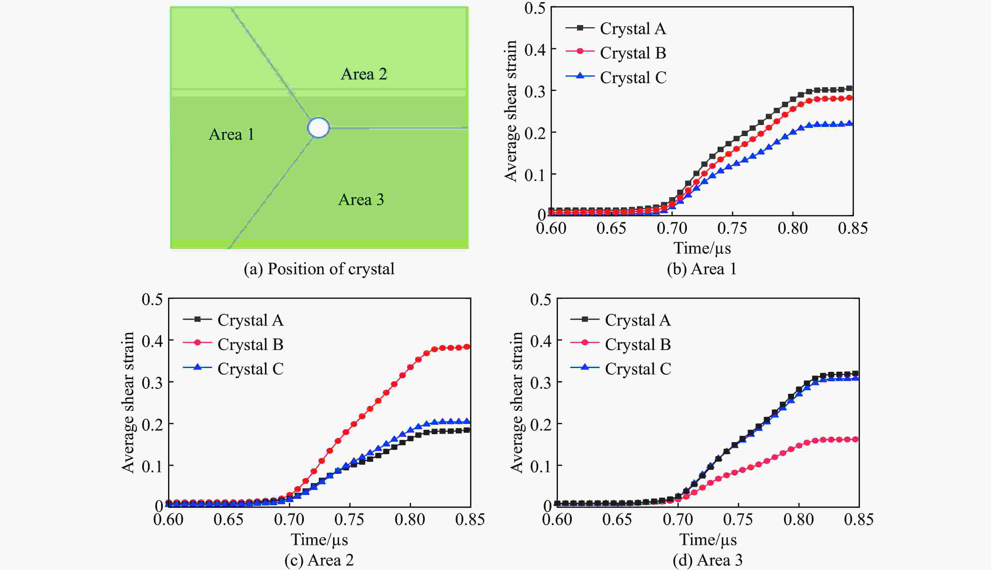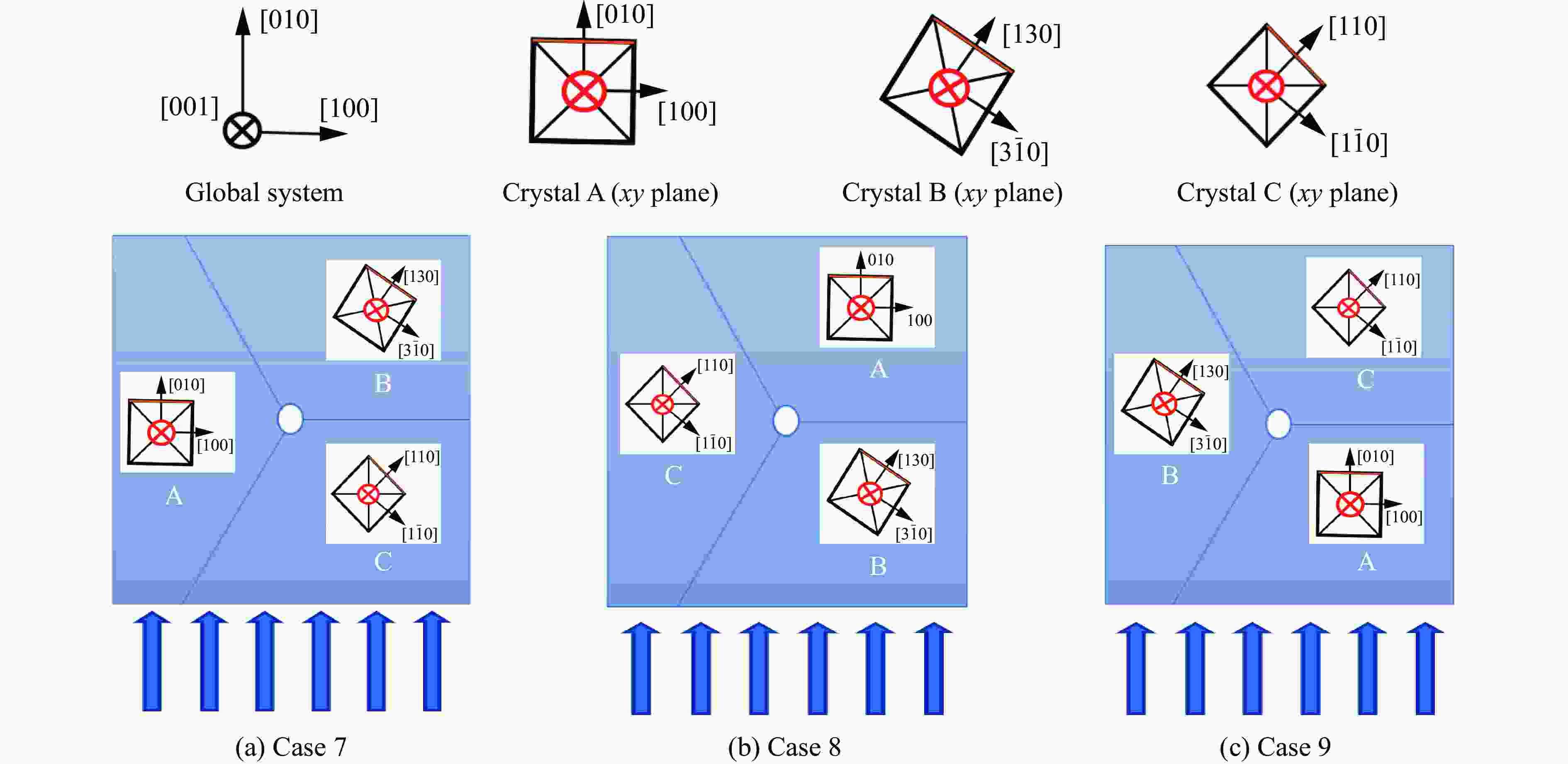 • 摘要: 采用率相关的晶体塑性本构模型研究了冲击荷载作用下晶体取向对面心立方金属内部孔洞增长的影响。利用VUMAT子程序,将率相关晶体塑性本构模型嵌入ABAQUS有限元软件中,分析了单晶晶内孔洞、双晶晶界孔洞和三角晶界孔洞的增长行为,结果显示:孔洞的变形模式与晶体取向、晶界位置(冲击加载方向与晶界的相对方位)、加载方向相关,晶体的滑移线模型与晶界位置之间的关系可以反映孔洞增长方向。对于晶内孔洞,加载方向越接近[011],孔洞开始增长变形时间越晚,但孔洞的总体增长变形越大;加载方向越接近[111],孔洞开始增长变形时间越早,但孔洞的总体增长变形越小。对于晶界处孔洞,晶界位置影响孔洞的部分变形,但不会影响总体变形。晶体受冲击之后,若孔洞增长方向沿晶内,则晶界会促进孔洞沿晶内增长;若增长方向沿晶界,则晶界会促进孔洞沿晶界方向增长,抑制其向晶内增长。