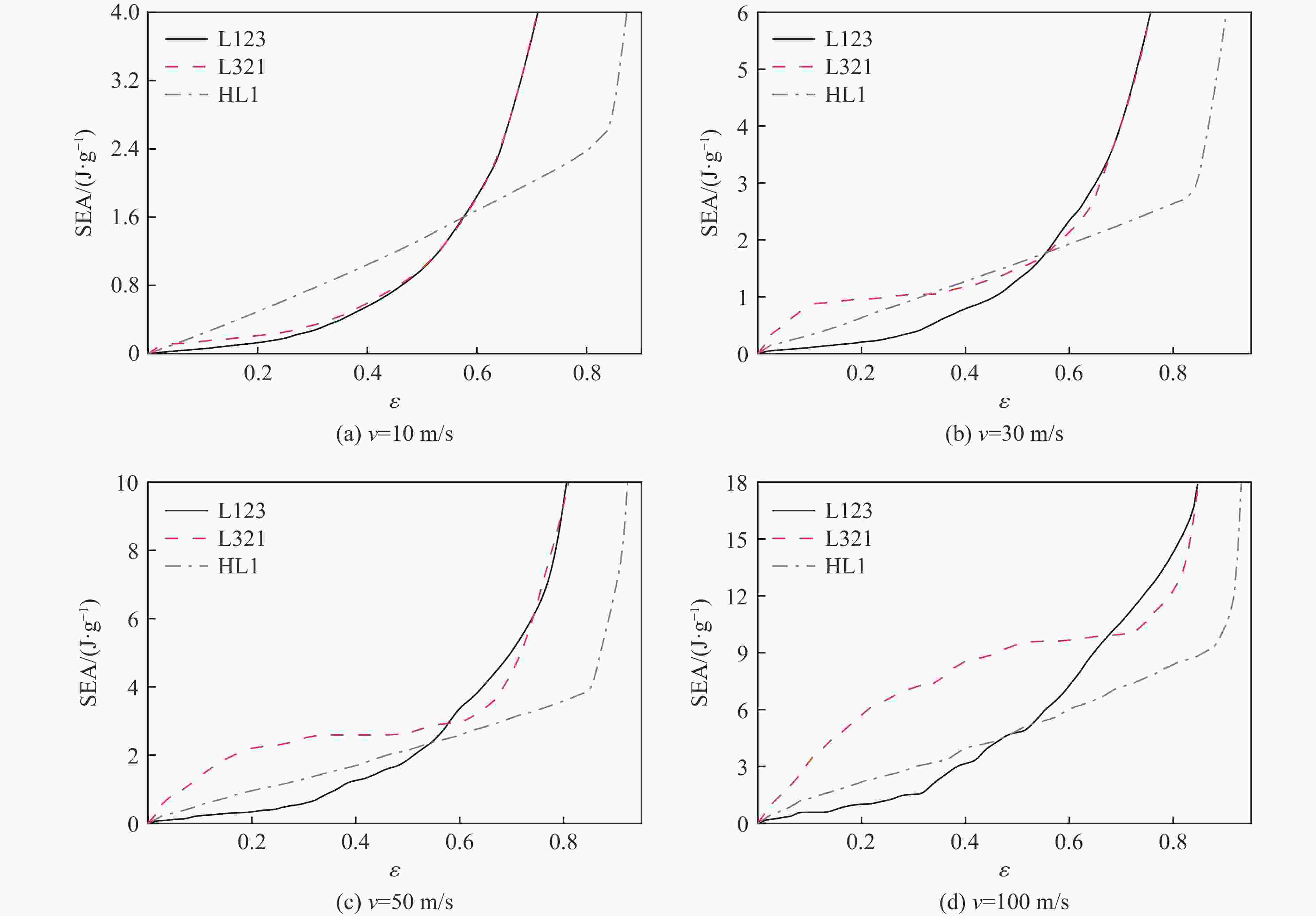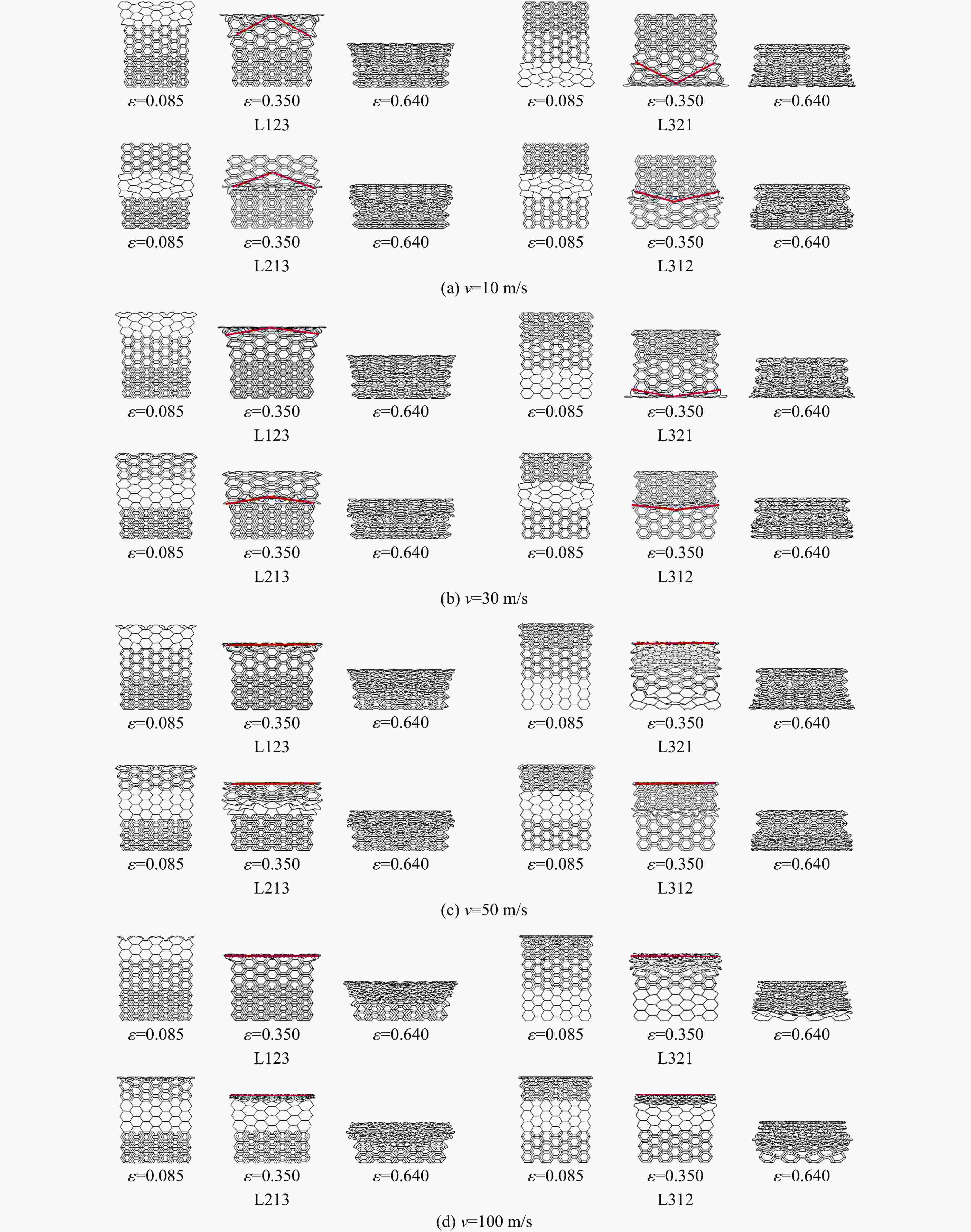 Structure l/mm t/mm h/mm α/(°) HL1 5.00 0.30 120 HL2 3.50 0.30 1.15 120 HL3 2.00 0.30 1.15 120 Material ρ/(kg·m–3) E/GPa μ σy/MPa Aluminum 2 700 69 0.3 76 Rigid plate 7 800 210 表 3 不同速度下层级梯度蜂窝的密实应变