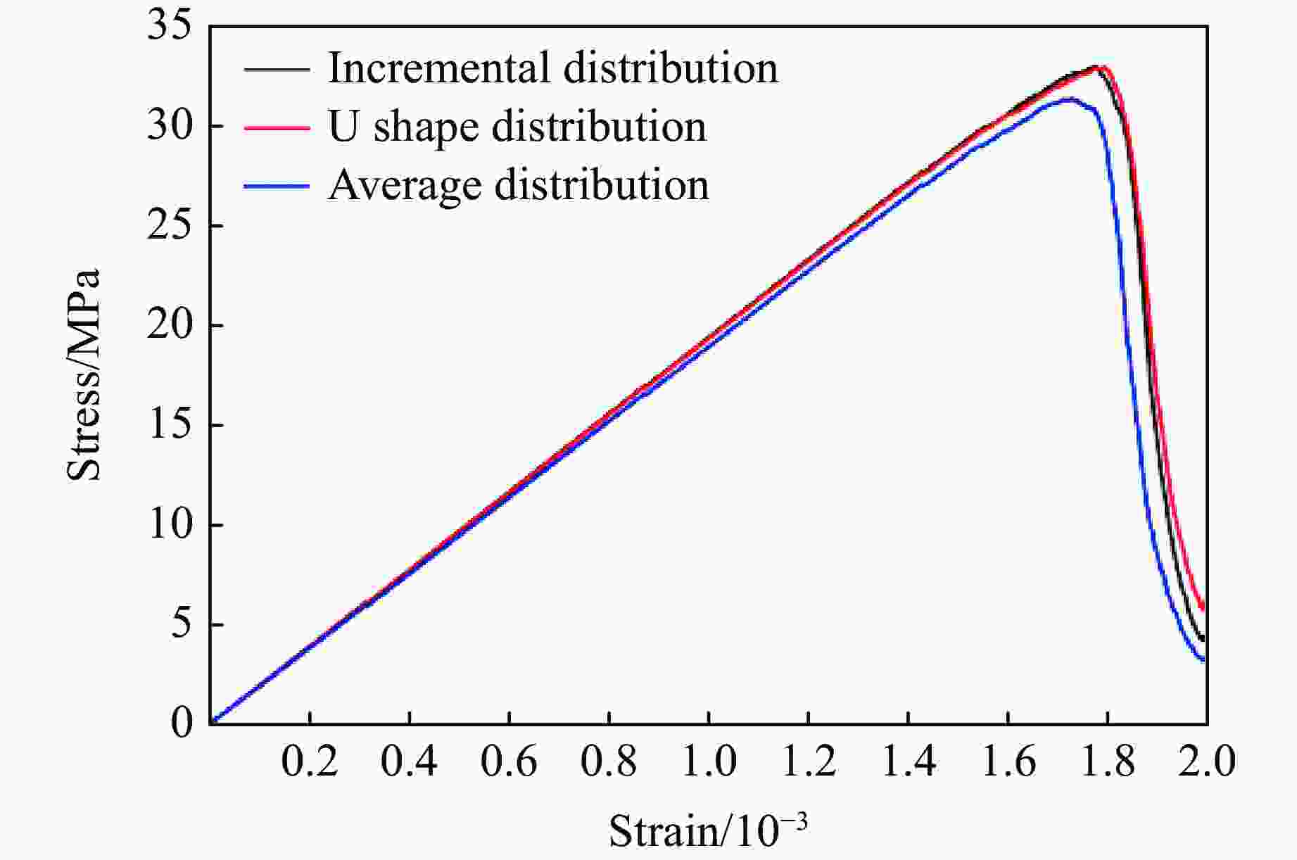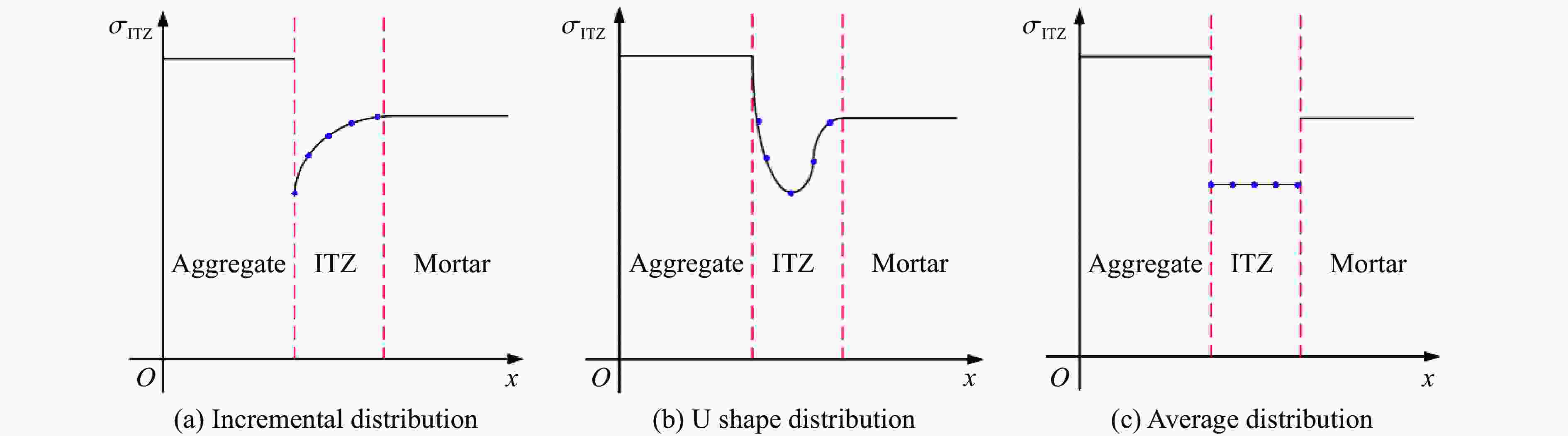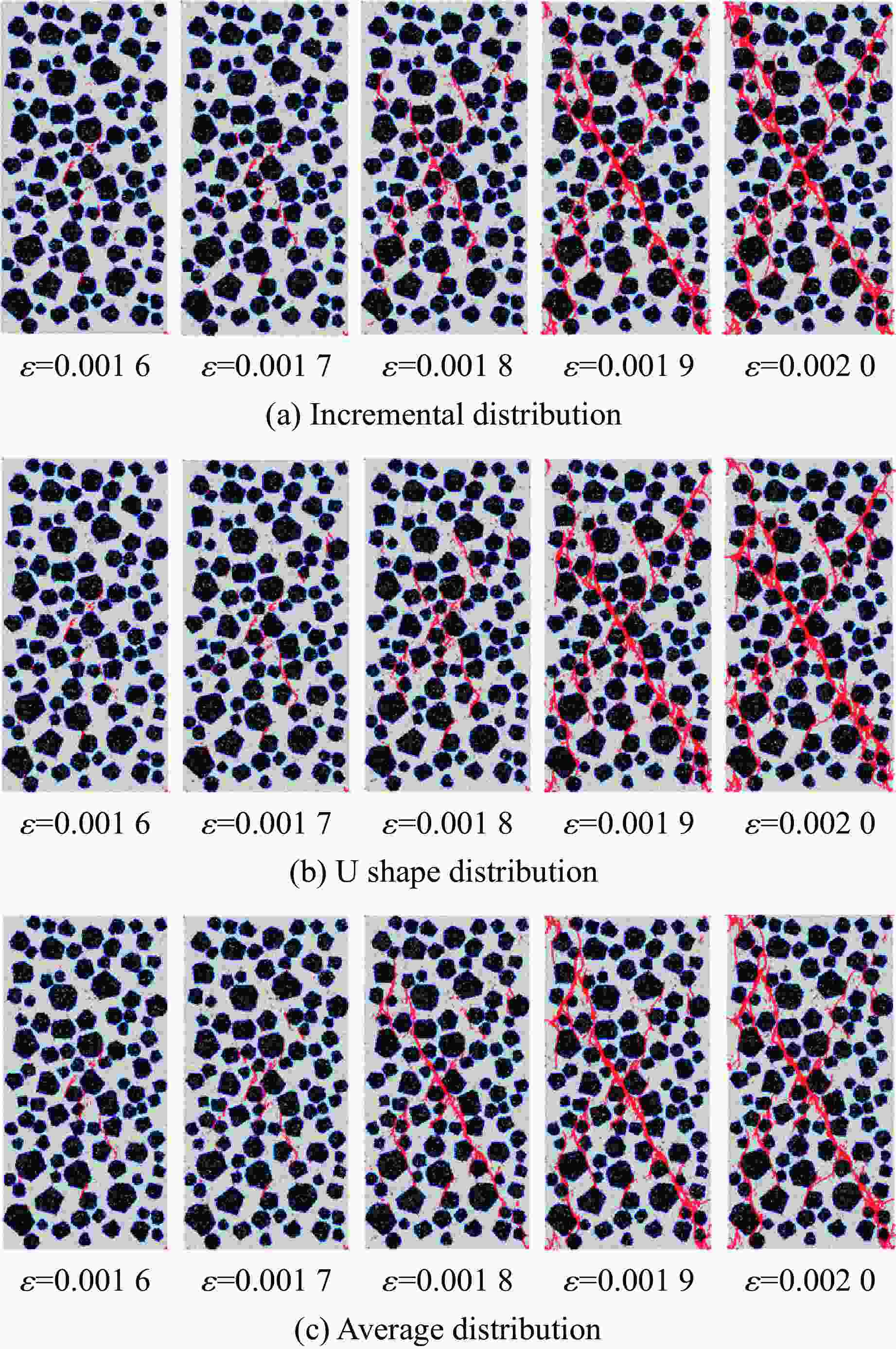 Distribution mode ITZ layer σITZ/σmortar Distribution mode ITZ layer σITZ/σmortar Incremental distribution ITZ 1 0.80 Average distribution ITZ 1 0.80 ITZ 2 0.86 ITZ 2 0.80 ITZ 3 0.90 ITZ 3 0.80 ITZ 4 0.94 ITZ 4 0.80 ITZ 5 0.98 ITZ 5 0.80 U shape distribution ITZ 1 0.90 ITZ 2 0.85 ITZ 3 0.80 ITZ 4 0.90 ITZ 5 0.98 表 2 5组模型中ITZ与砂浆的强度比