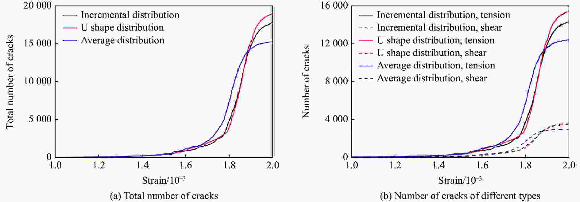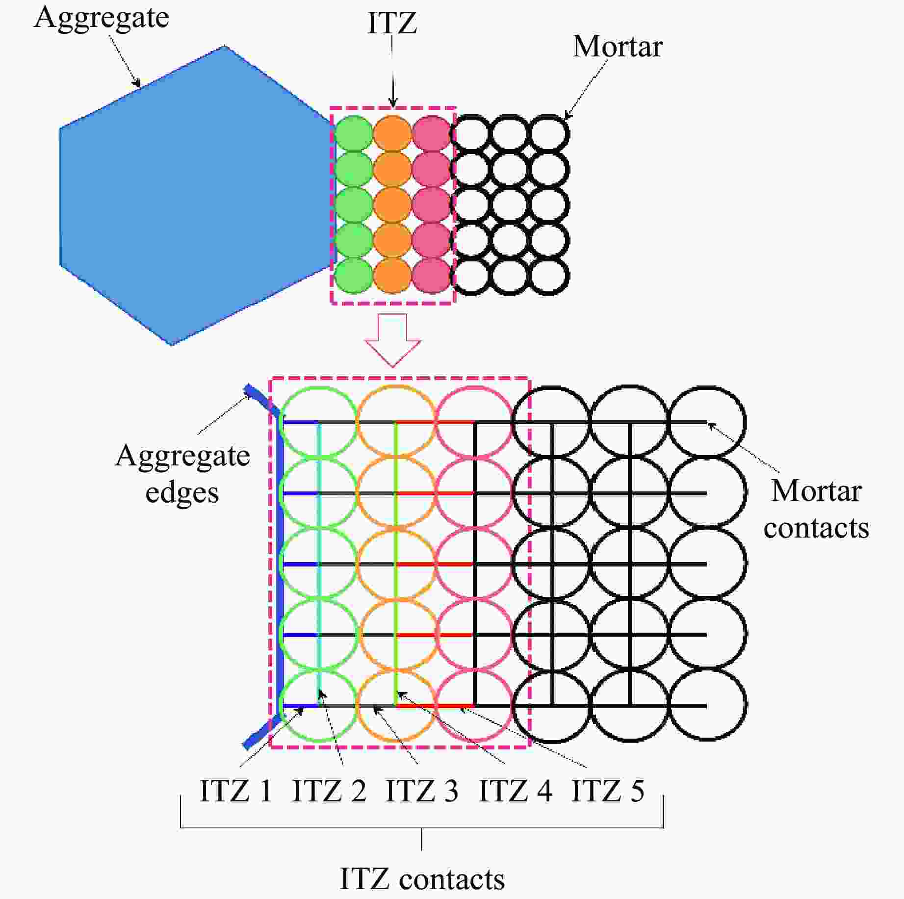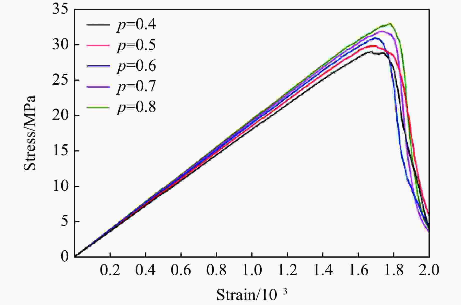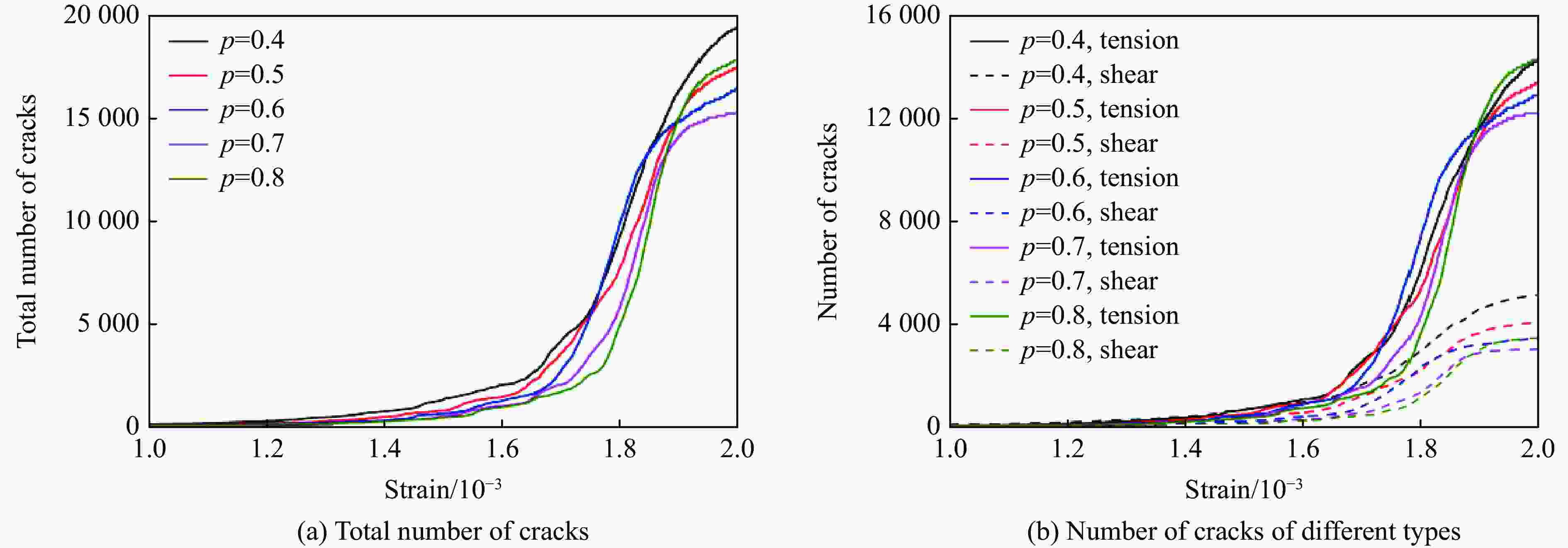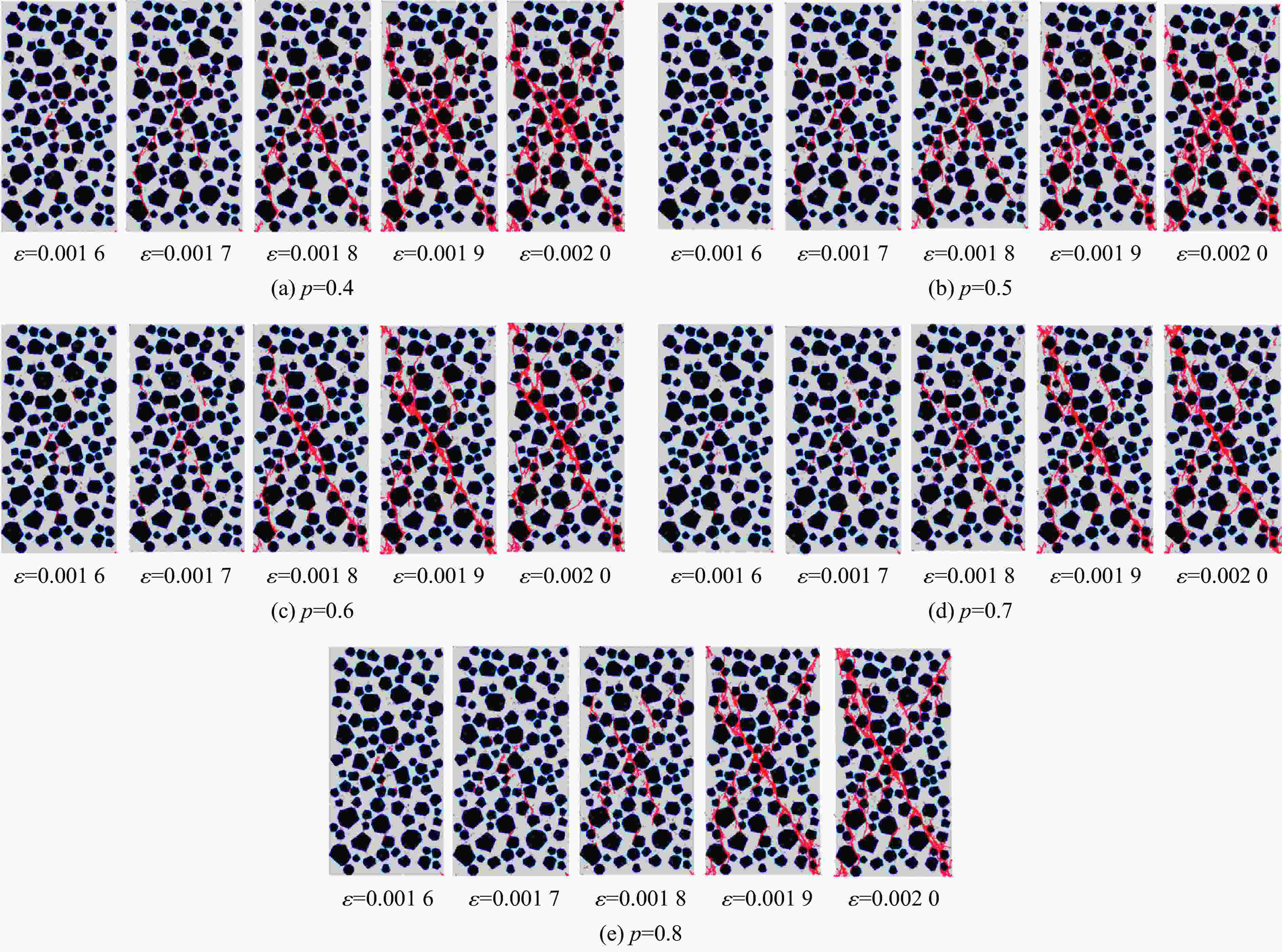 Model p ITZ layer σITZ/σmortar 1 0.40 ITZ 1 0.40 ITZ 2 0.65 ITZ 3 0.80 ITZ 4 0.90 ITZ 5 0.98 2 0.50 ITZ 1 0.50 ITZ 2 0.70 ITZ 3 0.83 ITZ 4 0.91 ITZ 5 0.98 3 0.60 ITZ 1 0.60 ITZ 2 0.75 ITZ 3 0.85 ITZ 4 0.92 ITZ 5 0.98 4 0.70 ITZ 1 0.70 ITZ 2 0.80 ITZ 3 0.88 ITZ 4 0.93 ITZ 5 0.98 5 0.80 ITZ 1 0.80 ITZ 2 0.86 ITZ 3 0.90 ITZ 4 0.94 ITZ 5 0.98 表 3 接触细观参数
