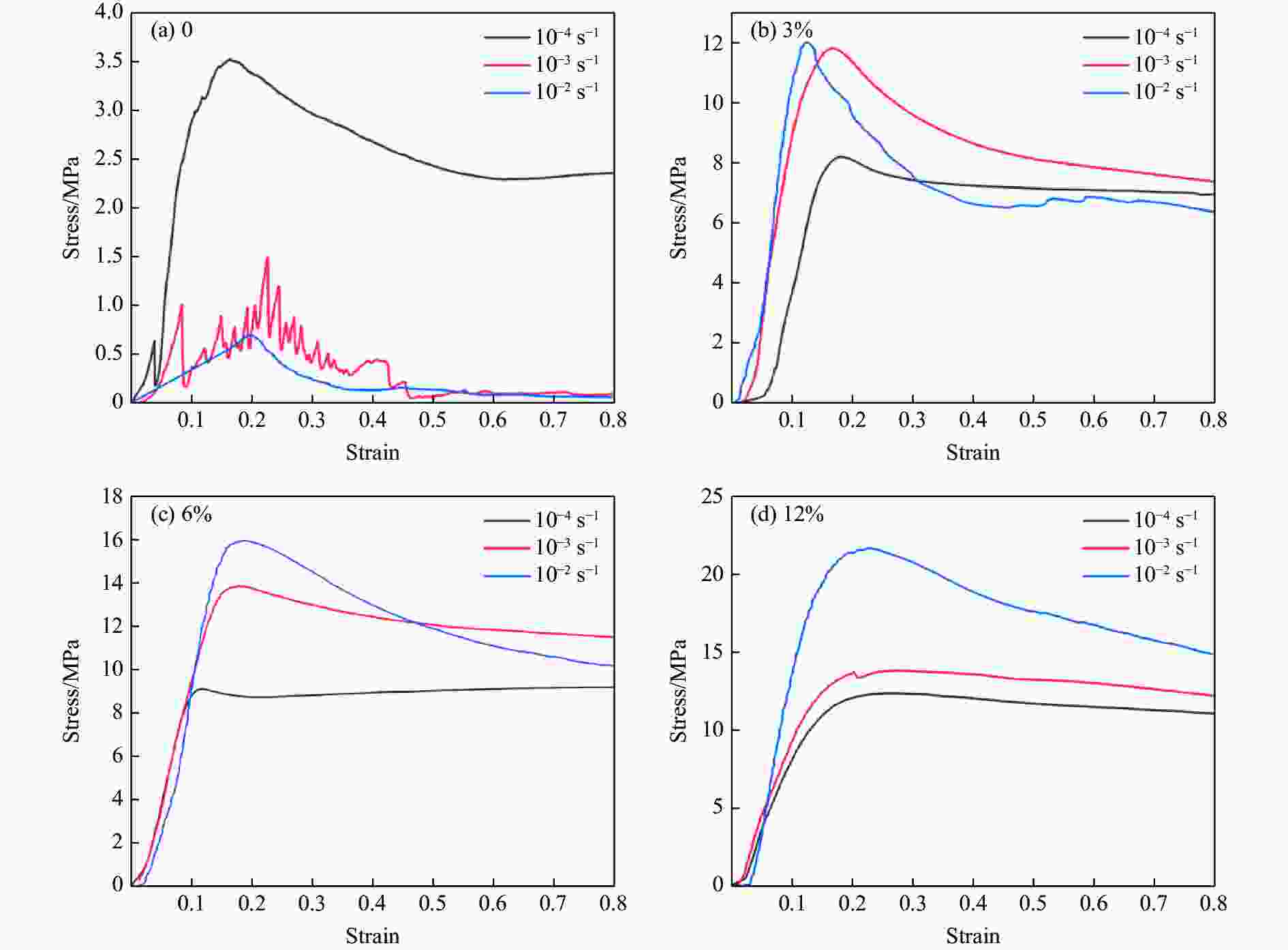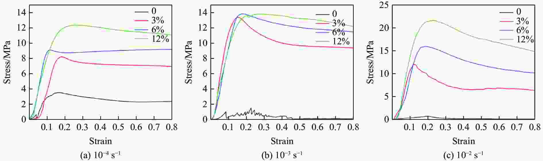 Strain rates/s−1 Cotton fiber mass fraction/% Specimen size Mean yield strength/MPa Diameter/mm Height/mm 10−4 0 16 7 4.47 0 18 8 3.74 3 16 7 8.43 3 18 8 8.62 6 16 7 9.70 6 18 8 8.92 12 16 7 12.75 12 18 8 11.53 10−3 0 16 7 1.20 0 18 8 1.56 3 16 7 12.24 3 18 8 12.15 6 16 7 15.40 6 18 8 14.05 12 16 7 16.80 12 18 8 13.80 10−2 0 16 7 0.76 0 18 8 0.77 3 16 7 13.79 3 18 8 12.50 6 16 7 20.00 6 18 8 15.43 12 16 7 20.10 12 18 8 21.67 -