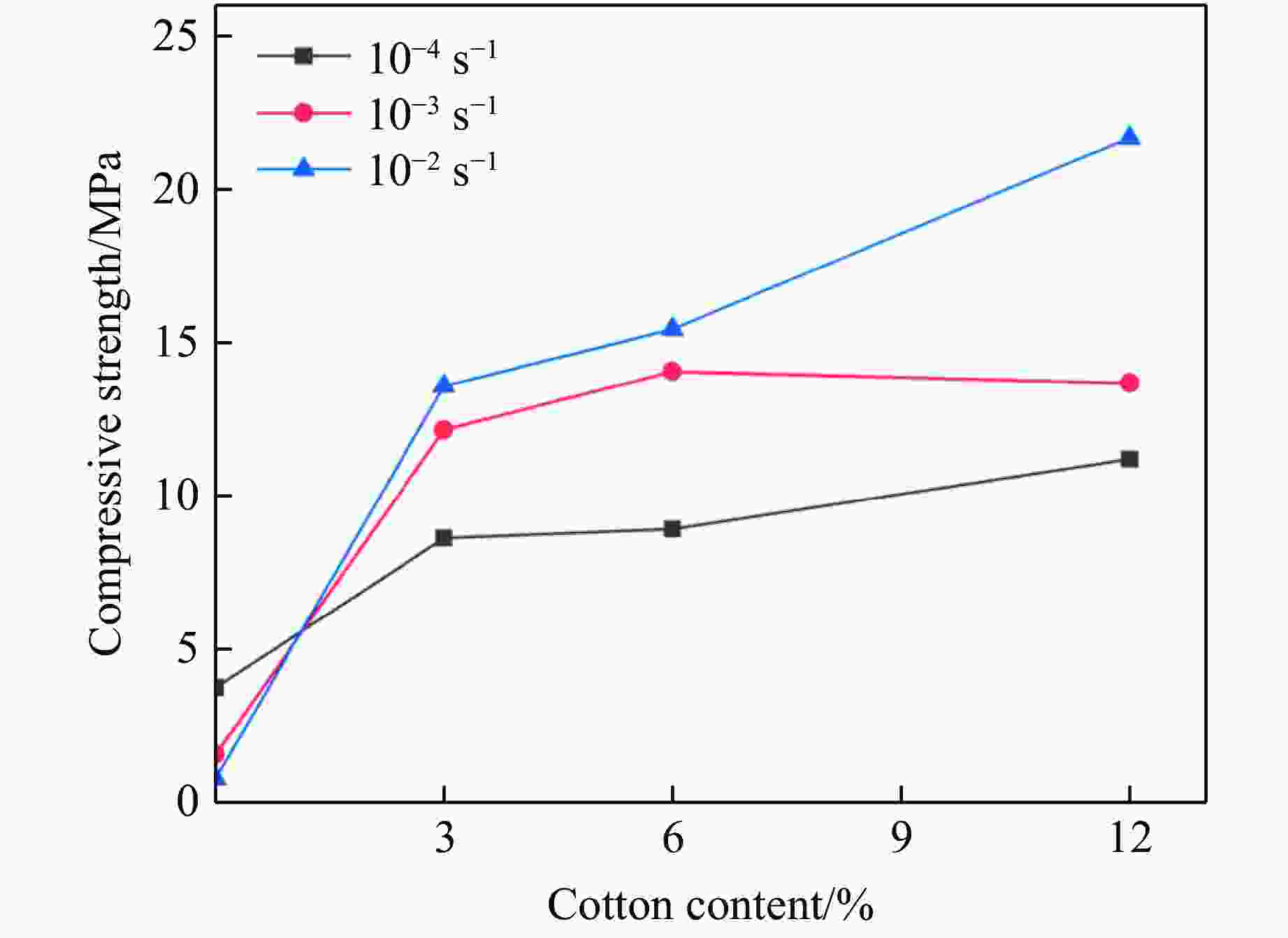 Cotton fiber mass fraction/% Strain rates/s−1 Compressive yield strength/MPa Change/% 0 10−4 3.744 10−3 1.563 −58.20 10−2 0.770 −50.75 3 10−4 8.920 10−3 12.150 36.21 10−2 12.495 2.84 6 10−4 8.920 10−3 14.050 57.51 10−2 15.425 9.79 12 10−4 11.200 10−3 13.673 22.08 10−2 21.670 58.49 表 4 试件尺寸及屈服强度