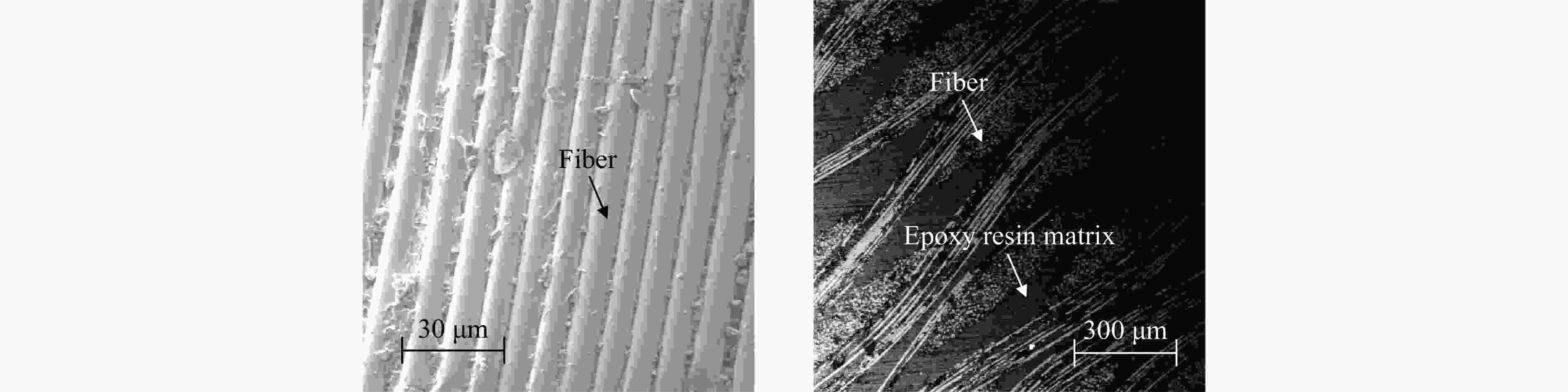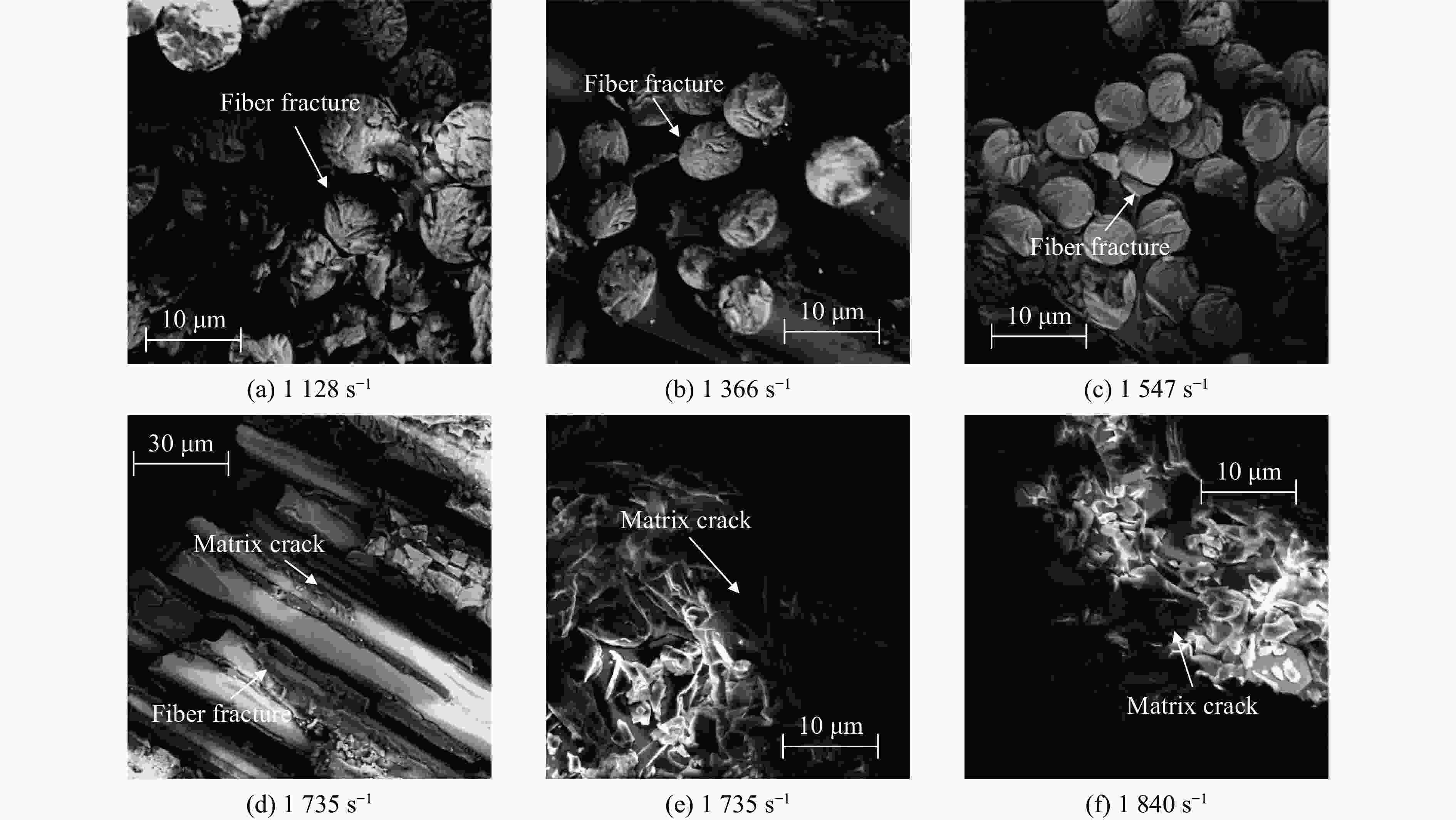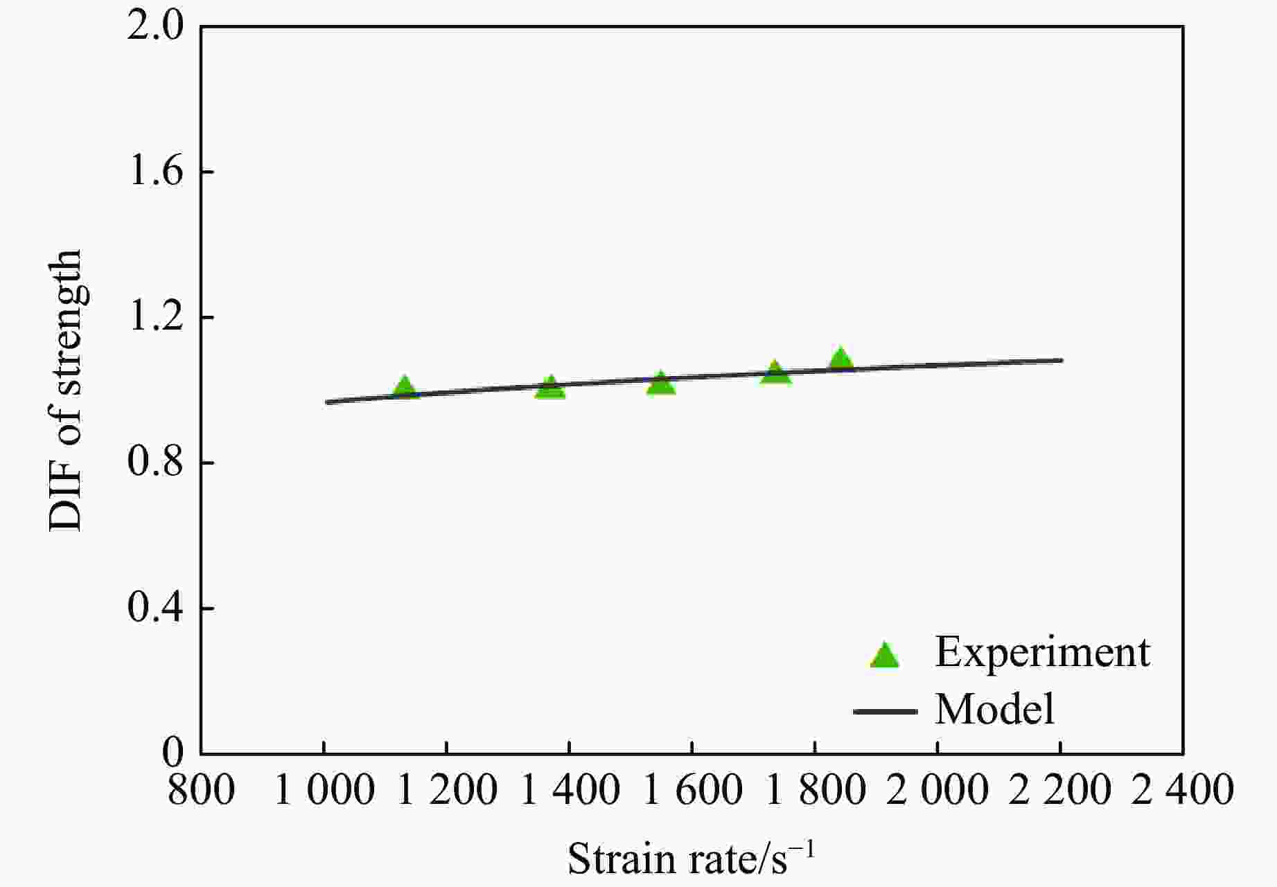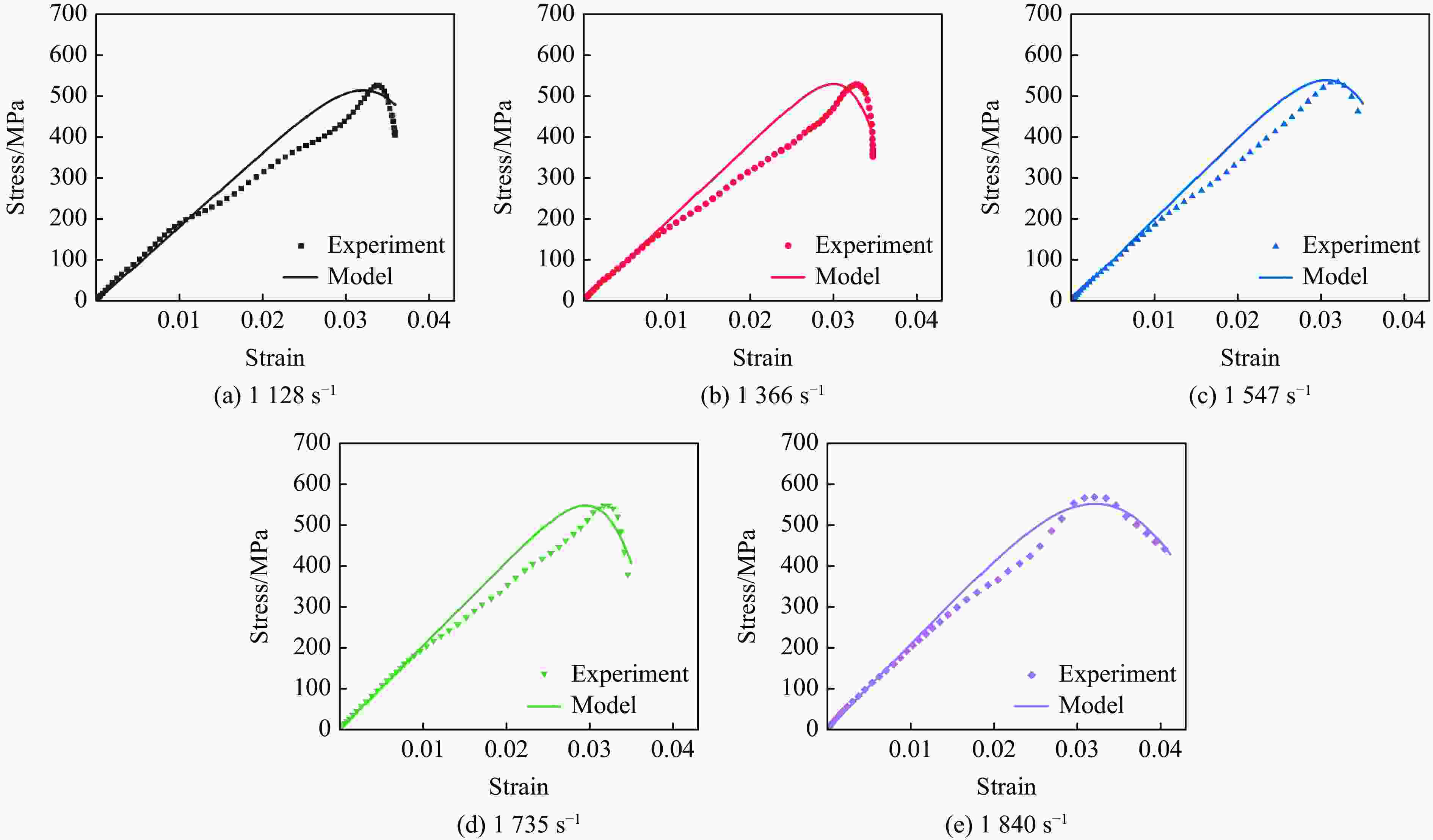 摘要: 为系统地研究环氧树脂玻璃钢在静、动态拉伸载荷作用下的力学性能,采用材料测试系统和分离式霍普金森拉杆对材料进行拉伸试验,获得0.001~0.1 s−1及1128~1840 s−1应变率下的应力-应变曲线和相应的力学参数。结果表明,动态加载下环氧树脂玻璃钢的应变率增强效应较为明显。为此,引入动态增强因子描述环氧树脂玻璃钢在高应变率下力学性能的增强。采用扫描电镜对损伤断面进行观测,发现动态加载下纤维束平整断裂,而非静态加载下纤维拔出失效。相较于静态加载,动态拉伸载荷作用下玻璃钢的基体-纤维界面断裂韧度更高。基于环氧树脂玻璃钢在动态拉伸下的力学响应,引入宏观损伤累积量,建立一种考虑损伤的非线性拉伸本构模型。拟合结果表明,该模型整体上可以反映环氧树脂玻璃钢在动态拉伸载荷作用下的力学响应。Abstract: To systematically study the mechanical properties of glass fiber reinforced plastics, the stress-strain curves and corresponding mechanical parameters of glass fiber reinforced plastic with strain rates of 0.001–0.1 s−1 and 1128–1840 s−1 were obtained by material testing system (MTS) and split Hopkinson tensile bar (SHTB). The results show that the glass fiber reinforced plastic exhibits significant strain rate strengthening effect under dynamic loading. Therefore, the dynamic increasing factor was introduced to describe the strengthening effect of strain rate on mechanical properties of glass fiber reinforced plastics. Scanning electron microscopy (SEM) was used to observe and analyze the damaged section, and it was found that the fiber bundle was flatly fracture under dynamic loading, rather than failed by pulling out under static loading. In addition, the results show that the fracture toughness of the fiber-matrix interface under dynamic tensile loading is higher than that under static loading. Finally, based on the dynamic tensile mechanical response of glass fiber reinforced plastic, a nonlinear tensile constitutive model considering damage was established by introducing the macroscopic damage accumulation. Compared with the experimental results, the model as a whole can be used to characterize the dynamic tensile mechanical response of glass fiber reinforced plastic.