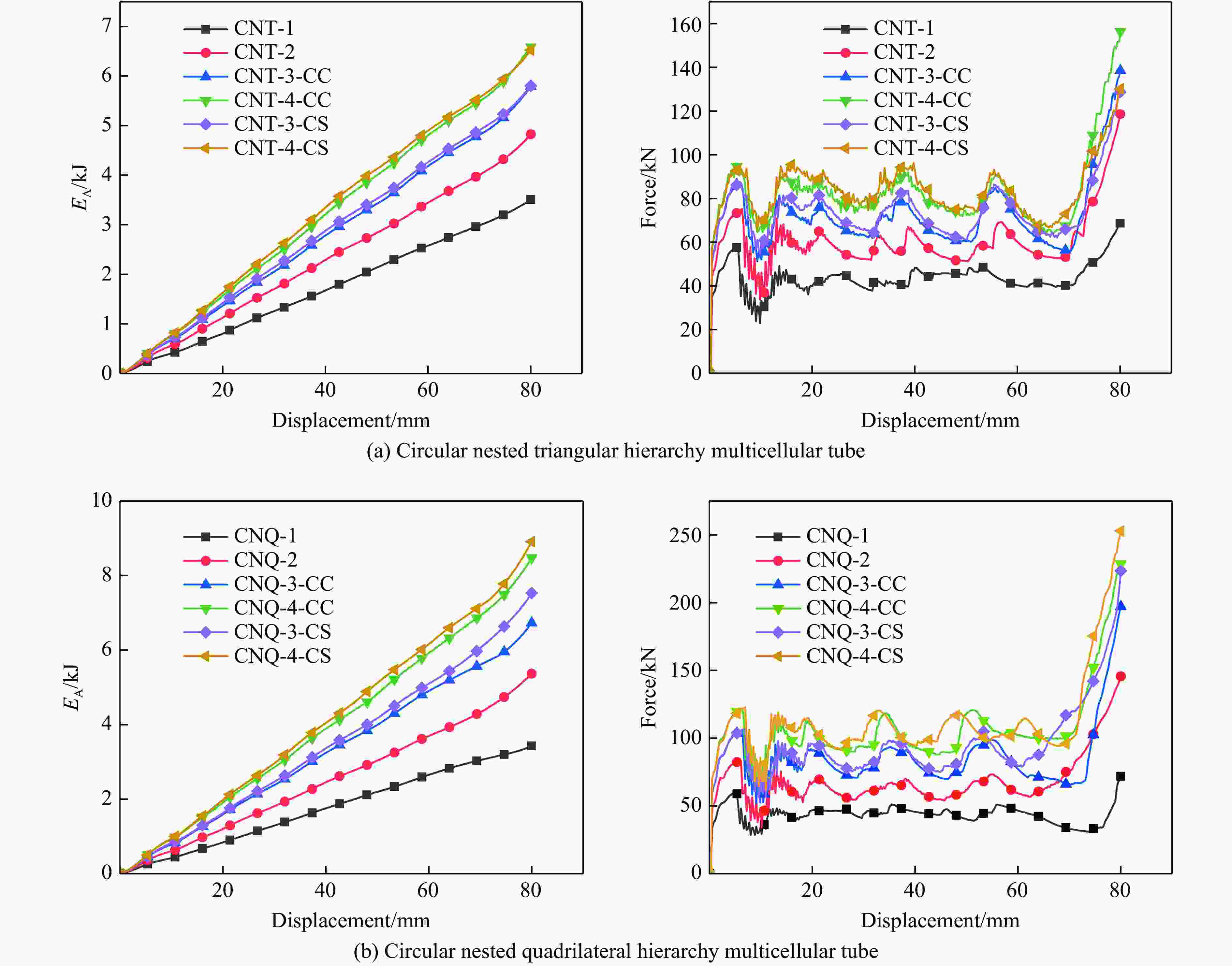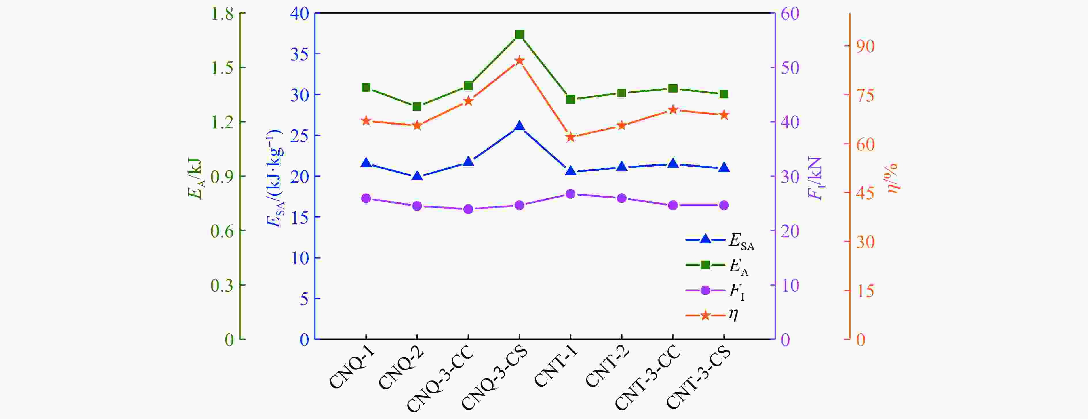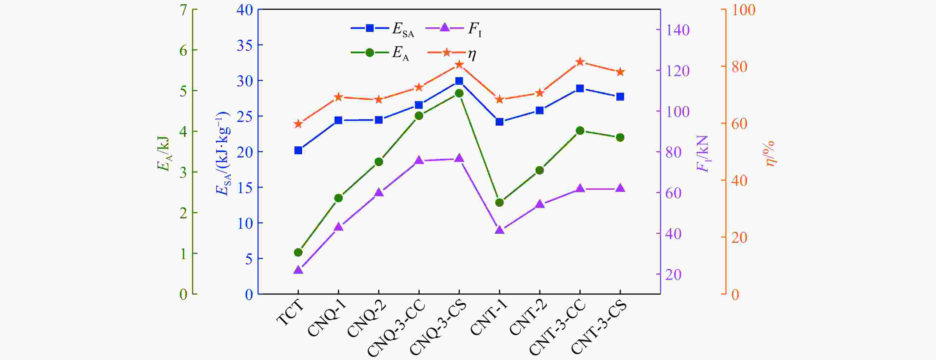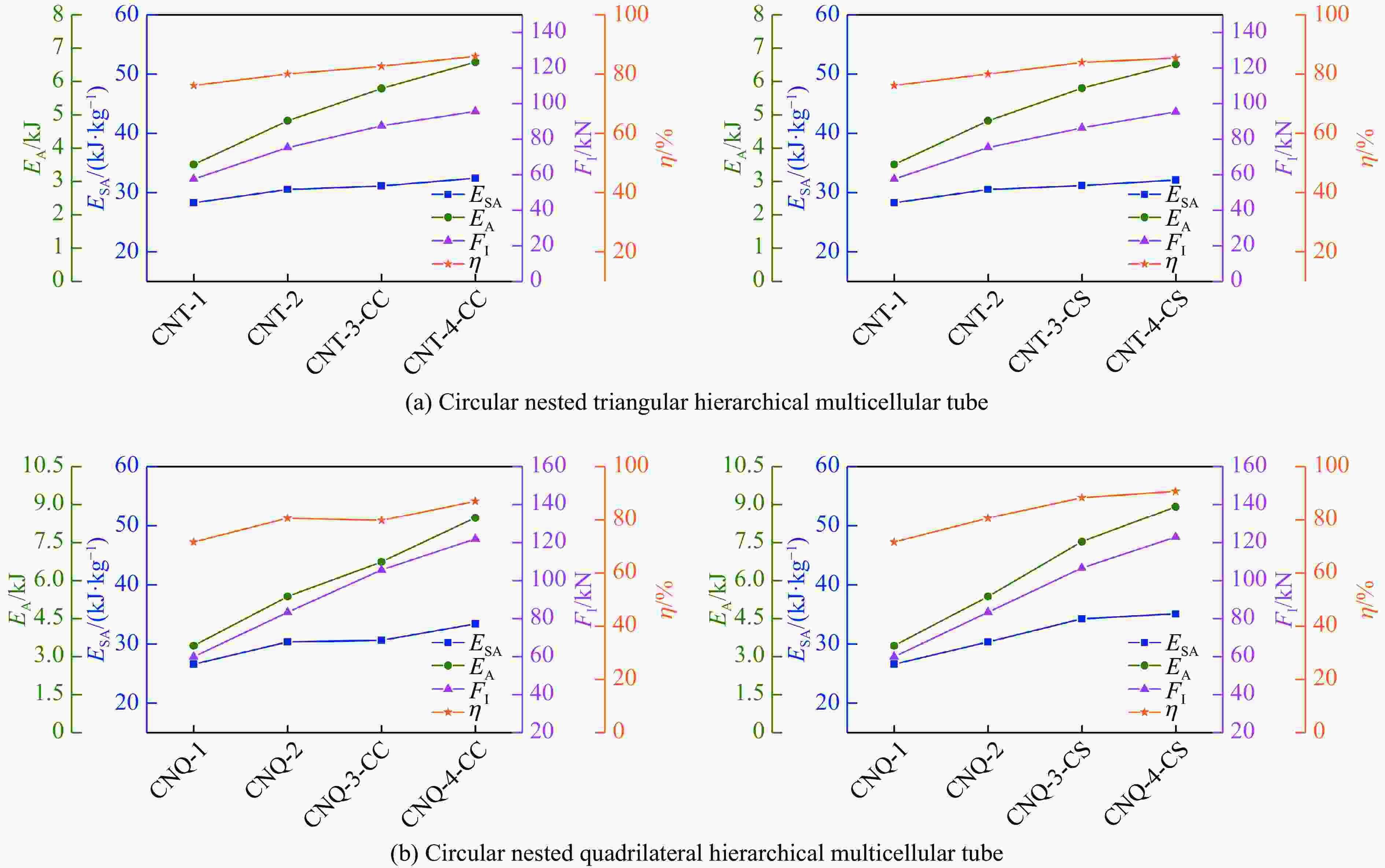 Multicellular tubes h/mm m/kg EA/J ESA/(kJ·kg–1) FI/kN η/% TCT 1.50 0.051 1027.32 20.18 21.50 59.72 CNT-1 1.50 0.093 2248.11 24.17 41.15 68.28 CNT-2 1.50 0.118 3043.65 25.79 53.92 70.55 CNT-3-CC 1.50 0.139 4015.88 28.89 61.60 81.49 CNT-3-CS 1.50 0.139 3850.71 27.70 61.78 77.92 CNQ-1 1.50 0.097 2360.63 24.41 42.69 69.12 CNQ-2 1.50 0.133 3251.87 24.45 59.57 68.24 CNQ-3-CC 1.50 0.165 4382.77 26.56 75.50 72.56 CNQ-3-CS 1.50 0.165 4933.74 29.90 76.56 80.56 表 2 相同质量条件下的耐撞性对比