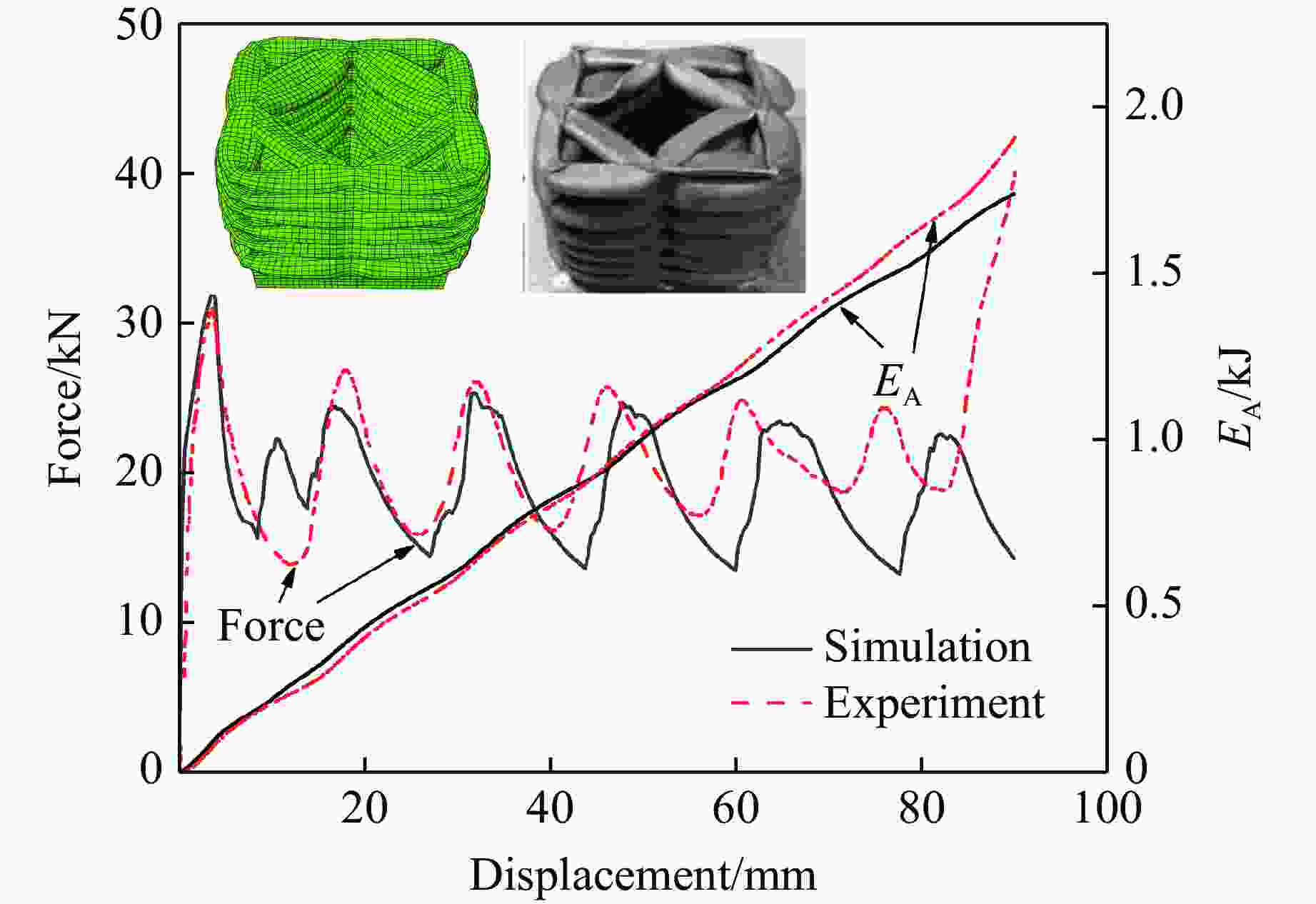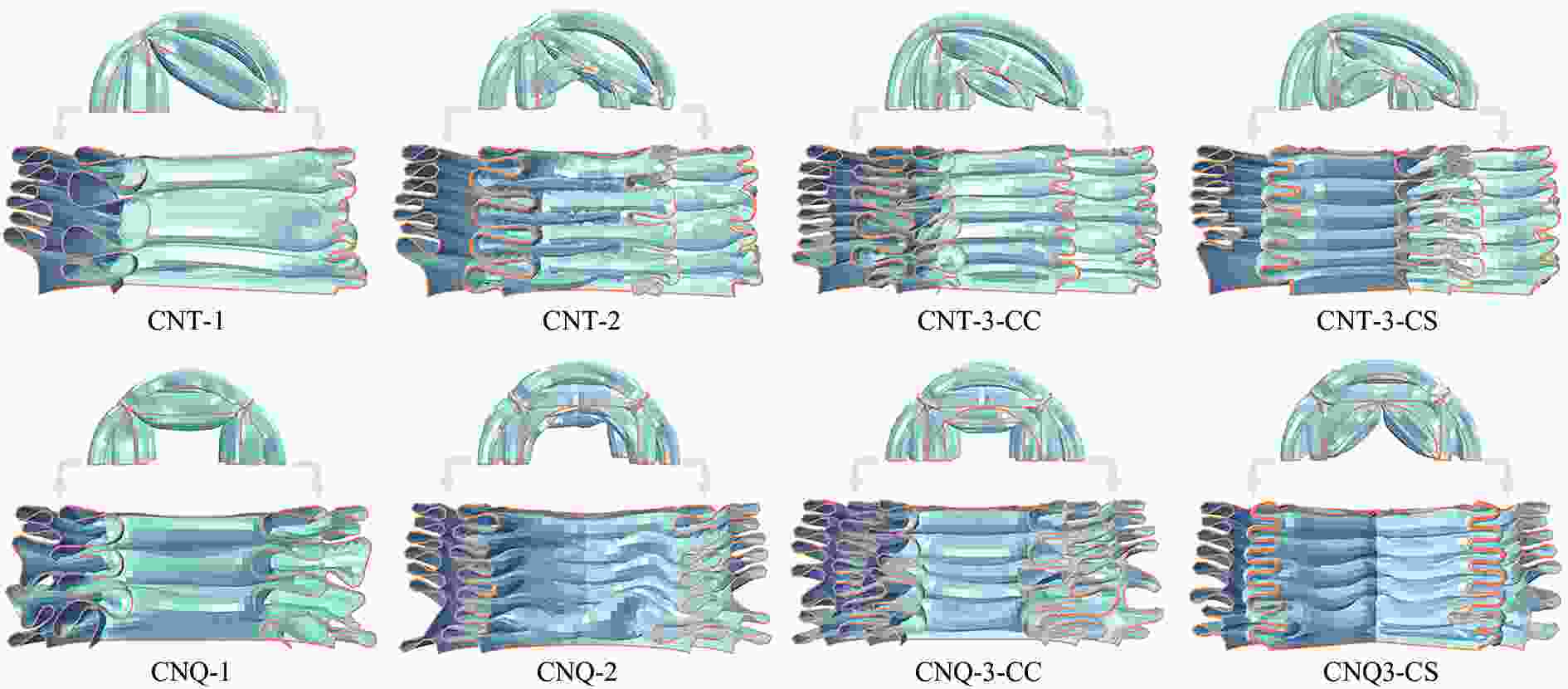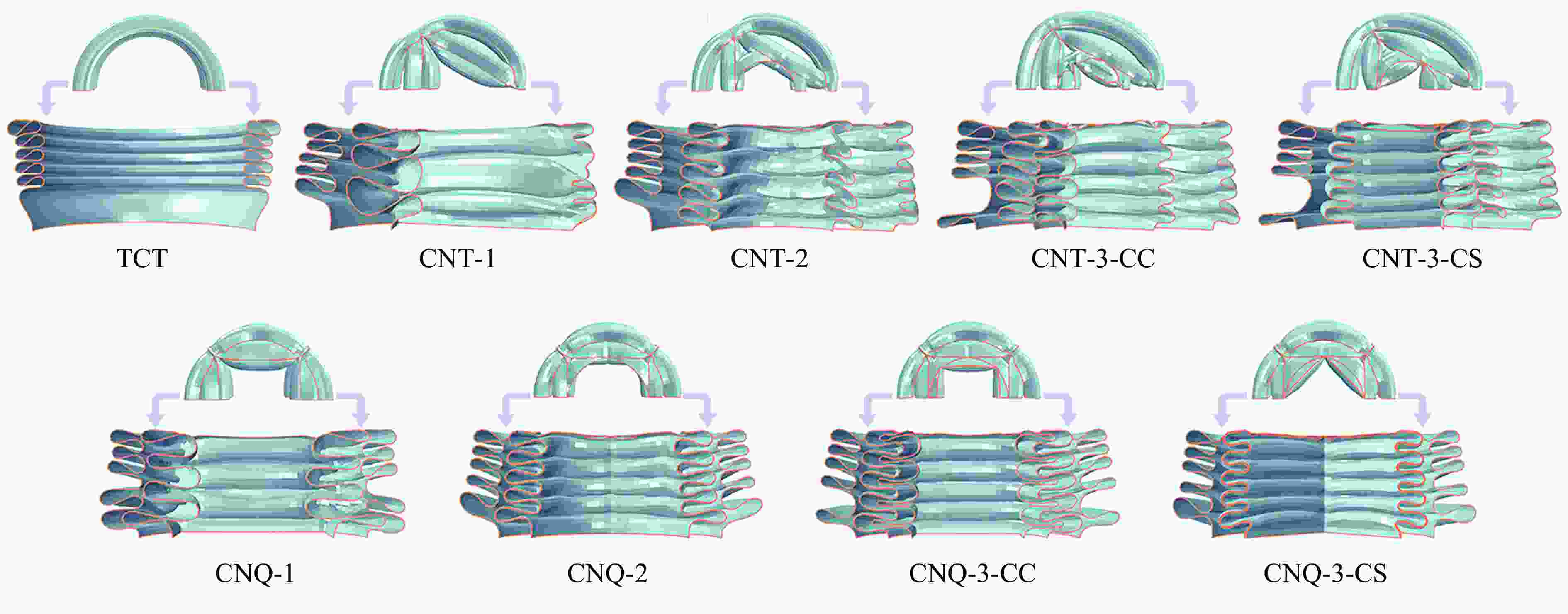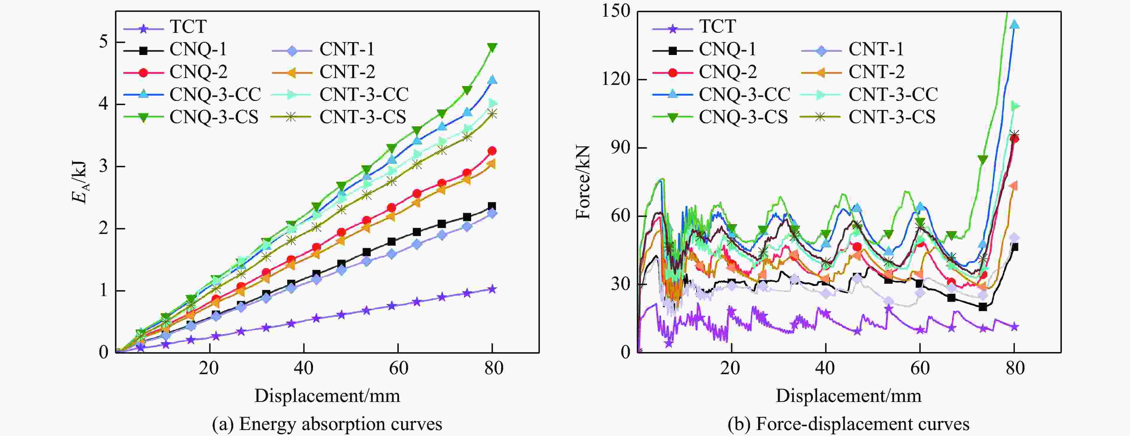 Multicellular tubes h/mm m/kg EA/J ESA/(kJ·kg–1) FI/kN η/% TCT 1.50 0.051 1027.32 20.18 21.50 59.72 CNT-1 1.50 0.093 2248.11 24.17 41.15 68.28 CNT-2 1.50 0.118 3043.65 25.79 53.92 70.55 CNT-3-CC 1.50 0.139 4015.88 28.89 61.60 81.49 CNT-3-CS 1.50 0.139 3850.71 27.70 61.78 77.92 CNQ-1 1.50 0.097 2360.63 24.41 42.69 69.12 CNQ-2 1.50 0.133 3251.87 24.45 59.57 68.24 CNQ-3-CC 1.50 0.165 4382.77 26.56 75.50 72.56 CNQ-3-CS 1.50 0.165 4933.74 29.90 76.56 80.56 表 2 相同质量条件下的耐撞性对比