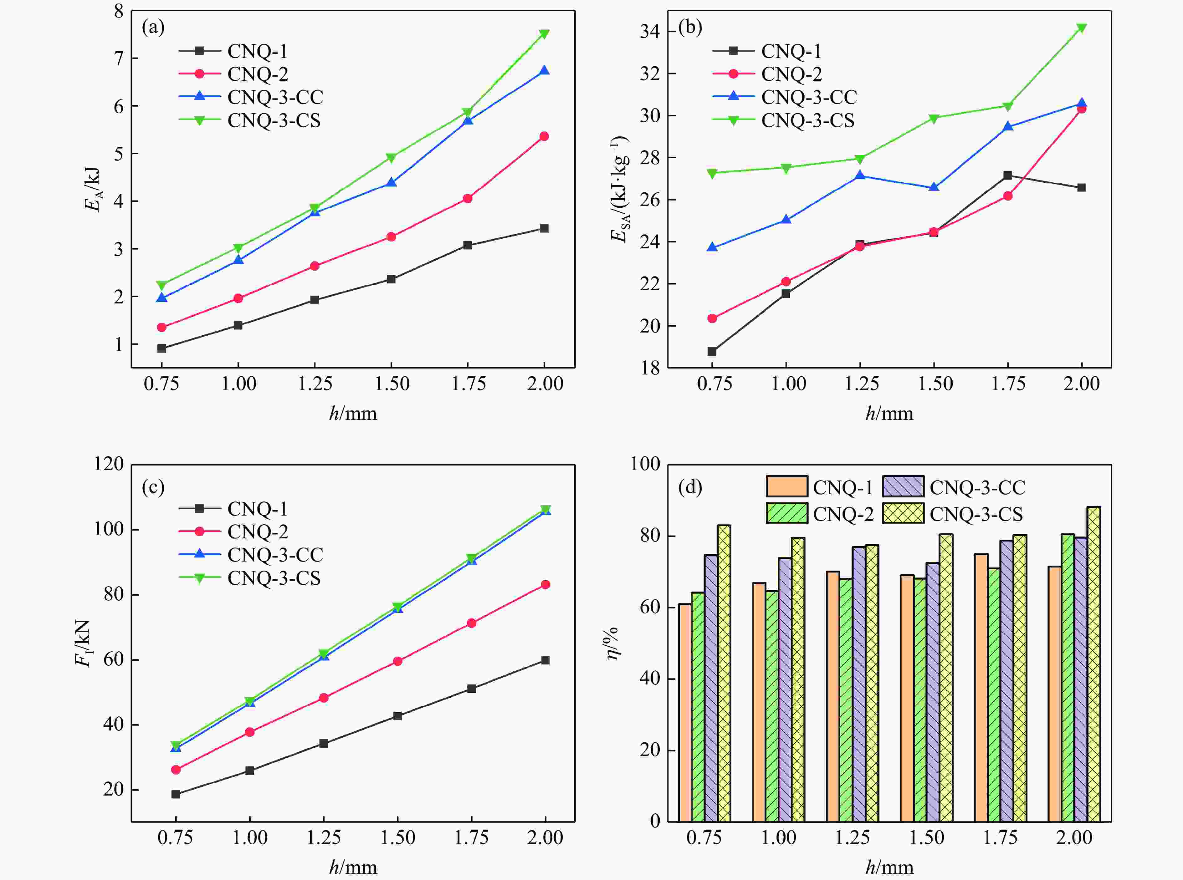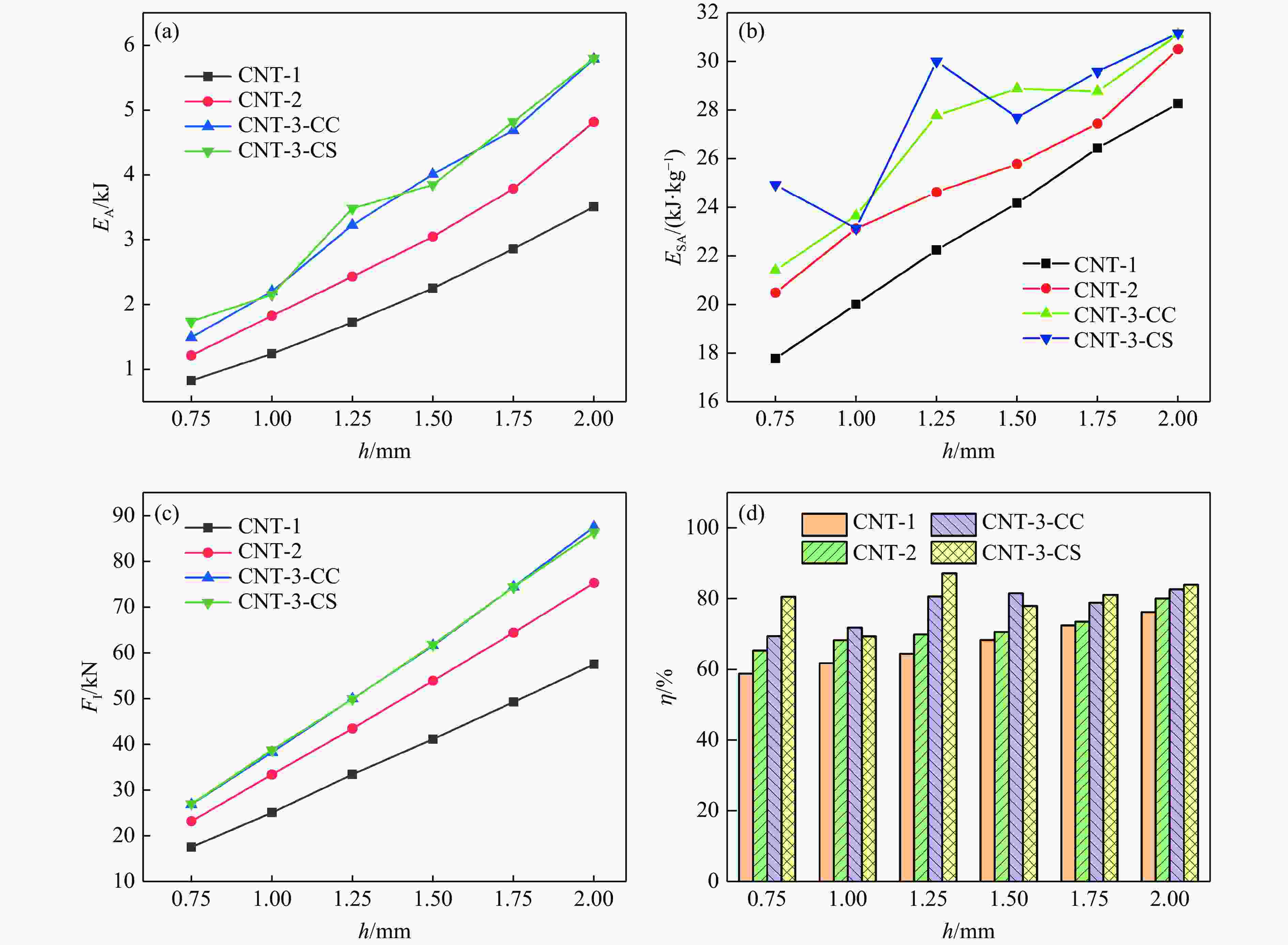 Multicellular tubes h/mm m/kg EA/J ESA/(kJ·kg–1) FI/kN η/% CNT-1 2.00 0.124 3505.95 28.27 57.54 76.17 CNT-2 2.00 0.158 4820.93 30.51 75.30 80.03 CNT-3-CC 2.00 0.186 5787.84 31.12 87.54 82.65 CNT-4-CC 2.00 0.203 6582.24 32.42 95.66 86.01 CNT-3-CS 2.00 0.186 5797.15 31.17 86.35 83.92 CNT-4-CS 2.00 0.203 6520.47 32.12 95.41 85.43 CNQ-1 2.00 0.129 3427.02 26.57 59.88 71.54 CNQ-2 2.00 0.177 5366.16 30.32 83.24 80.58 CNQ-3-CC 2.00 0.220 6730.04 30.59 105.55 79.71 CNQ-4-CC 2.00 0.254 8475.47 33.37 121.78 87.00 CNQ-3-CS 2.00 0.220 7528.57 34.22 106.56 88.31 CNQ-4-CS 2.00 0.254 8909.80 35.08 122.81 90.69 -