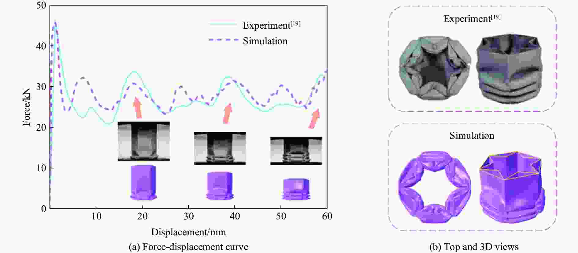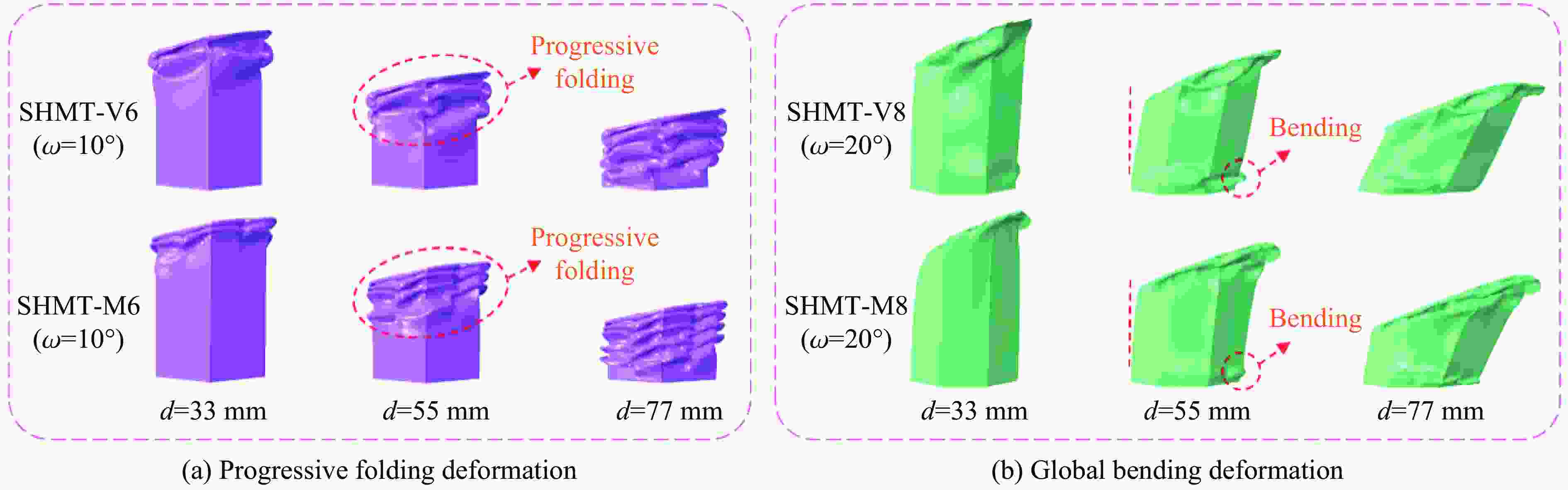 摘要: 基于混合截面的设计思路,针对星形混合多胞管(star-shaped hybrid multi-cell tube,SHMT)提出了10种截面设计方案。通过数值模拟的方式,深入分析了SHMT在多种冲击角度下的耐撞性。研究发现,混合截面的连接方式以及多边形边数均对星形混合多胞管的吸能性能产生重要影响。在轴向冲击下,采用顶点连接的SHMT(SHMT-V)对于多边形边数的变化较为敏感,八边形SHMT-V(SHMT-V8)的比吸能高达24.31 J/g,相比于四边形SHMT-V(SHMT-V4)提高了71.86%;采用中点连接的SHMT(SHMT-M)拥有更强的力学响应,其碰撞力性能比SHMT-V高30%以上。在斜向冲击下,SHMT的承载能力随着冲击角度的增加而减小,截面不同的SHMT的耐撞性能表现出较大的不确定性。采用优劣解距离法对SHMT的综合耐撞性进行了评估。结果表明,八边形SHMT-M(SHMT-M8)是最优的截面设计方案。研究成果可为薄壁结构的实际应用与耐撞性优化设计提供指导。Abstract: Based on the hybrid cross-section design, 10 kinds of cross-section design of star-shaped hybrid multi-cell tube (SHMT) were proposed. The crashworthiness of SHMT under multiple impact angles was studied by numerical simulation. It is found that the connection mode of hybrid cross-section and the number of polygonal edges N have important influences on the energy absorption of SHMT. Under axial impact, SHMT with vertex connection (SHMT-V) is more sensitive to N. The specific absorption energy of octagonal SHMT-V (SHMT-V8) reaches 24.31 J/g, which is 71.86% higher than that of quadrangular SHMT-V (SHMT-V4). SHMT with midpoint connection (SHMT-M) has stronger mechanical response, and its crushing force is more than 30% higher than that of SHMT-V. Under oblique impact, the load-carrying capacity of SHMT decreases with the increase of the impact angle, and the crashworthiness of SHMT shows great uncertainty. Technique for order preference by similarity to ideal solution method (TOPSIS) was used to evaluate the crashworthiness of SHMT. The results show that SHMT-M8 is the optimal cross-section design. The research results of this paper can provide guidance for practical application and crashworthiness optimization design of thin-walled structures.