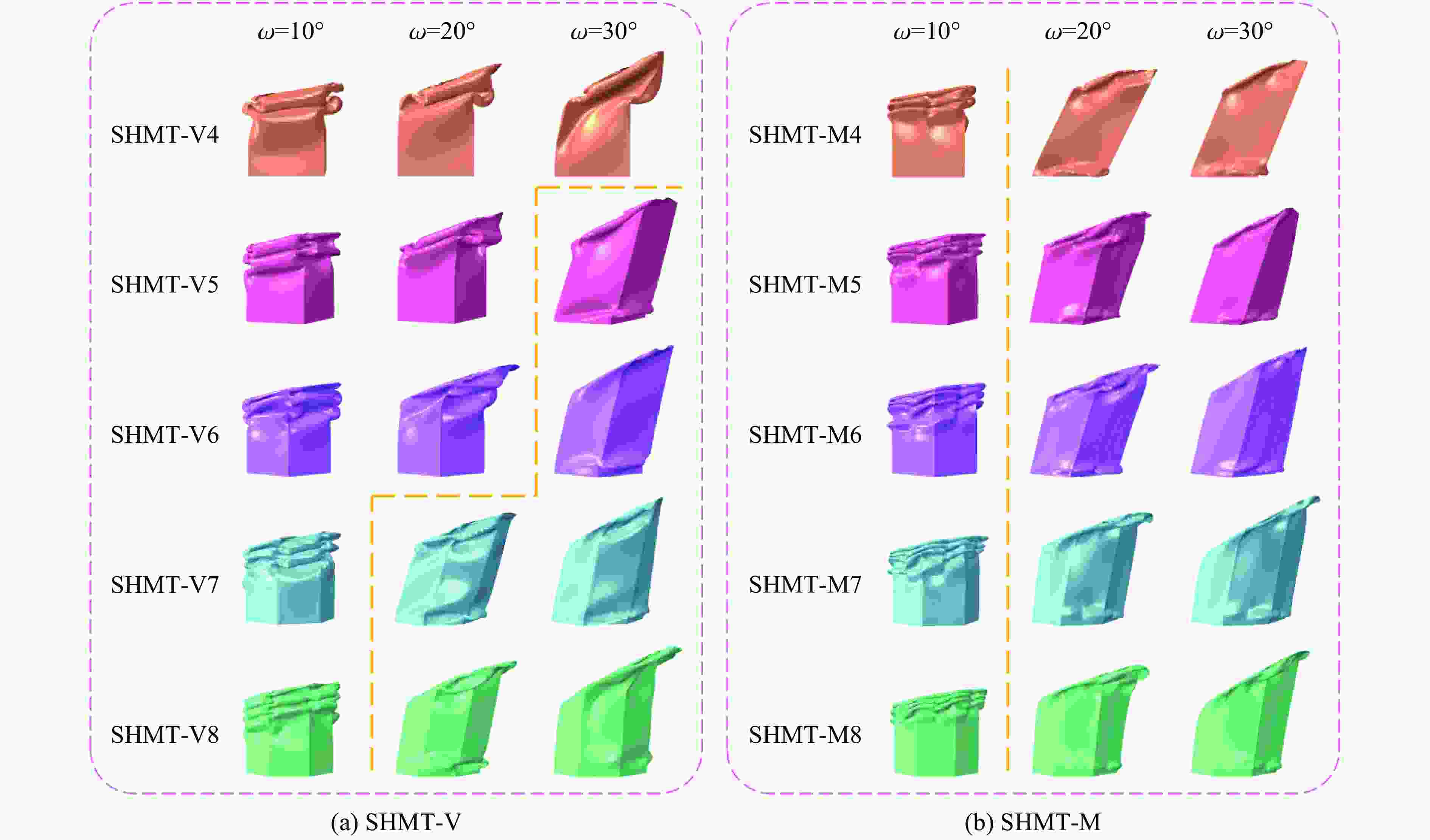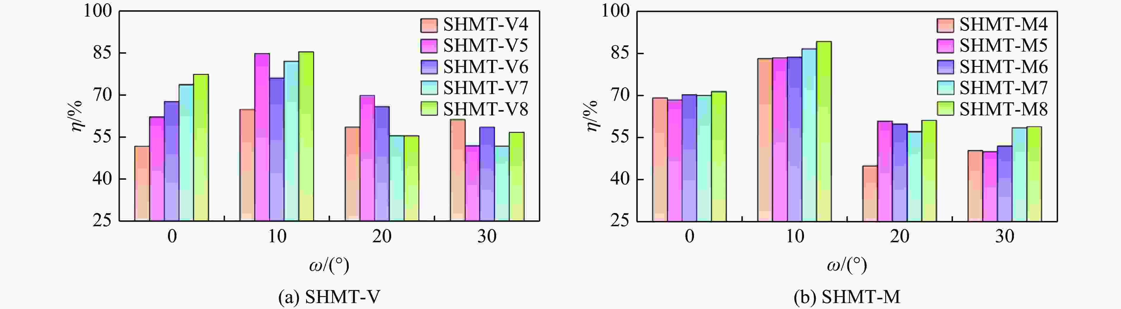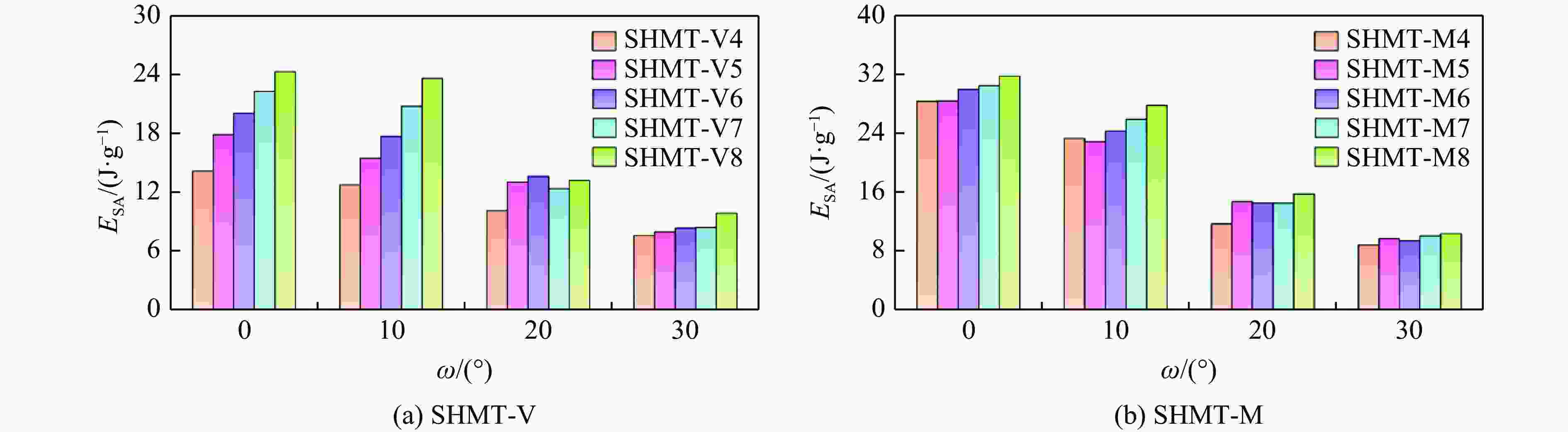 Specimens ${P}{_{\mathrm{p} } }$/kN $ \eta $/% ${E}{_{\mathrm{S}\mathrm{A} } }$/(J·g−1) ω=0° ω=10° ω=20° ω=30° ω=0° ω=10° ω=20° ω=30° ω=0° ω=10° ω=20° ω=30° SHMT-V4 47.07 33.69 29.58 21.20 51.82 64.91 58.62 61.32 14.14 12.71 10.07 7.55 SHMT-V5 49.46 31.36 31.99 26.21 62.18 84.83 69.89 51.94 17.88 15.44 12.99 7.90 SHMT-V6 50.99 40.00 35.53 24.38 67.73 76.10 65.92 58.58 20.05 17.67 13.59 8.28 SHMT-V7 52.01 43.64 38.32 27.70 73.71 82.07 55.51 51.85 22.27 20.77 12.35 8.36 SHMT-V8 54.08 47.61 40.89 29.82 77.44 85.44 55.52 56.75 24.31 23.63 13.18 9.82 SHMT-M4 70.56 48.26 44.72 29.78 69.20 83.21 44.99 50.41 28.33 23.29 11.65 8.72 SHMT-M5 71.45 47.08 41.52 33.13 68.43 83.46 60.83 50.03 28.39 22.83 14.68 9.62 SHMT-M6 73.30 50.00 41.66 30.83 70.26 83.70 59.88 52.06 29.94 24.29 14.49 9.32 SHMT-M7 74.90 51.42 43.56 29.39 70.05 86.65 57.17 58.48 30.45 25.89 14.45 9.98 SHMT-M8 76.61 53.53 44.22 30.10 71.45 89.23 61.17 58.92 31.76 27.75 15.70 10.30 表 3 TOPSIS方法得出的评估结果