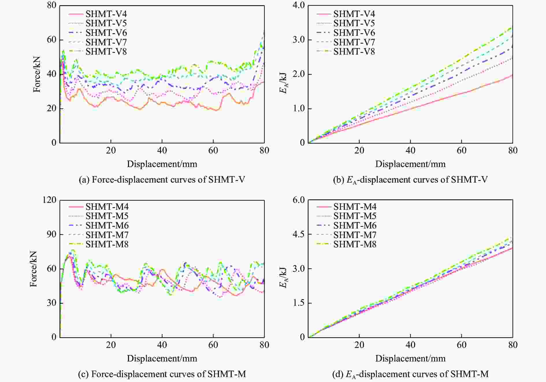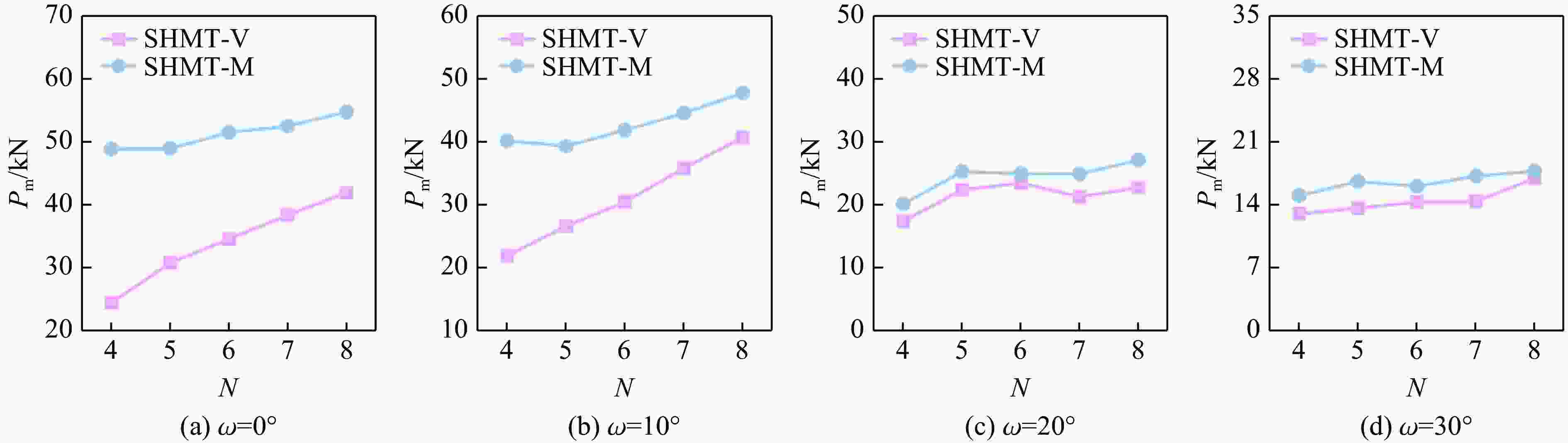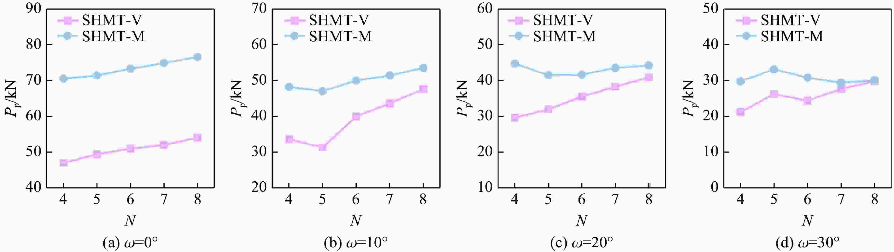 Specimens ${P}{_{\mathrm{p} } }$/kN $ \eta $/% ${E}{_{\mathrm{S}\mathrm{A} } }$/(J·g−1) ω=0° ω=10° ω=20° ω=30° ω=0° ω=10° ω=20° ω=30° ω=0° ω=10° ω=20° ω=30° SHMT-V4 47.07 33.69 29.58 21.20 51.82 64.91 58.62 61.32 14.14 12.71 10.07 7.55 SHMT-V5 49.46 31.36 31.99 26.21 62.18 84.83 69.89 51.94 17.88 15.44 12.99 7.90 SHMT-V6 50.99 40.00 35.53 24.38 67.73 76.10 65.92 58.58 20.05 17.67 13.59 8.28 SHMT-V7 52.01 43.64 38.32 27.70 73.71 82.07 55.51 51.85 22.27 20.77 12.35 8.36 SHMT-V8 54.08 47.61 40.89 29.82 77.44 85.44 55.52 56.75 24.31 23.63 13.18 9.82 SHMT-M4 70.56 48.26 44.72 29.78 69.20 83.21 44.99 50.41 28.33 23.29 11.65 8.72 SHMT-M5 71.45 47.08 41.52 33.13 68.43 83.46 60.83 50.03 28.39 22.83 14.68 9.62 SHMT-M6 73.30 50.00 41.66 30.83 70.26 83.70 59.88 52.06 29.94 24.29 14.49 9.32 SHMT-M7 74.90 51.42 43.56 29.39 70.05 86.65 57.17 58.48 30.45 25.89 14.45 9.98 SHMT-M8 76.61 53.53 44.22 30.10 71.45 89.23 61.17 58.92 31.76 27.75 15.70 10.30 表 3 TOPSIS方法得出的评估结果