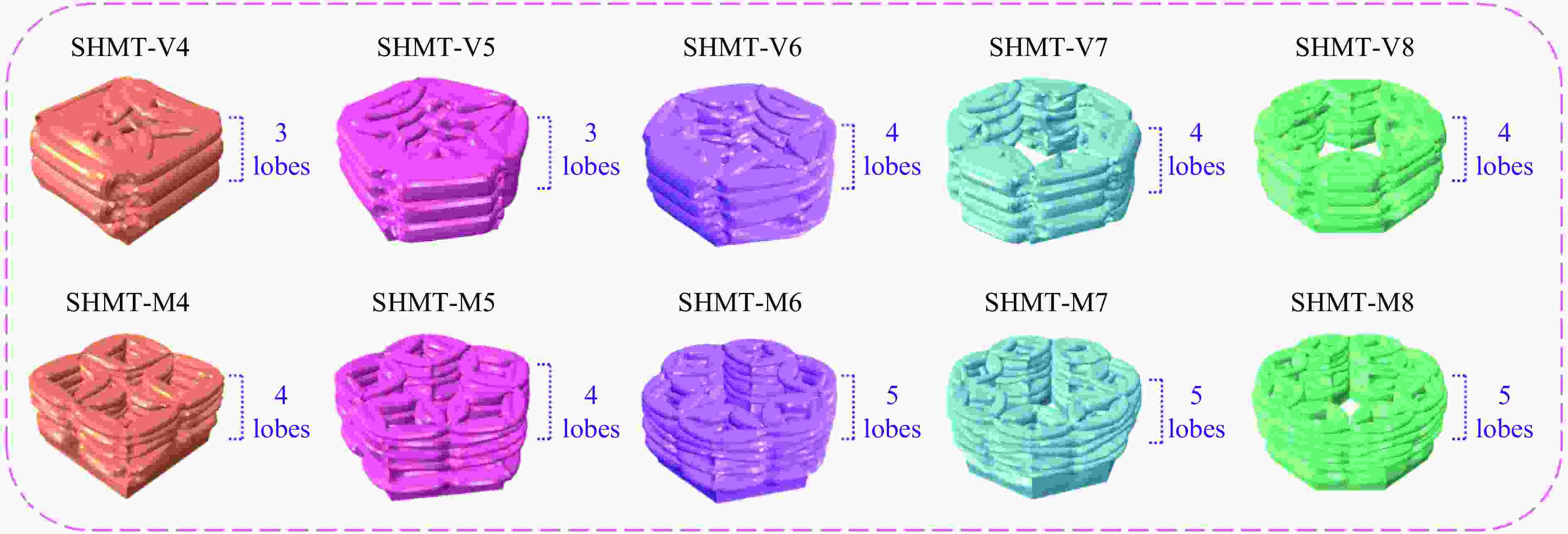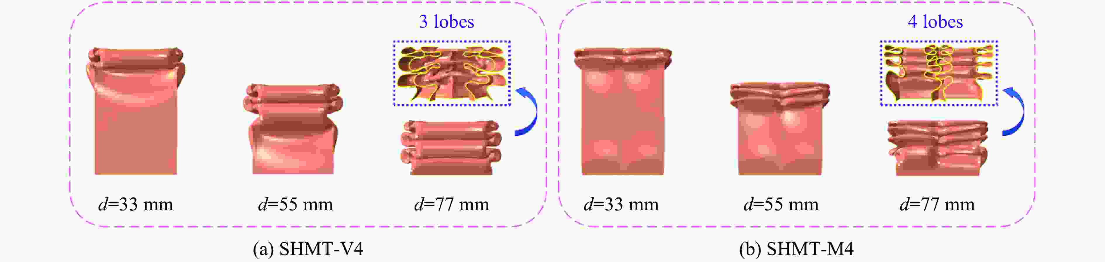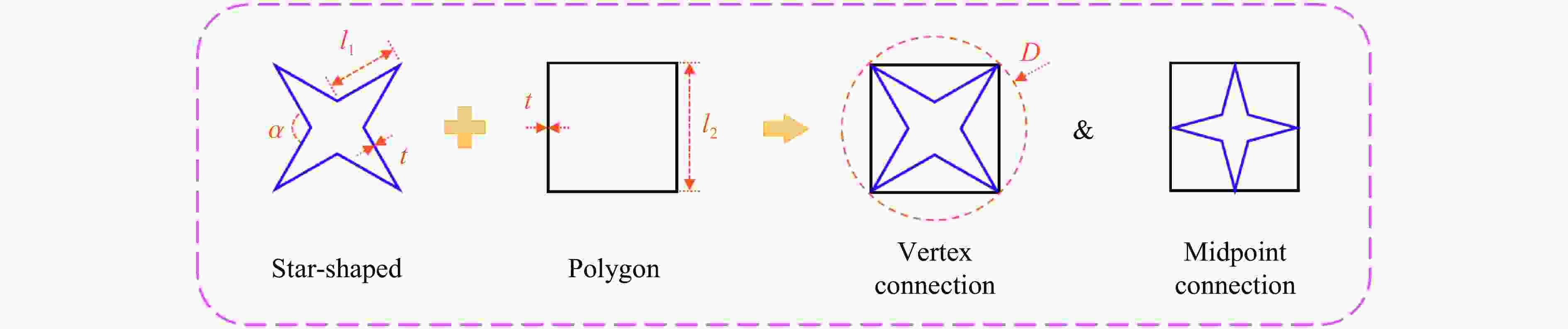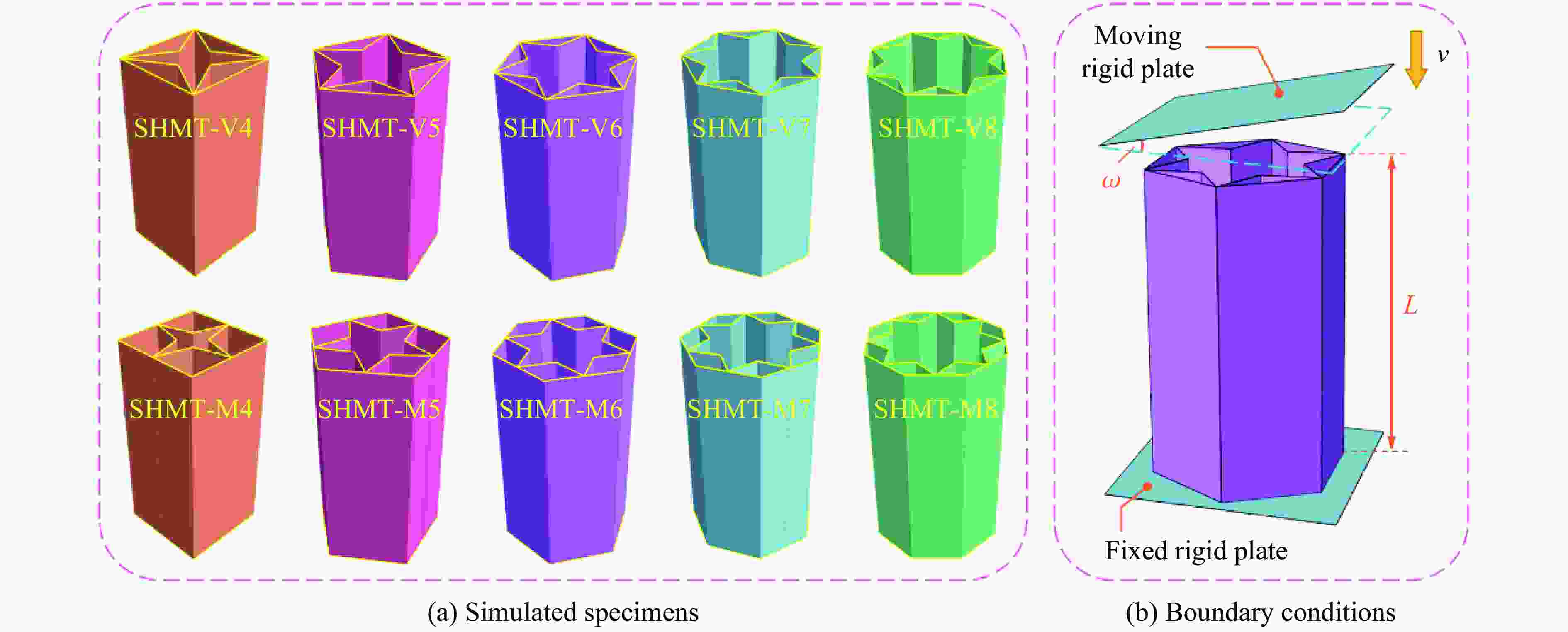 Specimens $ {l}_{1} $/mm $ {l}_{2} $/mm $ t $/mm Specimens $ {l}_{1} $/mm $ {l}_{2} $/mm $ t $/mm SHMT-V4 28.28 48.99 1.06 SHMT-M4 20.00 48.99 1.26 SHMT-V5 23.51 40.72 1.02 SHMT-M5 19.02 40.72 1.14 SHMT-V6 20.00 34.64 1.00 SHMT-M6 17.32 34.64 1.08 SHMT-V7 17.36 30.06 0.99 SHMT-M7 15.64 30.06 1.04 SHMT-V8 15.31 26.51 0.98 SHMT-M8 14.14 26.51 1.02 表 2 星形混合多胞管的数值矩阵