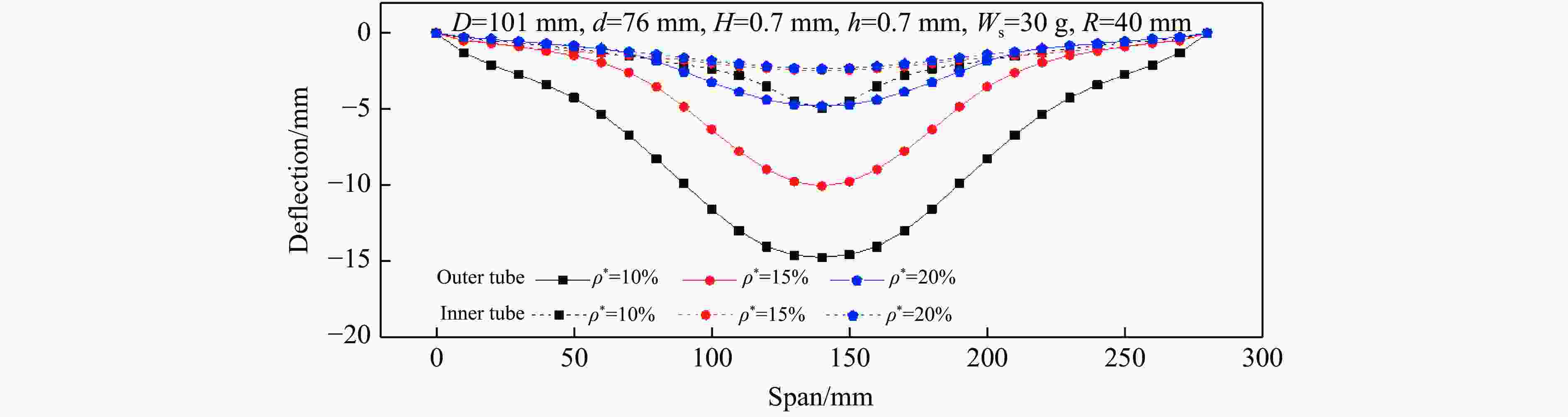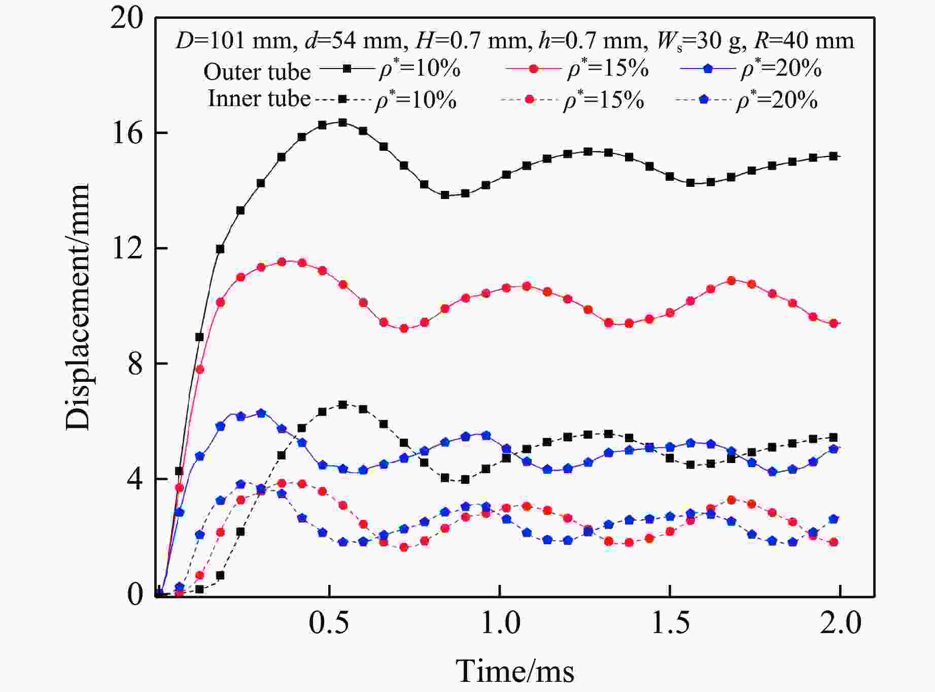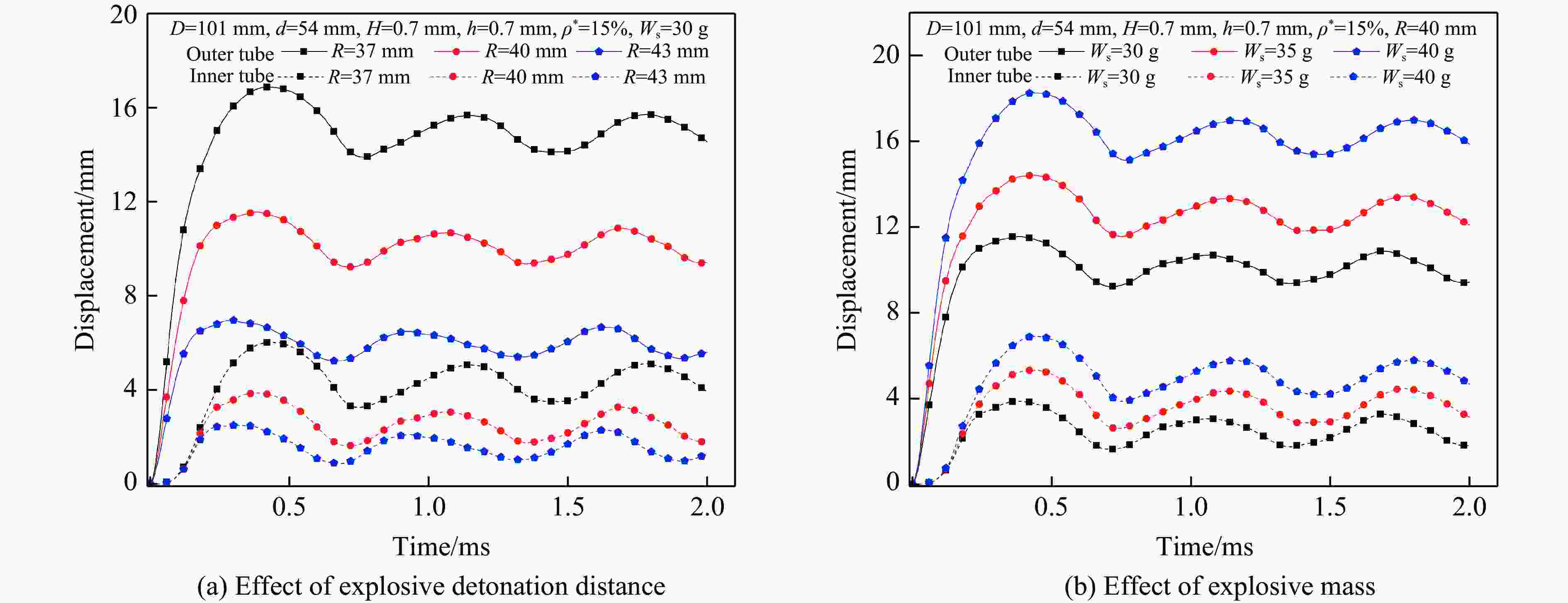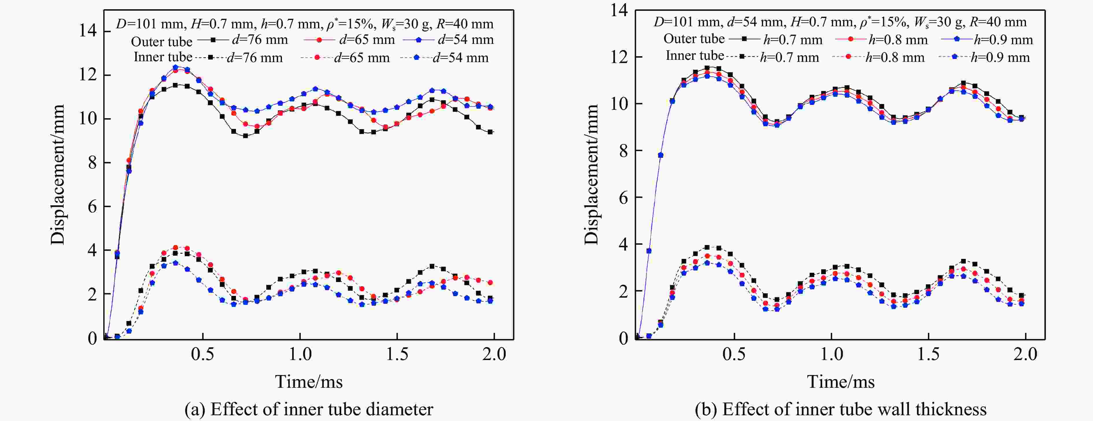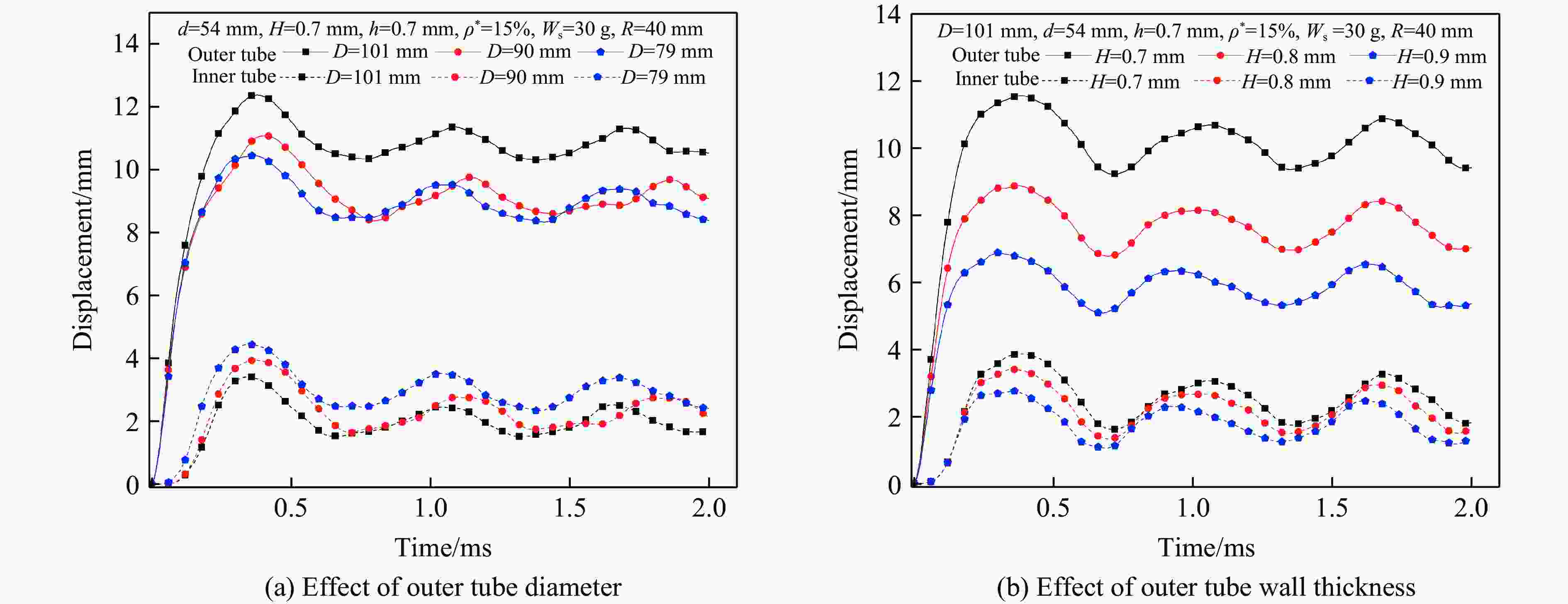 Test piece D/mm d/mm H/mm h/mm L/mm m/g NS01 101 76 0.7 0.7 280 1 242.62 NS02 101 65 0.7 0.7 280 1 326.02 NS03 101 54 0.7 0.7 280 1 388.13 NS04 90 54 0.7 0.7 280 1 150.28 NS05 79 54 0.7 0.7 280 933.72 NS06 101 76 0.8 0.7 280 1 312.19 NS07 101 76 0.9 0.7 280 1 381.75 NS08 101 76 0.7 0.8 280 1 294.97 NS09 101 76 0.7 0.9 280 1 347.31 表 4 外管直径和壁厚的影响