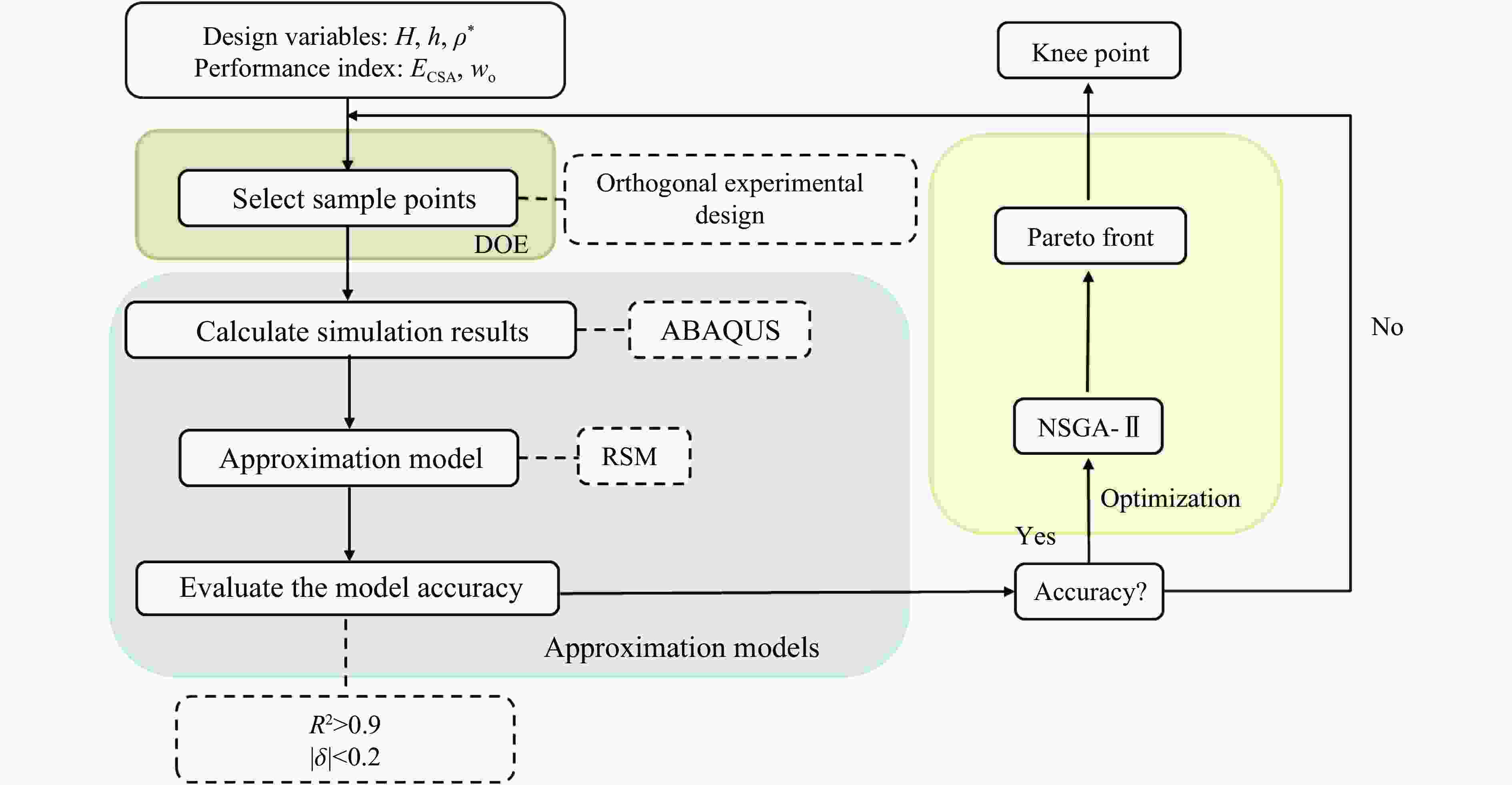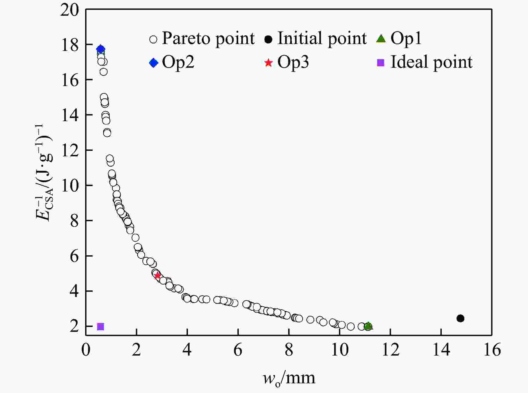 Test piece $\rho ^* $/% R/mm Ws/g p0/MPa Energy absorption percentage/% Outer tube Foam core Inner tube NS01 15 40 30 27.7 59.9 32.0 8.1 NS02 15 40 30 27.7 62.6 30.5 6.9 NS03 15 40 30 27.7 61.8 33.7 4.5 NS04 15 40 30 27.7 62.4 30.7 6.9 NS05 15 40 30 27.7 59.7 32.3 8.0 NS06 15 40 30 27.7 64.0 28.1 7.9 NS07 15 40 30 27.7 66.3 25.6 8.2 NS08 15 40 30 27.7 59.5 32.4 8.0 NS09 15 40 30 27.7 59.2 32.9 7.9 NS01 10 40 30 27.7 79.8 17.5 2.7 NS01 20 40 30 27.7 52.0 32.2 15.8 NS01 15 37 30 34.9 61.7 31.0 7.3 NS01 15 43 30 22.4 61.5 29.6 8.9 NS01 15 40 35 32.3 62.0 30.5 7.5 NS01 15 40 40 36.8 61.5 31.2 7.3 表 9 最佳设计点