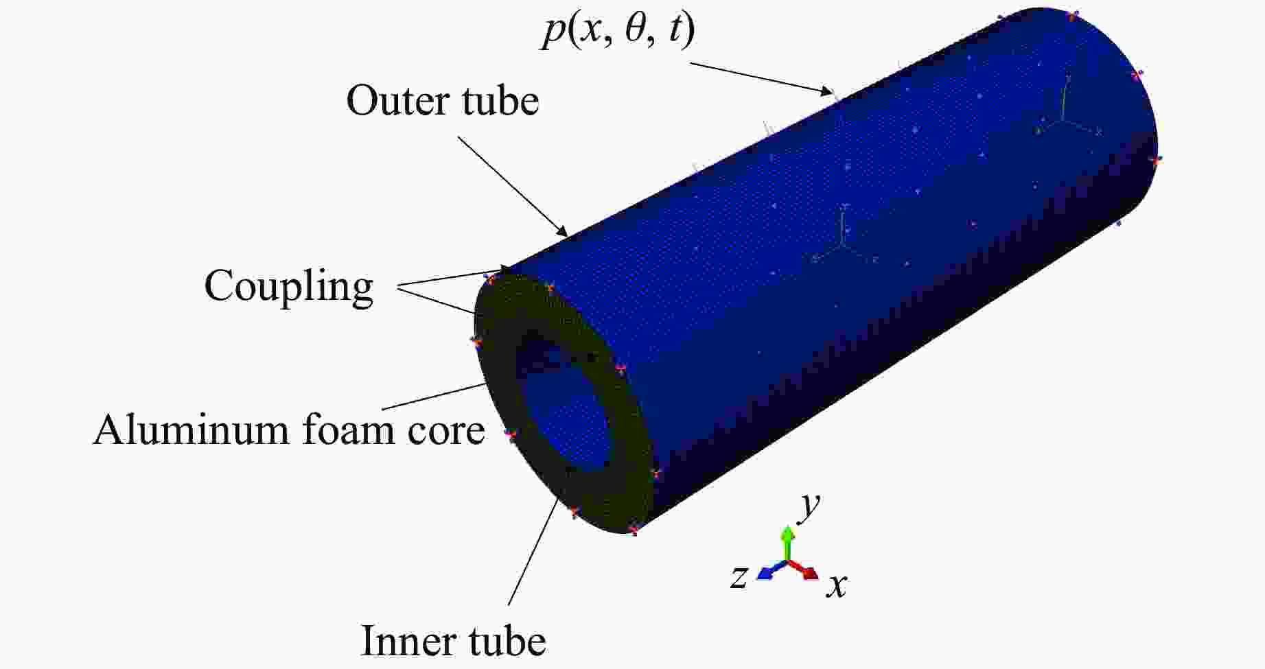 摘要: 基于动力显式有限元法,研究了泡沫铝夹芯管在横向爆炸载荷下的动态响应,以芯层能量吸收及外管刚度为目标,对结构的抗爆性能进行了多目标优化设计。系统研究了泡沫铝夹芯管结构的几何参数、泡沫铝芯层相对密度和爆炸加载条件等对其变形规律和能量吸收性能的影响。结果表明:横向爆炸载荷下,泡沫铝夹芯管的变形区域集中在跨中位置,内外管通过跨中位置塑性变形和变形区域左右两端的弯曲变形吸收能量,泡沫铝芯层主要依靠芯层压缩吸收能量;减小外管壁厚或泡沫铝芯层相对密度能有效提高结构的比吸能,但会影响泡沫铝夹芯管内外管的变形程度;外管几何参数对结构吸能性能和内外管变形的影响程度远大于内管;基于泡沫铝夹芯管的数值模拟结果,构造了响应面模型并对其进行了多目标优化,给出了Pareto前沿图,可根据实际工程应用来确定泡沫铝夹芯管结构中内外管的壁厚与芯层的相对密度。Abstract: The dynamic response of aluminum foam-filled sandwich tubes subjected to lateral blast loading was investigated numerically using the dynamic explicit finite element method. Based on numerical simulation, the structural blast resistance was optimized with the core energy absorption and outer tube stiffness as the optimization objectives. The effects of structural geometric parameters, the relative density of the aluminum foam core layer, and blast loading conditions on the deformation patterns and energy absorption properties of aluminum foam-filled sandwich tube have been systematically investigated. The study results indicate that the deformation region of the aluminum foam-filled sandwich tube under lateral blast loading is mainly concentrated in the middle span. Energy absorption occurs through plastic deformation in the middle of the span and bending deformation at the left and right ends of the deformed region for both the inner and outer tubes. In contrast, the energy absorption of the aluminum foam core layer relies primarily on core compression. Reducing of the thickness of the outer tube or the relative density of the aluminum foam core layer can effectively improve the specific energy absorption of the structure and increase the deformation of the inner and outer tubes. The effect of the geometry parameters of the outer tube on the energy absorption properties of the structure and the deformation of the inner and outer tubes is much larger than that of the inner tube. A response surface model is constructed based on the numerical simulation results of aluminum foam-filled sandwich tube. Subsequently, multi-objective optimization is performed and the resulting Pareto front graph is provided. The determination of the wall thickness of the inner and outer tubes, together with the relative density of the aluminum foam core layers in the aluminum foam-filled sandwich tube, can be based on the specific engineering application requirements.