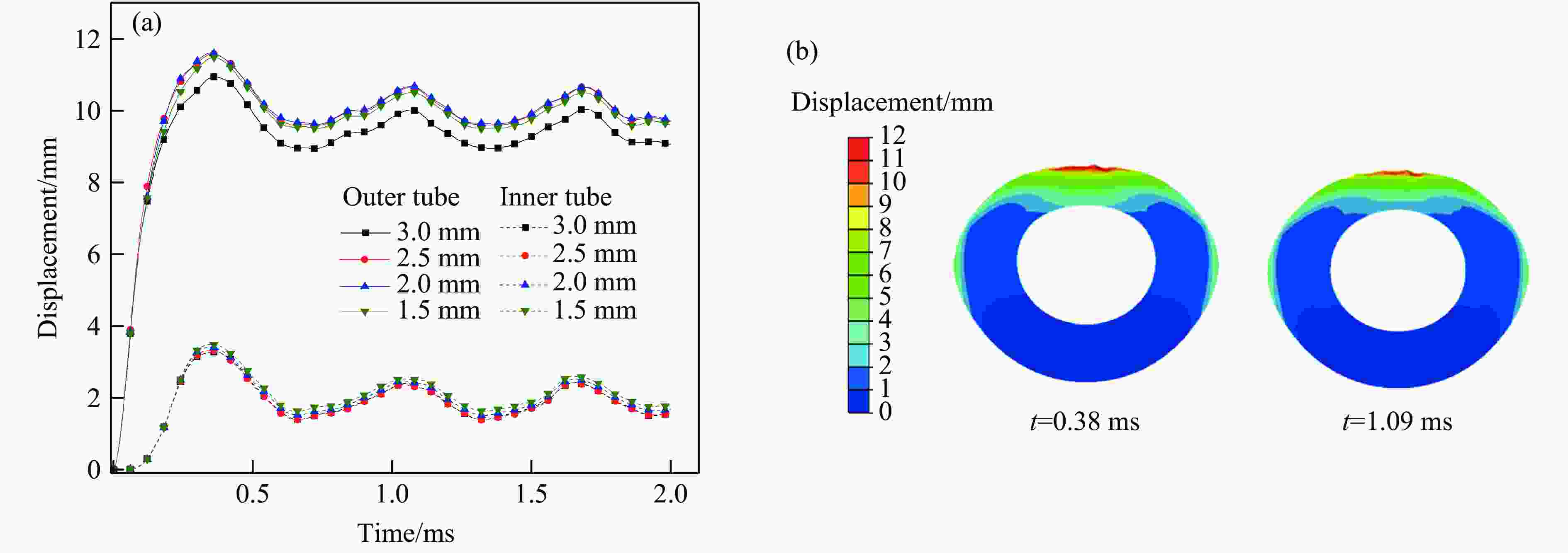 Test piece Et/J m/g Ea/(J·g−1) wo/mm wi/mm NS03 539.878 1 388.13 0.389 10.78 1.95 NS04 442.605 1 150.28 0.385 9.06 2.21 NS05 354.622 933.72 0.380 8.88 2.87 NS01 542.923 1 242.62 0.437 10.06 2.45 NS06 456.645 1 312.19 0.348 7.61 2.16 NS07 388.472 1 381.75 0.281 5.81 1.76 表 5 内管直径和壁厚的影响
